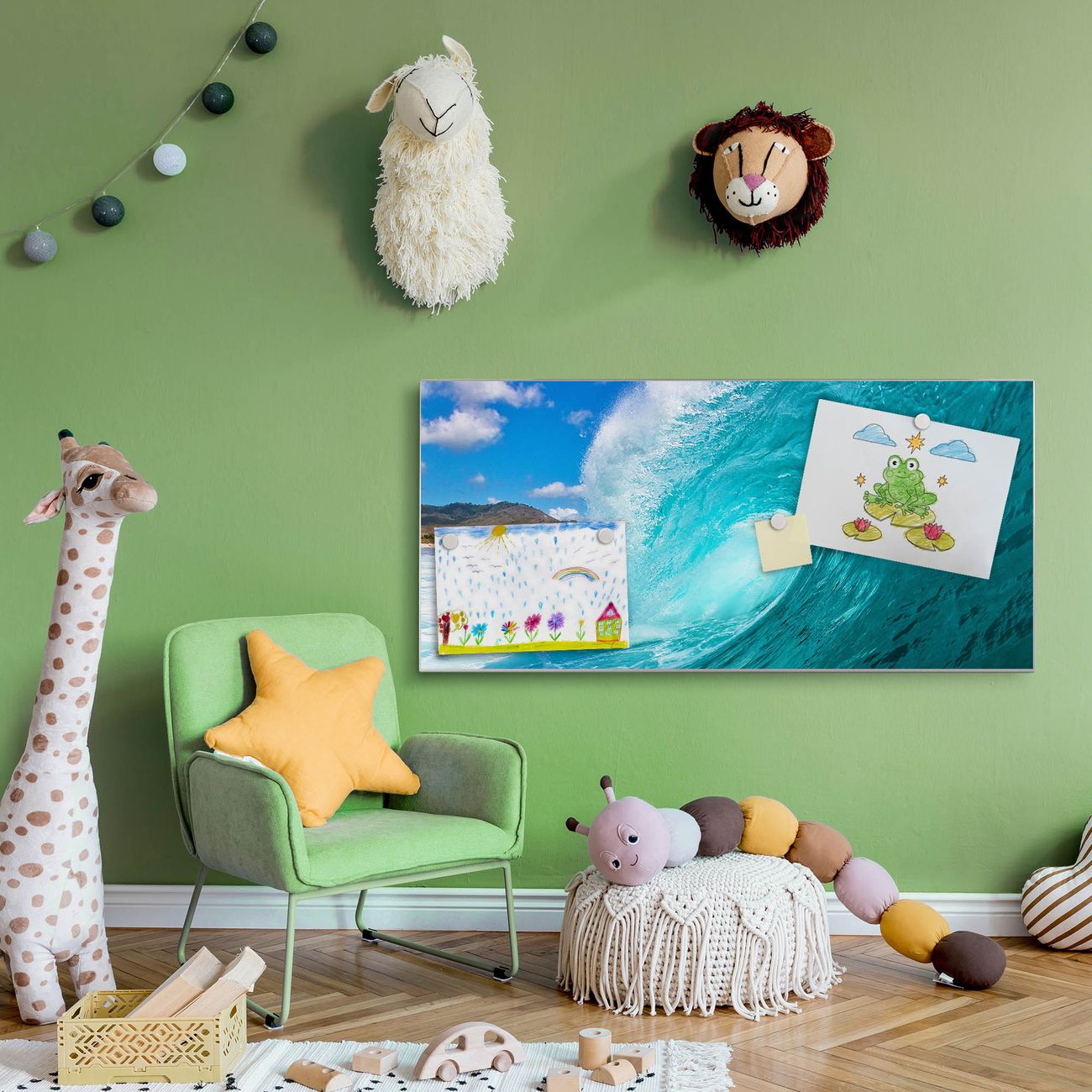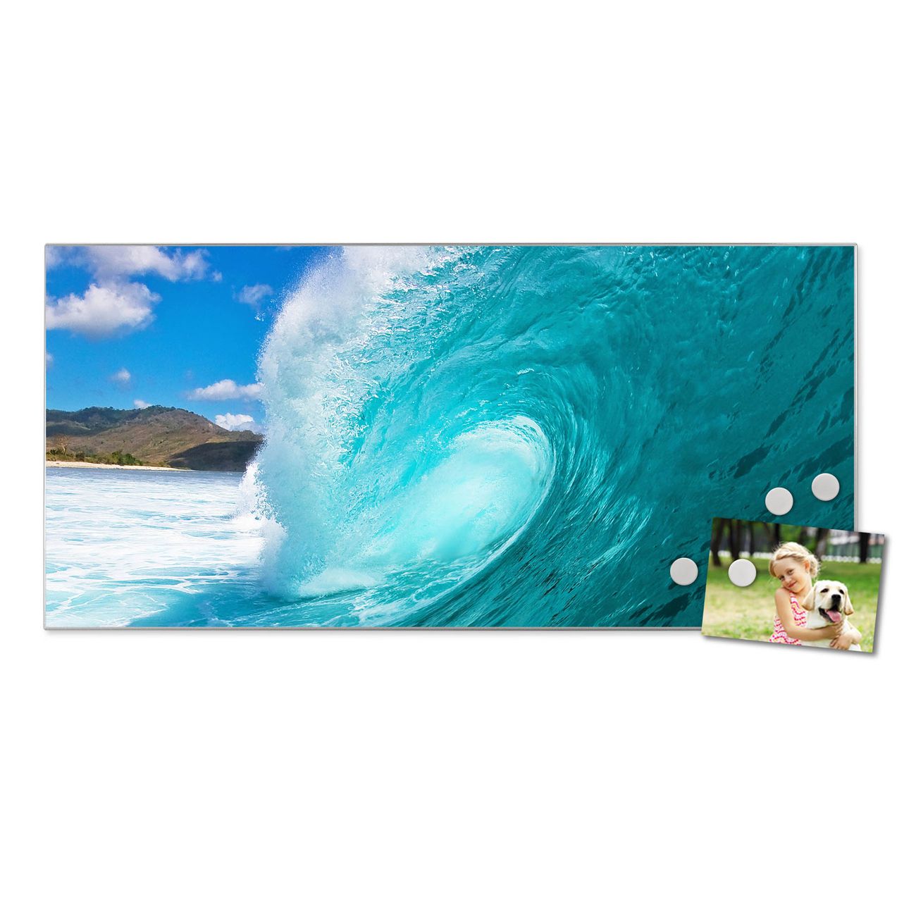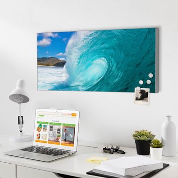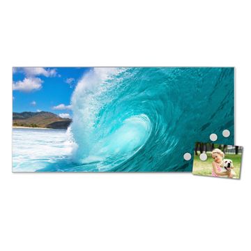 FUNKTION:  Die banjado Magnettafel mit Motiv Perfekte Welle Motiv bringt Ordnung in Ihr Zettelchaos. Fotos, Termine, Notizen oder Rezepte lassen Sich hier stilvoll mit Magneten ordnen, Sie behalten alles im Blick. An der Design Magnetwand halten alle handesüblichen Magnete. DESIGN:  Die Metall Pinnwand mit dem Motiv Motiv Perfekte Welle ist ein eleganter Begleiter im Alltag. Mit dieser Magnettafel haben Sie auch ohne Notizen und Magnete ein schönes Dekoelement. Das Format bietet Ihnen ausreichend Platz um alle wichtigen Informationen im Blick zu behalten. DETAILS: Die magnetische Pinnwand besteht aus silber-grau, weiß oder schwarz lackiertem Stahl. Sie hat eine Größe von 78cm x 37cm. Es befinden sich auf der Rückseite vorgefertigte Löcher die eine schnelle und unkomplizierte Anbringung ermöglichen. Das Motiv ist mit einem seidenmatten Laminat versehen und schützt so zusätzlich vor Kratzern. NUTZEN:  Sie können diese Magnettafel wunderbar als Wandbild nutzen, es halten alle handelsüblichen Magneten daran. Das Memoboard ist mit einem feuchten Lappen oder Schwamm abwischbar. Sie finden bei uns eine große Auswahl an passenden Magneten. BANJADO:  Wir sind ein kleines Team aus dem Herzen von Sachsen. Wir fertigen alle Artikel von Hand für Sie an, Sie erhalten keine preiswerte Importware. Auf Wunsch können Sie auch Ihr eigenes Foto auf die Magnettafel aufbringen, schreiben Sie uns an. Herzlichst, Ihr banjado-Team