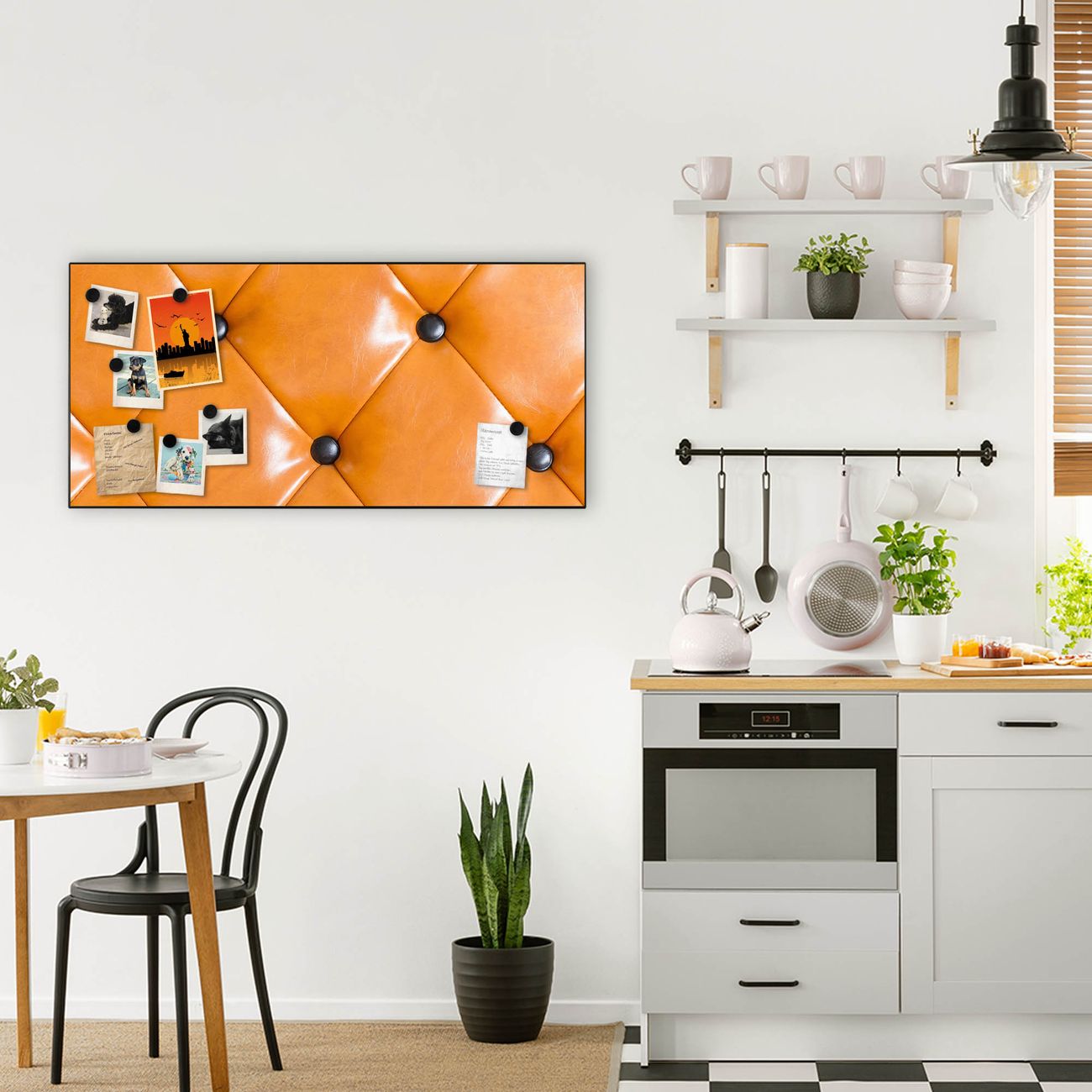 Motiv Polster Orange Nr. 11932 Größe: 78x37x2cm BxHxT Gewicht: ca. 2,10 kg Material: Stahlblech schwarz, Premiumfolie mit Schutzlaminat Magnete: für Dekomagnete geeignet beschreibbar: Nein Format: Querformat Zubehör: 4 Magnete, Schrauben und Dübel