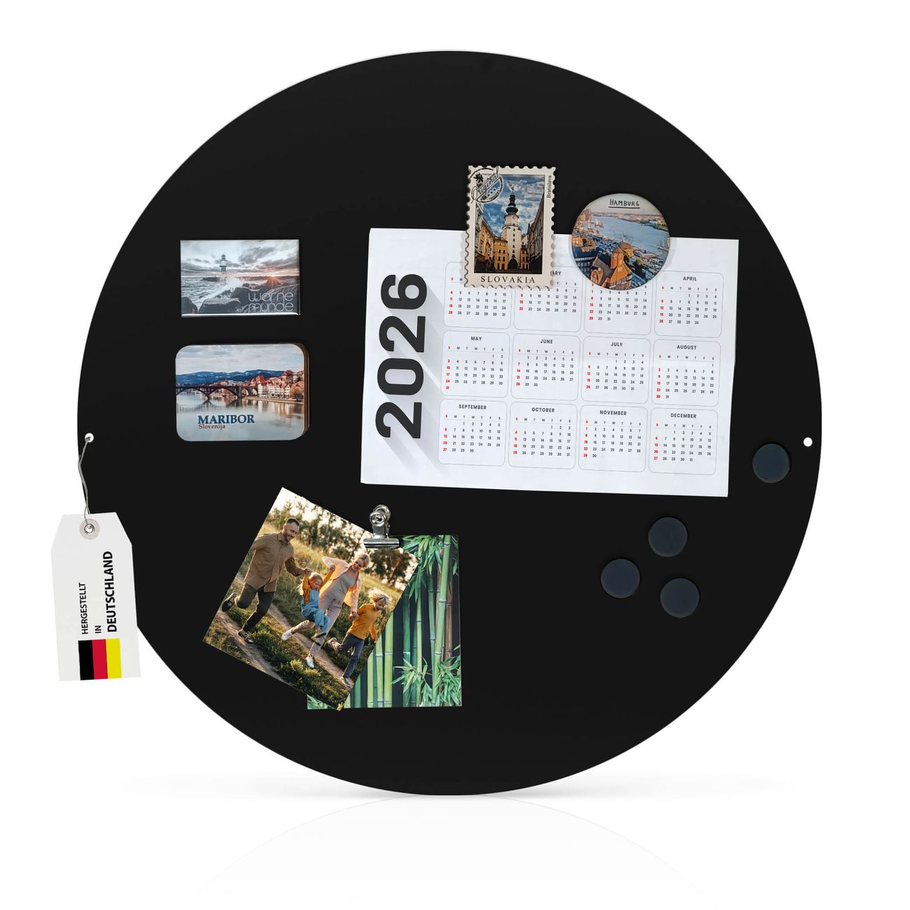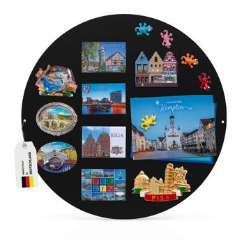 DETAILS:  Die magnetische Metall Pinnwand besteht aus schwarz lackiertem Stahl. Sie hat einen Durchmesser von 47cm. Es befinden sich an den Seiten zwei vorgefertigte Löcher die eine schnelle und unkomplizierte Anbringung ermöglichen. Das Motiv ist mit einem seidenmatten Laminat versehen und schützt so zusätzlich vor Kratzern.