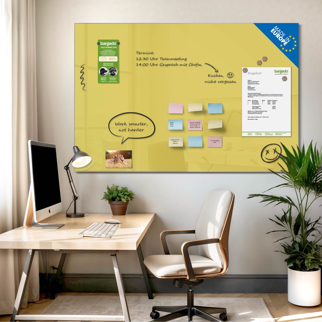 Die banjado Glas Magnettafel mit dem Motiv Farbe Lemon verbindet Funktionalität mit Stil. Sie ersetzt das Zettelchaos durch klare Strukturen und bringt dabei eine warme, natürliche Atmosphäre in Ihr Zuhause. Ob im Büro, in der Küche oder im Eingangsbereich - dieses Design-Board zieht Blicke an und sorgt für Ordnung mit Charakter.