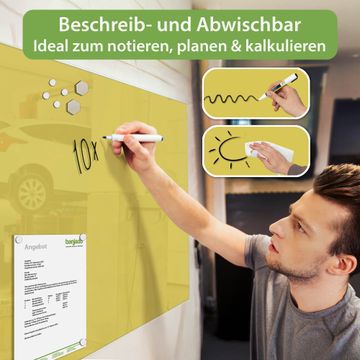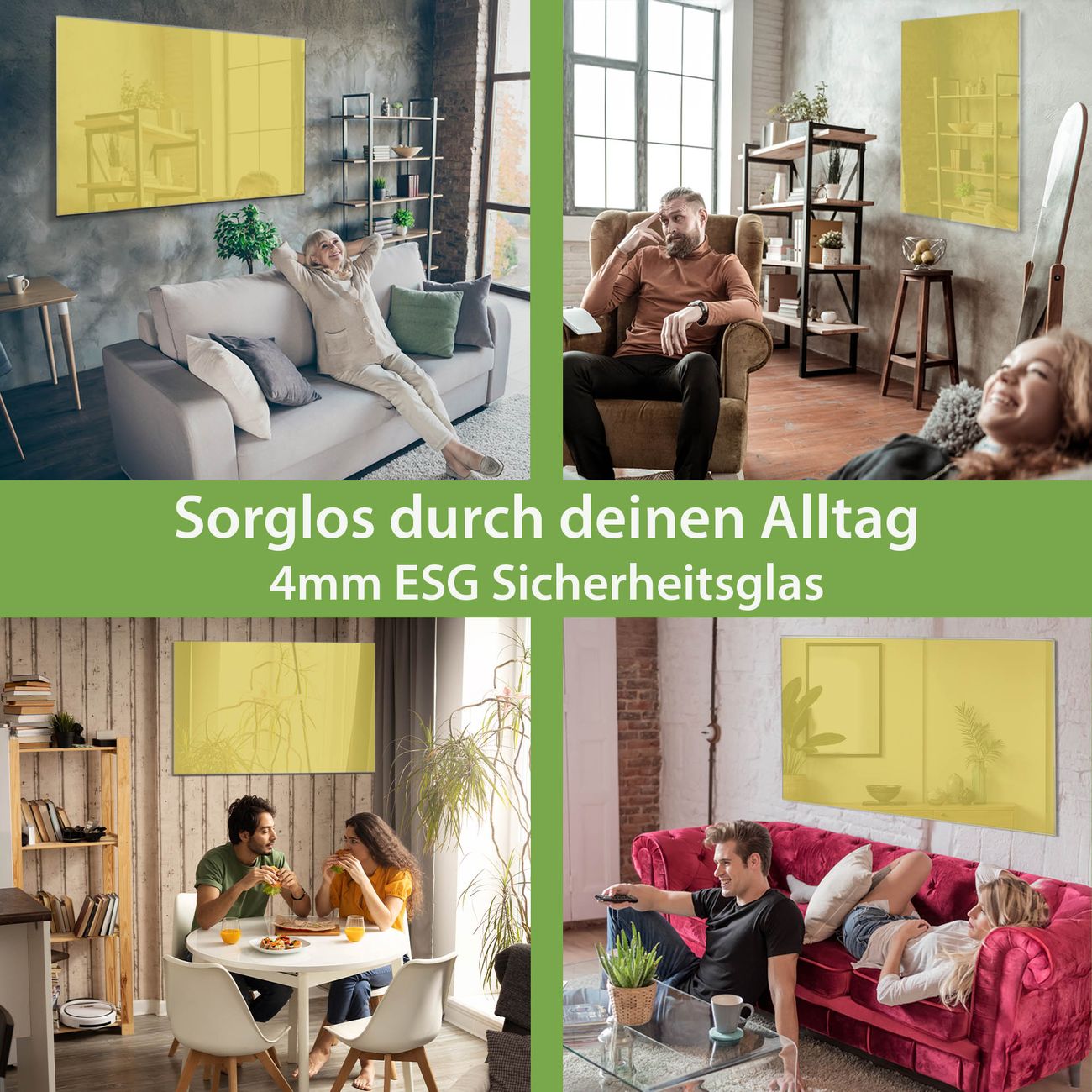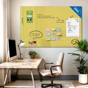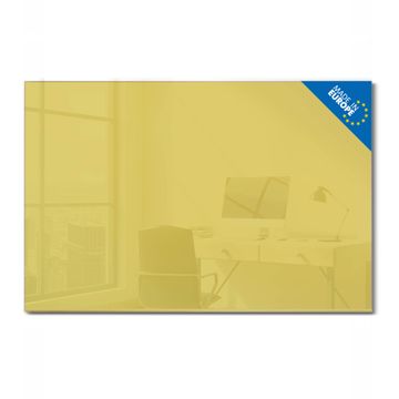 Material: 4mm Sicherheitsglas mit Metallrückwand Eigenschaften: beschreibbar, magnetisch, kratzfest Maße: 120x80x0,6cm, 14,40kg schwer Farbe Nummer 0029 Lemon Zubehör: inklusive 4 Neodym-Magnete