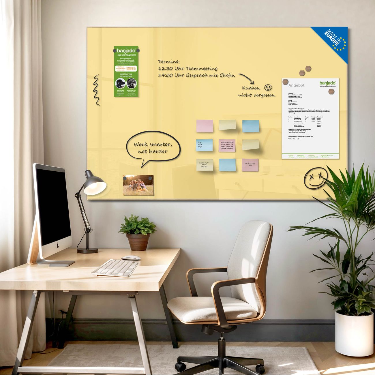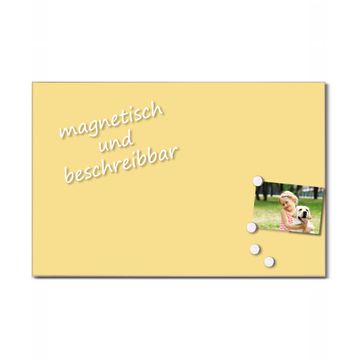 Material: 4mm Sicherheitsglas mit Metallrückwand Eigenschaften: beschreibbar, magnetisch, kratzfest Maße: 45x30x0,6cm, 2,03kg schwer Farbe Nummer 0030 Honig Zubehör: inklusive 4 Neodym-Magnete