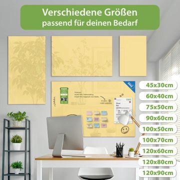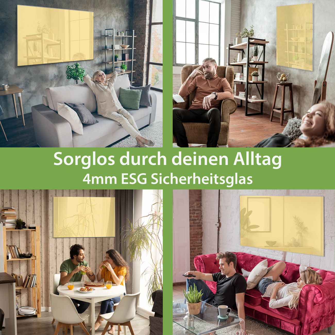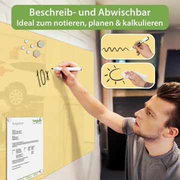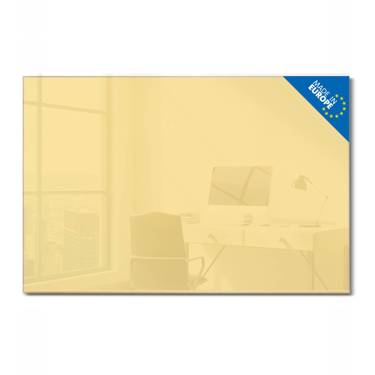 Material: 4mm Sicherheitsglas mit Metallrückwand Eigenschaften: beschreibbar, magnetisch, kratzfest Maße: 120x80x0,6cm, 14,40kg schwer Farbe Nummer 0030 Honig Zubehör: inklusive 4 Neodym-Magnete