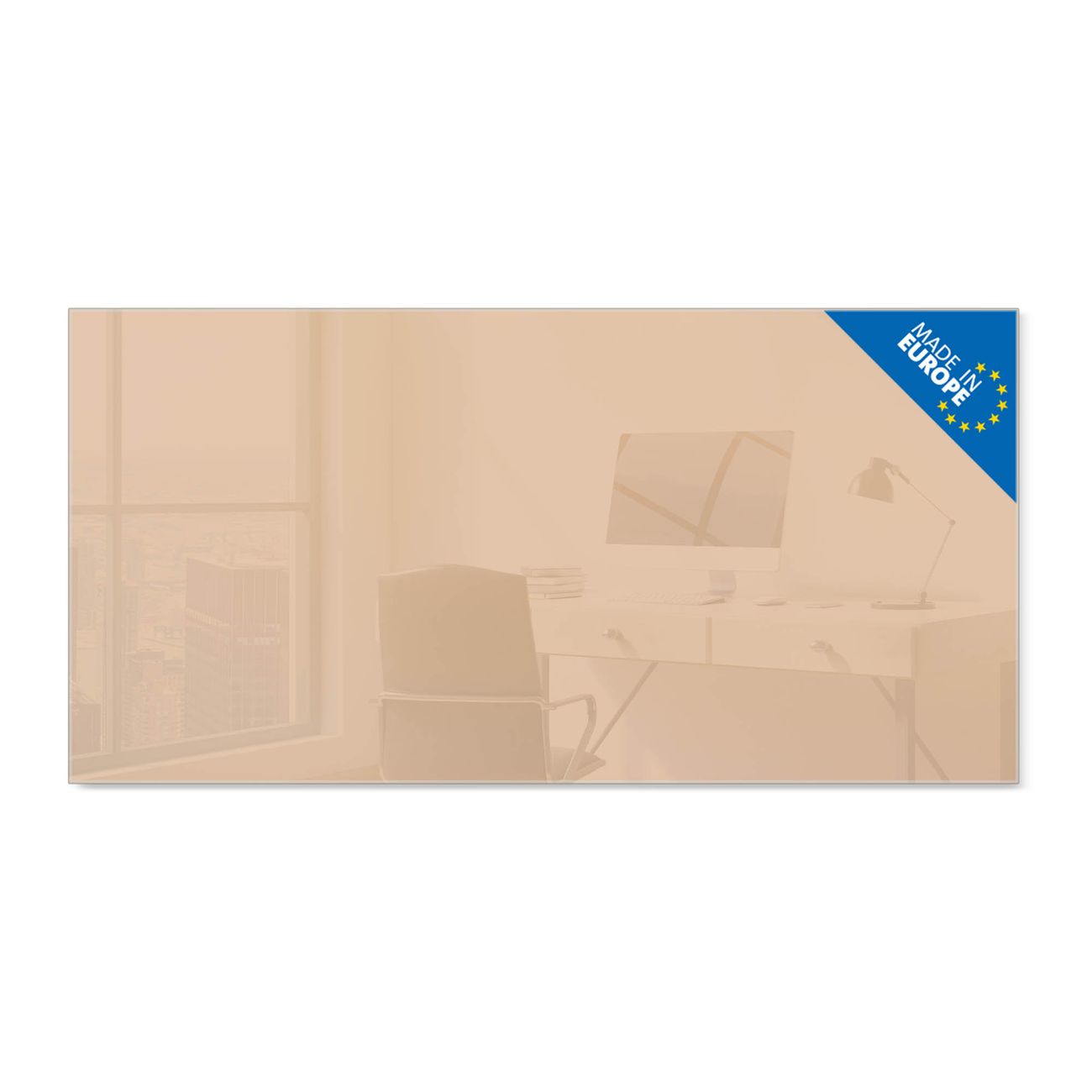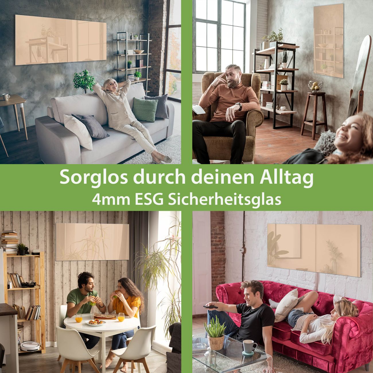 Material: 4mm Sicherheitsglas mit Metallrückwand Eigenschaften: beschreibbar, magnetisch, kratzfest Maße: 100x50x0,6cm, 7,50kg schwer Farbe Nummer 0032 Sandstein Zubehör: inklusive 4 Neodym-Magnete