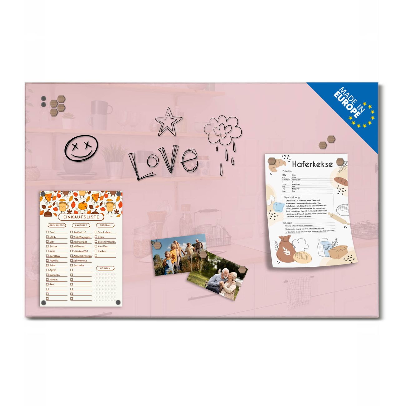 Ein Stück Design, das Ihren Alltag organisiert. Schreiben, heften, inspirieren - alles an einem Ort. Qualität, die man spürt. Montage leicht gemacht. Handwerk mit Herz - veredelt in Sachsen. Einzigartiges Design mit Motiv Farbe Altrosa Beschreibbare Glasoberfläche, leicht zu reinigen Starke Magnetkraft durch Stahlrückwand Inklusive 4 Neodym-Magneten Flexible Montageoptionen Handveredelt in Sachsen - Qualität, die bleibt