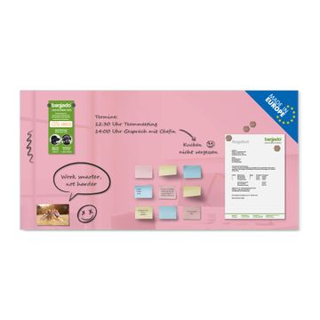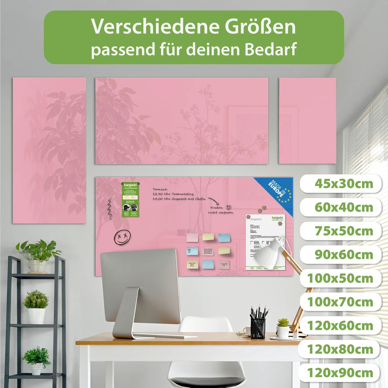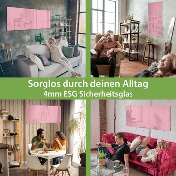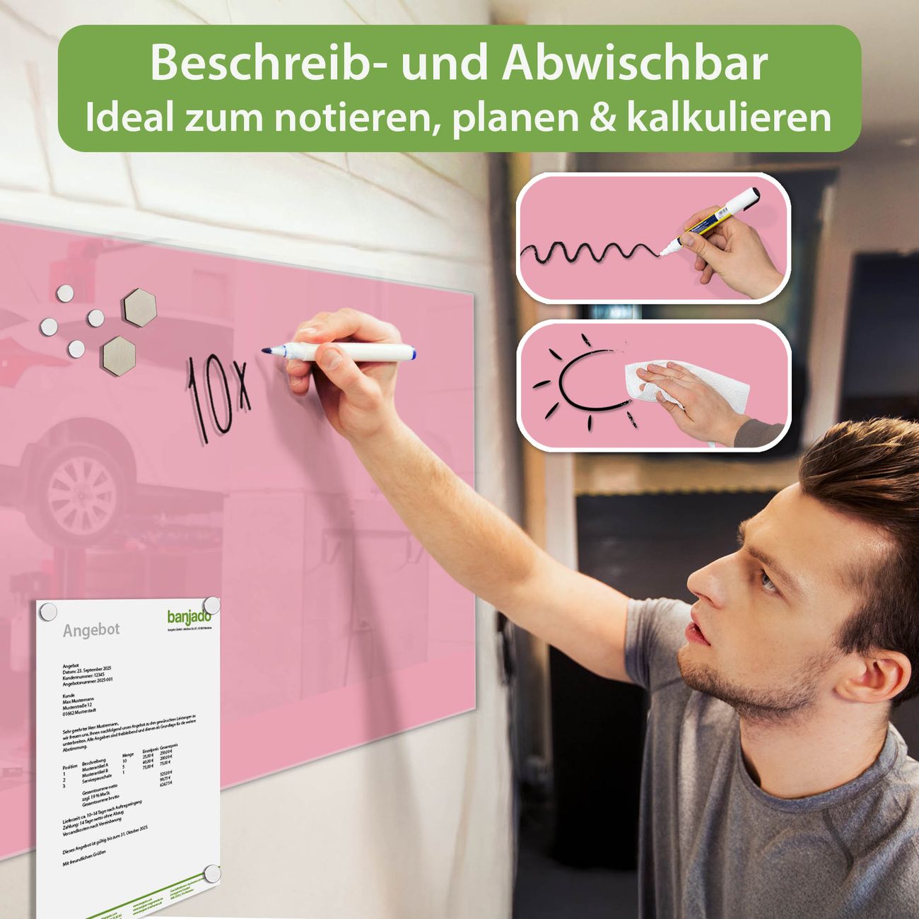 Material: 4mm Sicherheitsglas mit Metallrückwand Eigenschaften: beschreibbar, magnetisch, kratzfest Maße: 100x50x0,6cm, 7,50kg schwer Farbe Nummer 0035 Malve Zubehör: inklusive 4 Neodym-Magnete