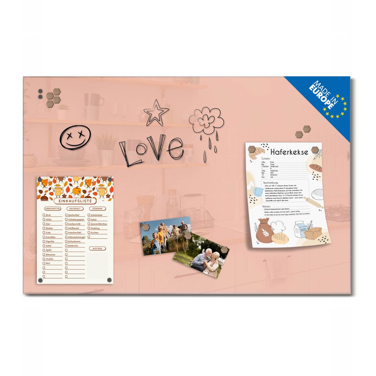 Material: 4mm Sicherheitsglas mit Metallrückwand Eigenschaften: beschreibbar, magnetisch, kratzfest Maße: 75x50x0,6cm, 5,63kg schwer Farbe Nummer 0036 Aprikot Zubehör: inklusive 4 Neodym-Magnete