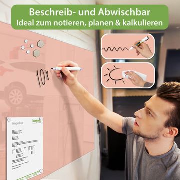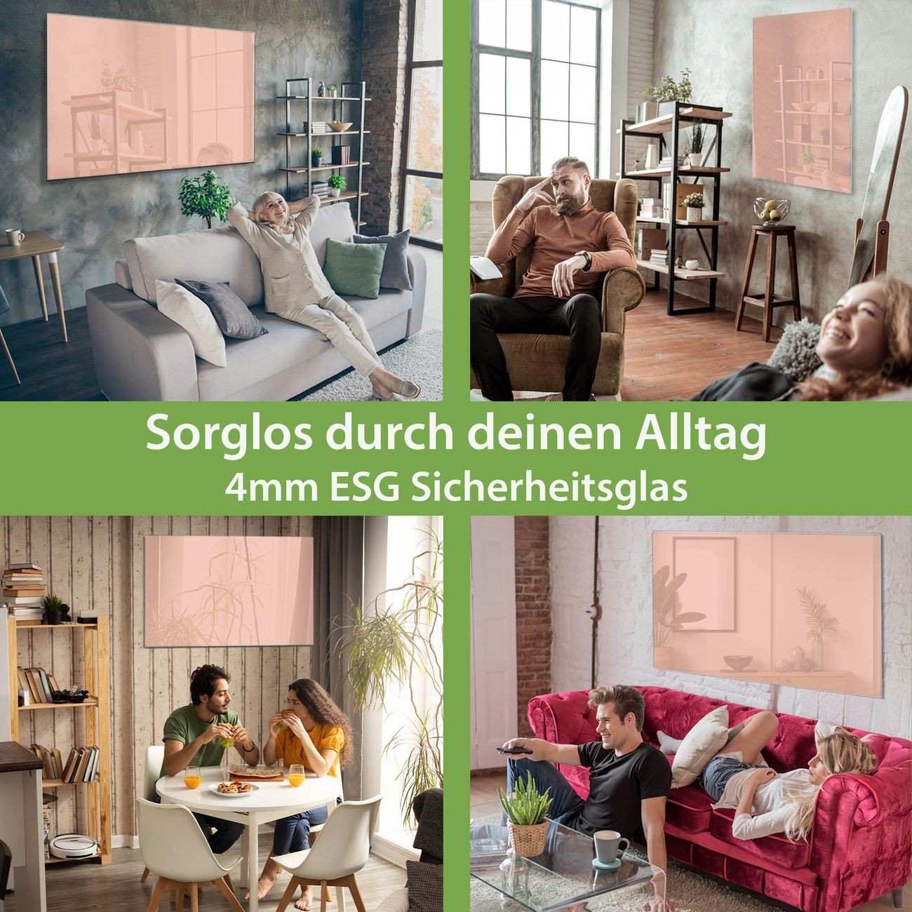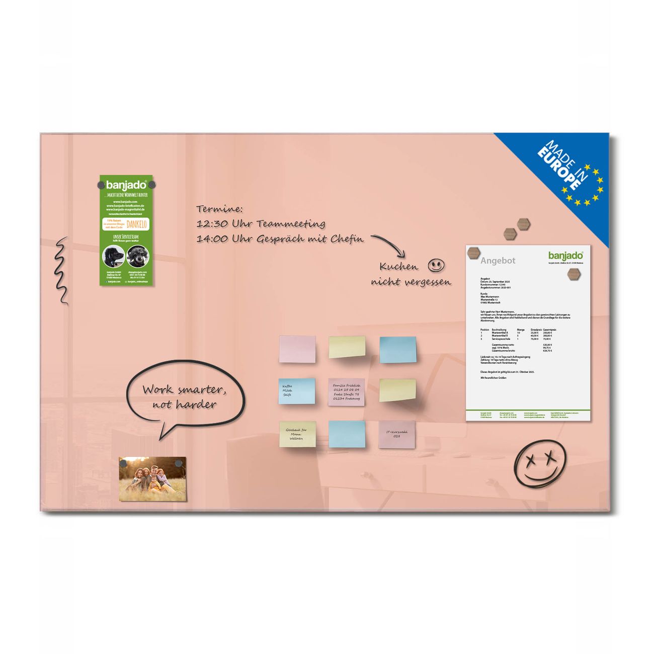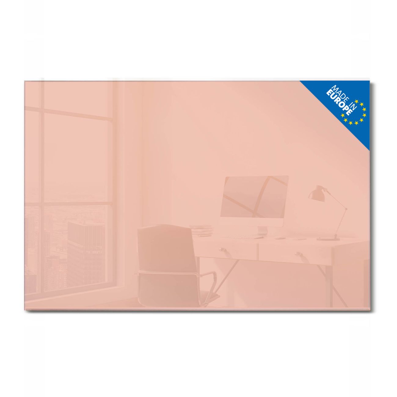 Material: 4mm Sicherheitsglas mit Metallrückwand Eigenschaften: beschreibbar, magnetisch, kratzfest Maße: 120x80x0,6cm, 14,40kg schwer Farbe Nummer 0036 Aprikot Zubehör: inklusive 4 Neodym-Magnete
