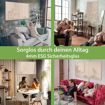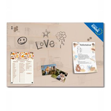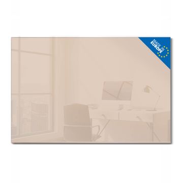 Material: 4mm Sicherheitsglas mit Metallrückwand Eigenschaften: beschreibbar, magnetisch, kratzfest Maße: 75x50x0,6cm, 5,63kg schwer Farbe Nummer 0037 Taupe Zubehör: inklusive 4 Neodym-Magnete