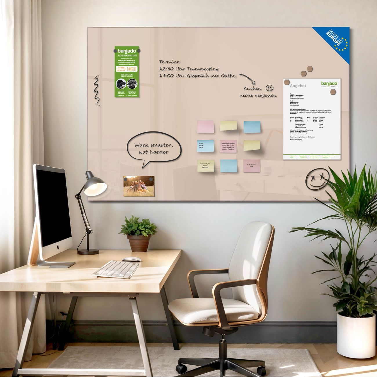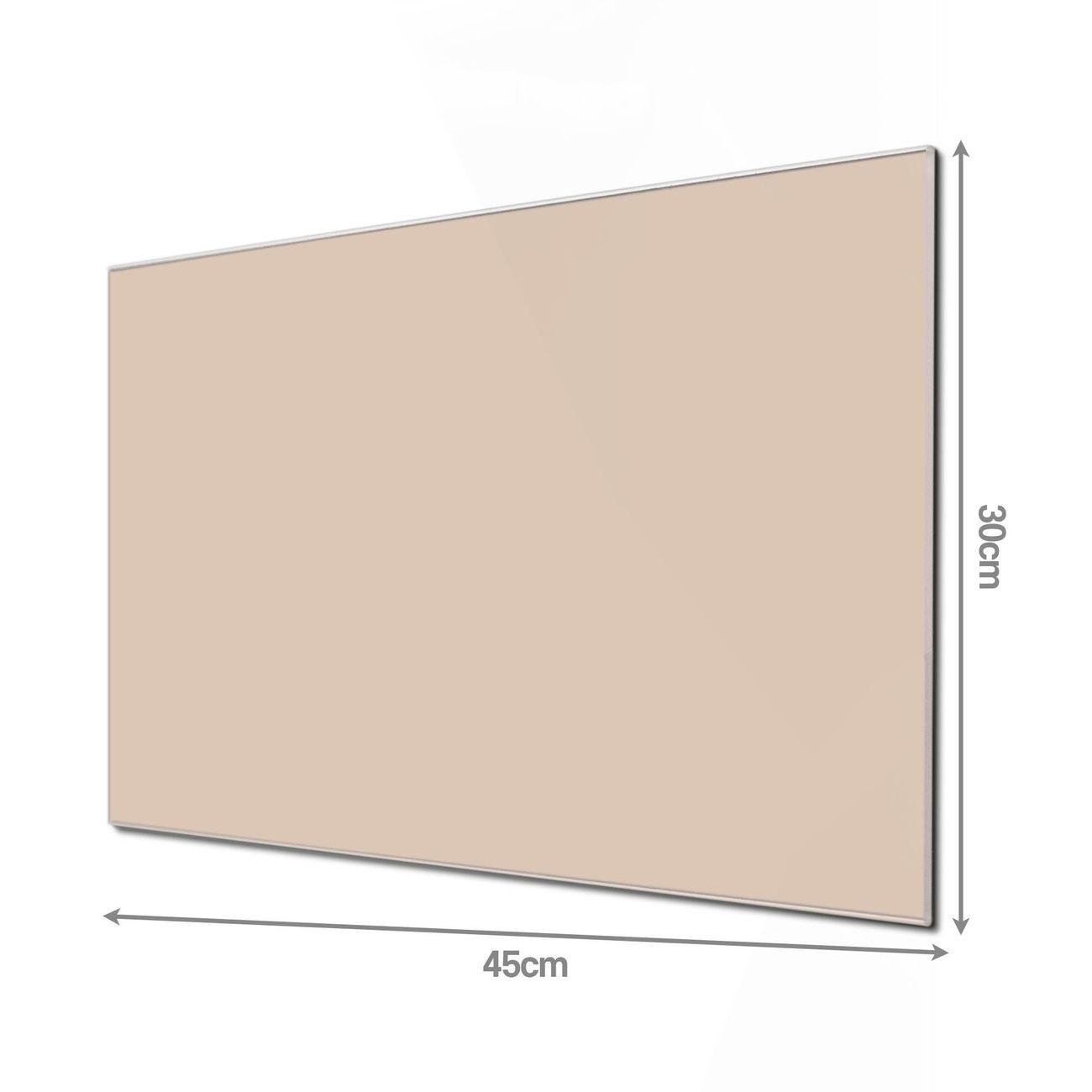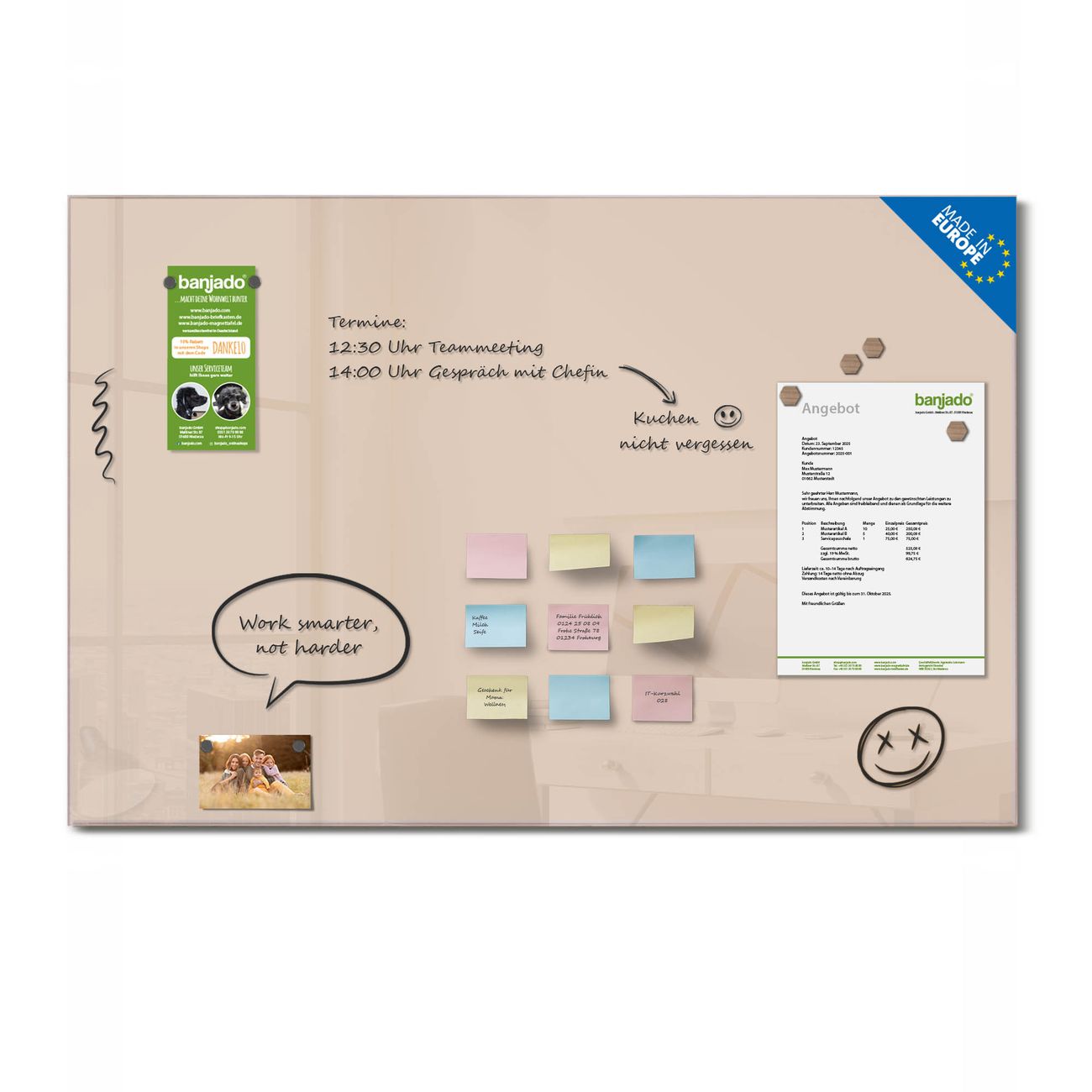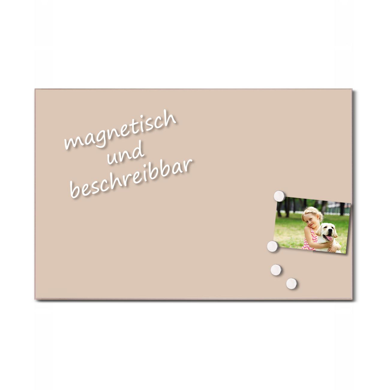Material: 4mm Sicherheitsglas mit Metallrückwand Eigenschaften: beschreibbar, magnetisch, kratzfest Maße: 45x30x0,6cm, 2,03kg schwer Farbe Nummer 0037 Taupe Zubehör: inklusive 4 Neodym-Magnete