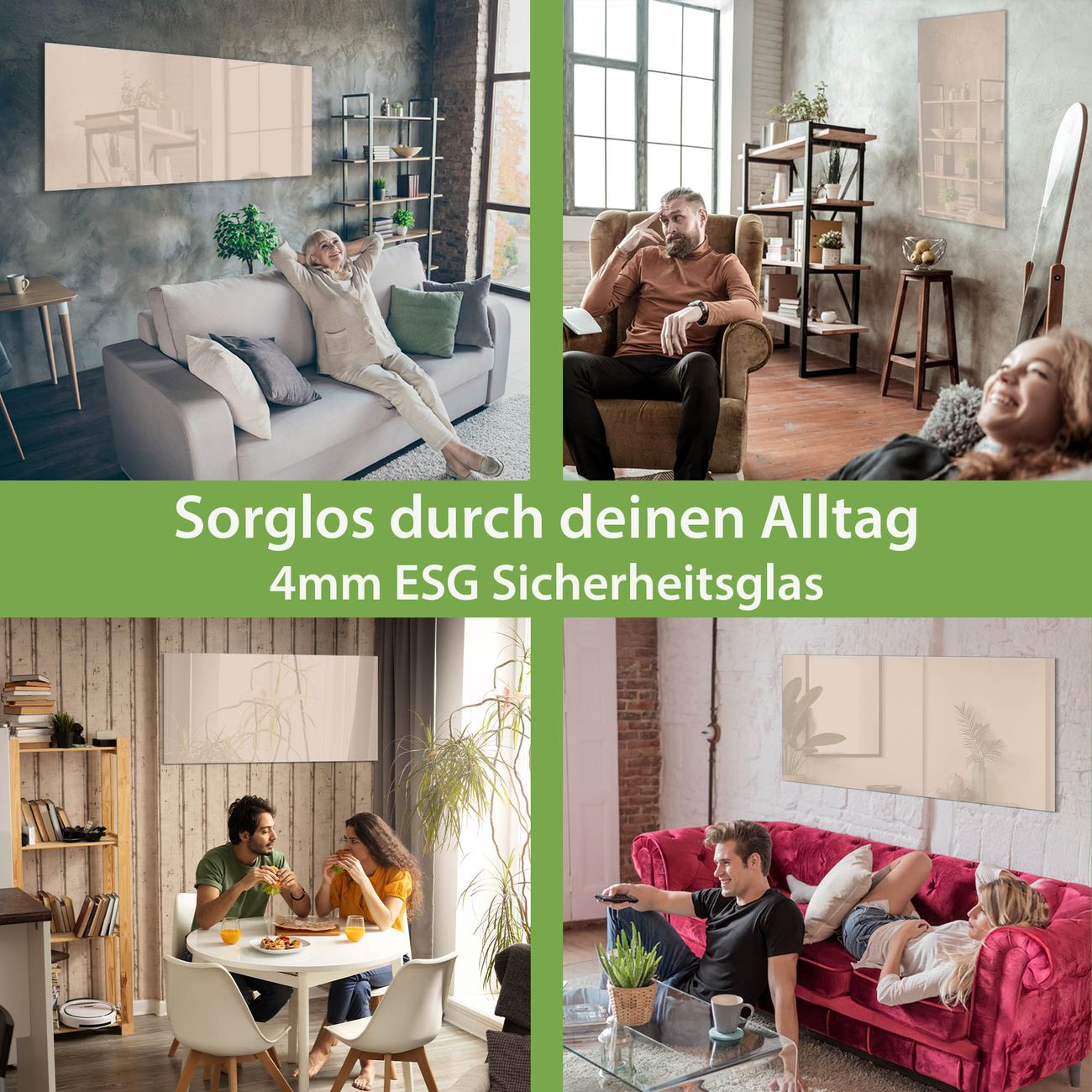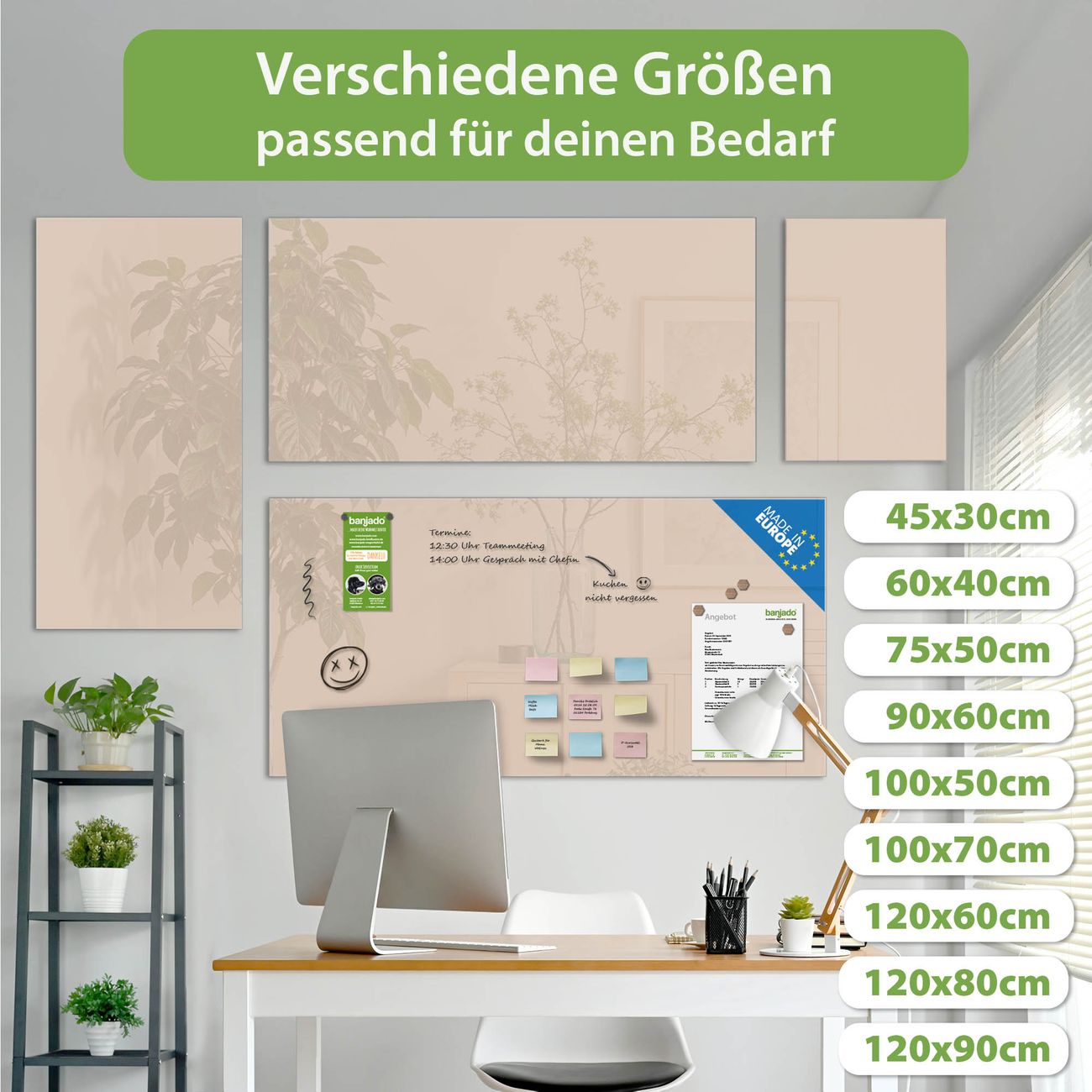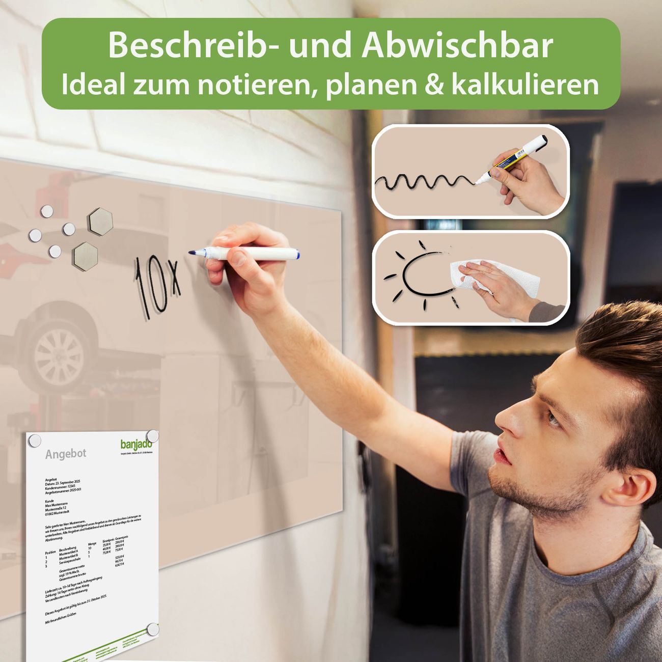 Material: 4mm Sicherheitsglas mit Metallrückwand Eigenschaften: beschreibbar, magnetisch, kratzfest Maße: 100x50x0,6cm, 7,50kg schwer Farbe Nummer 0037 Taupe Zubehör: inklusive 4 Neodym-Magnete