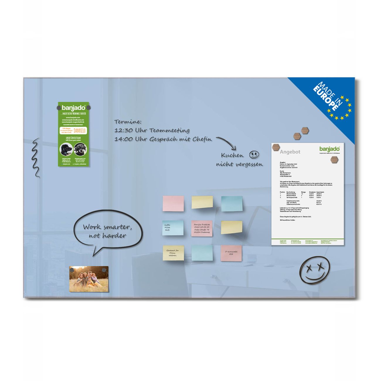 Jede Glas Magnettafel wird in unserer Werkstatt von Hand gefertigt und sorgfältig geprüft. So erhalten Sie ein echtes Qualitätsprodukt, das Funktion und Ästhetik perfekt vereint.?? Warum banjado?