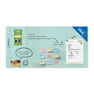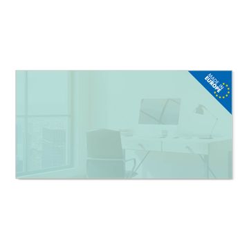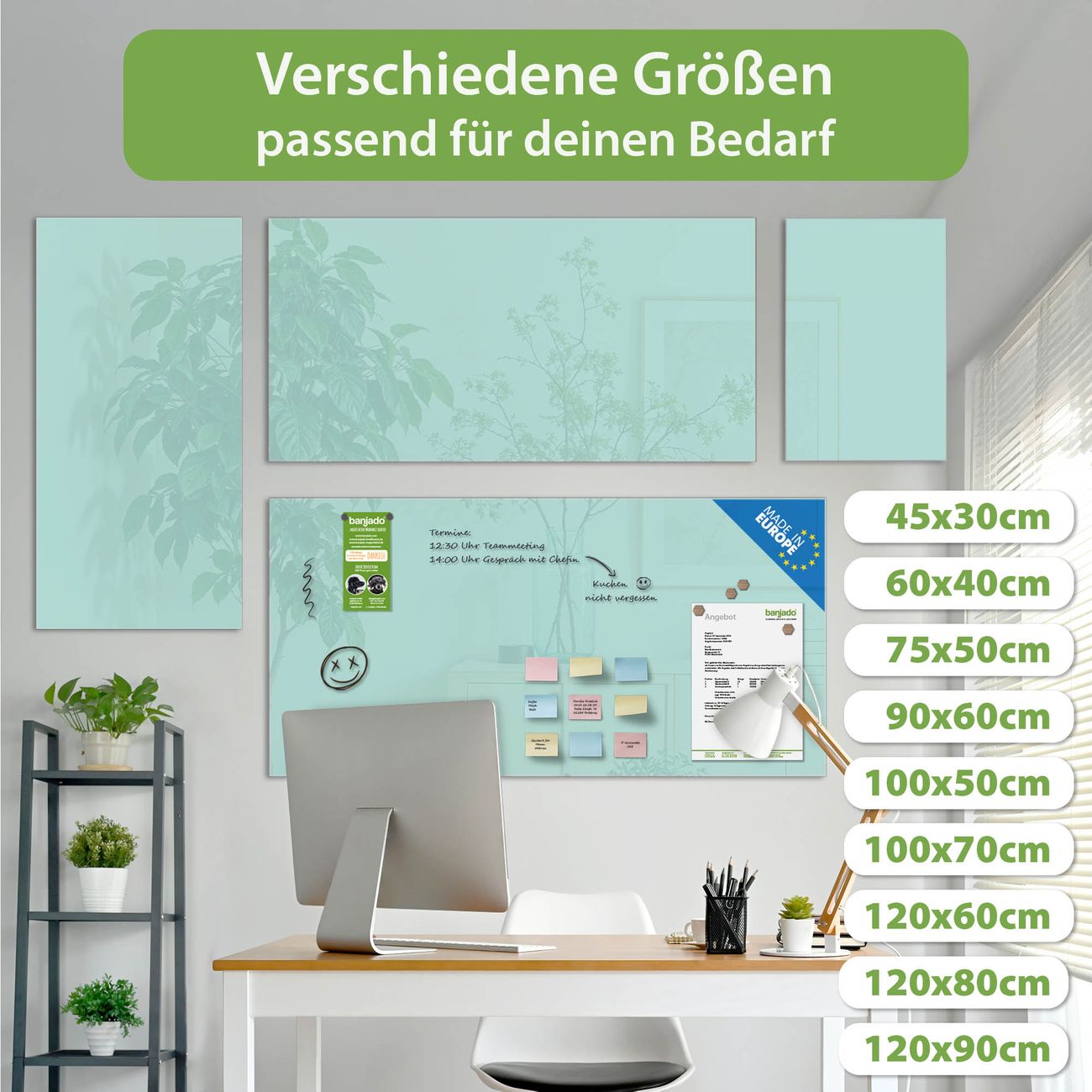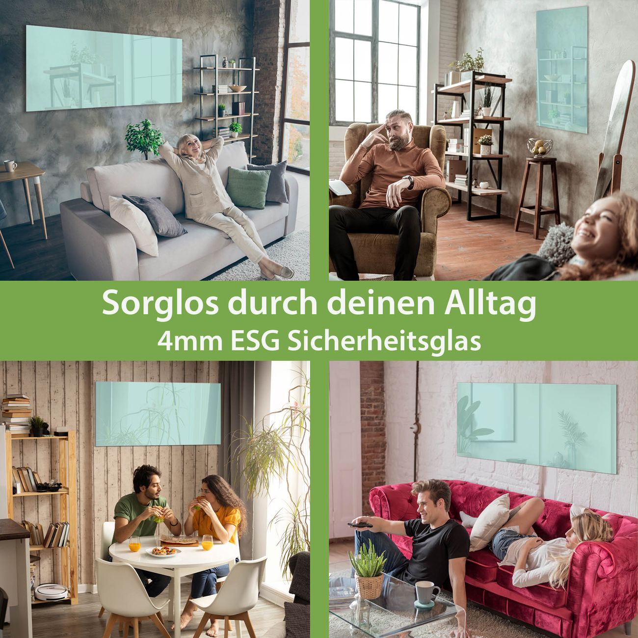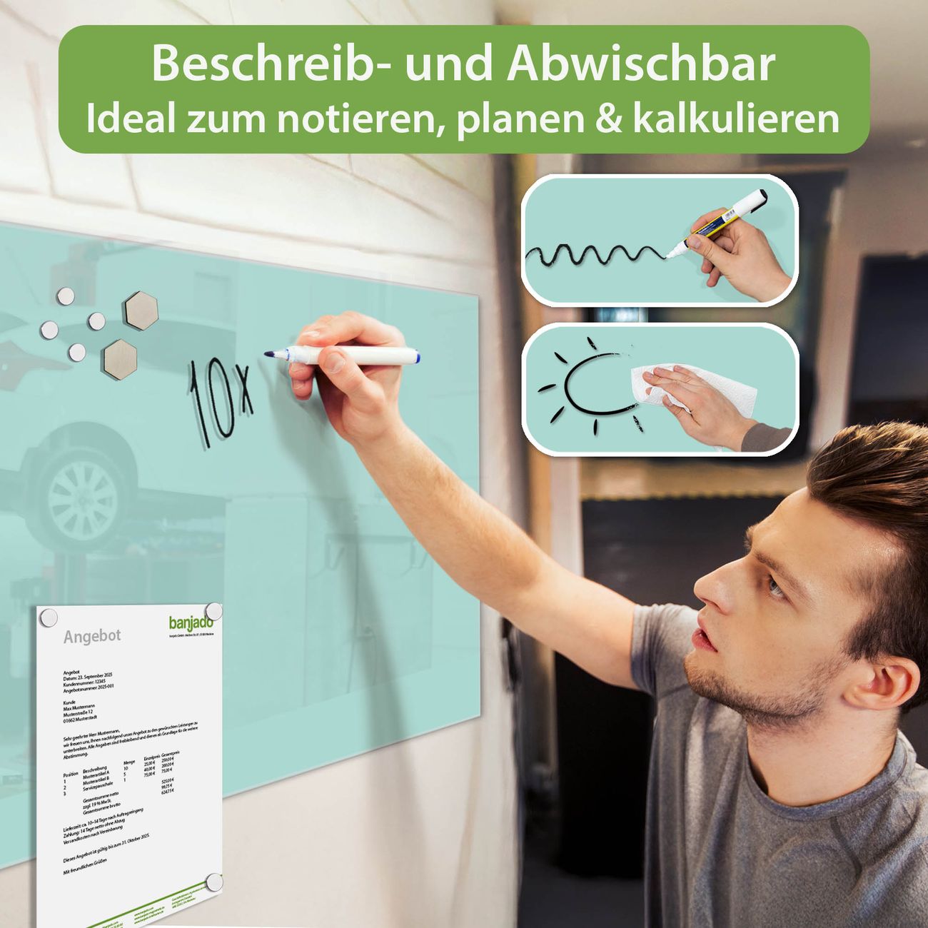 Material: 4mm Sicherheitsglas mit Metallrückwand Eigenschaften: beschreibbar, magnetisch, kratzfest Maße: 100x50x0,6cm, 7,50kg schwer Farbe Nummer 0043 Mint Zubehör: inklusive 4 Neodym-Magnete