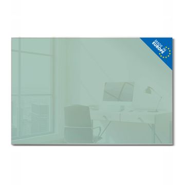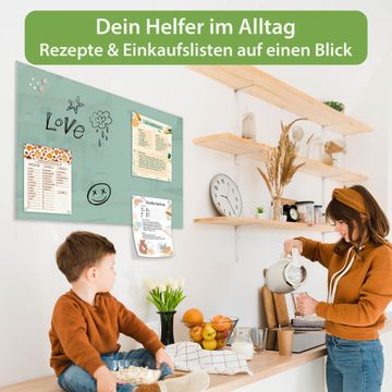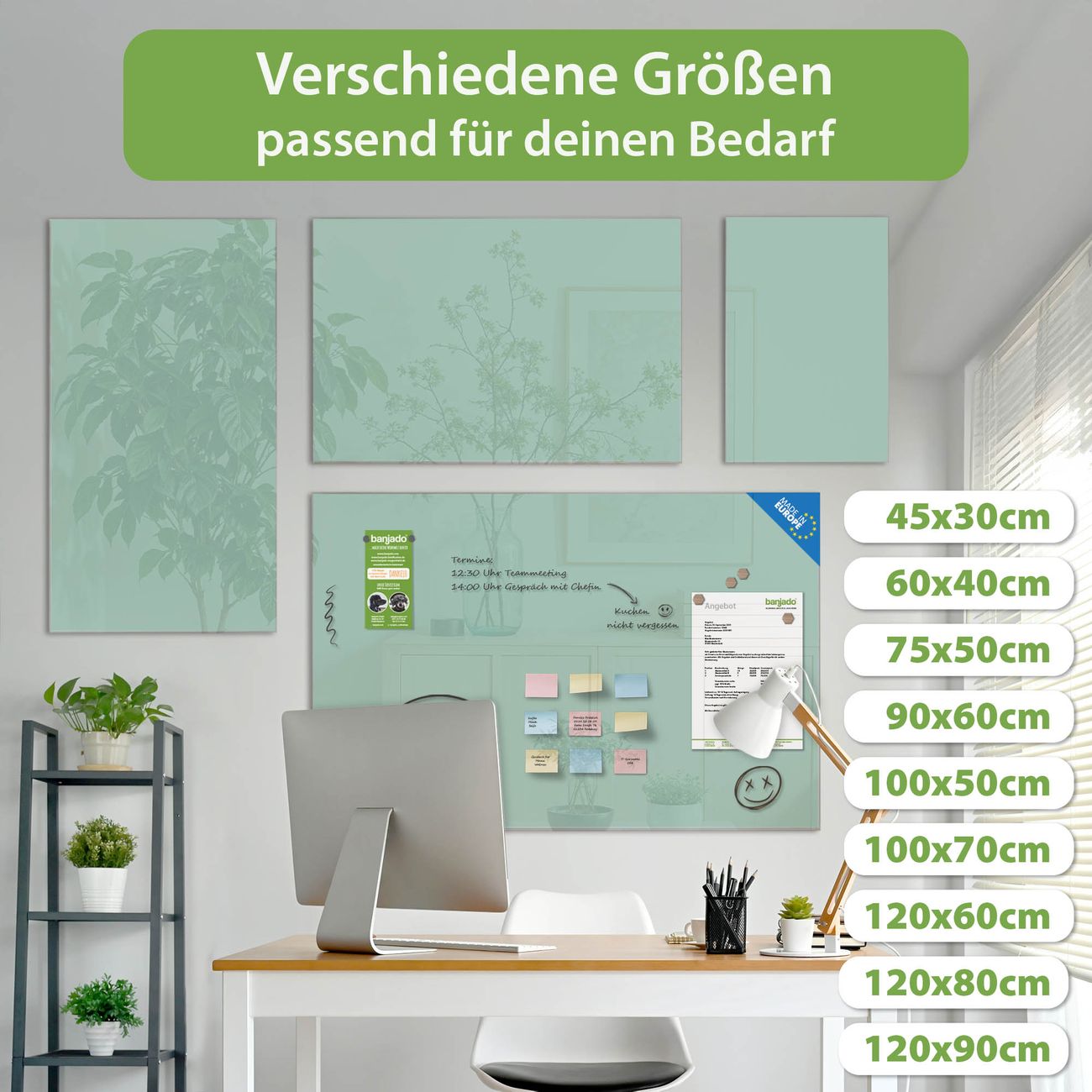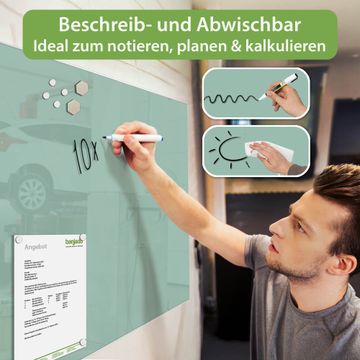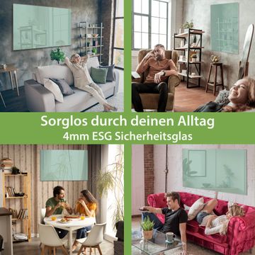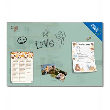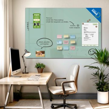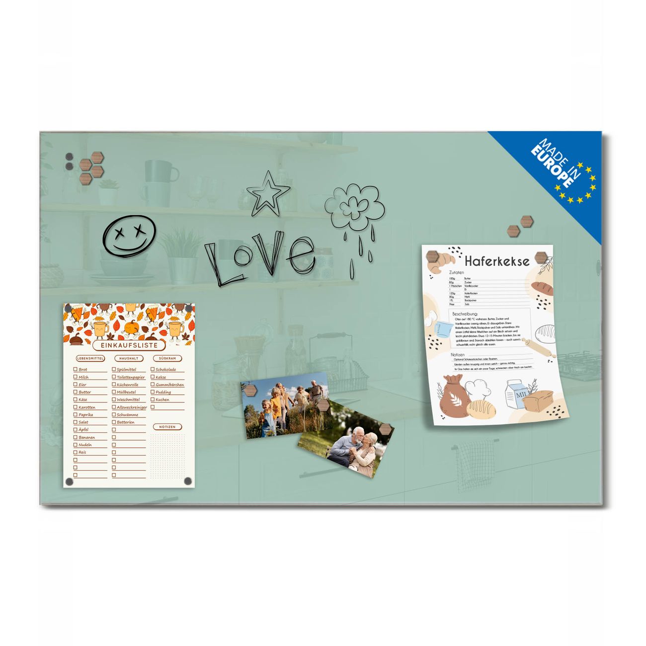 Material: 4mm Sicherheitsglas mit Metallrückwand Eigenschaften: beschreibbar, magnetisch, kratzfest Maße: 60x40x0,6cm, 3,6kg schwer Farbe Nummer 0044 Salbei Zubehör: inklusive 4 Neodym-Magnete