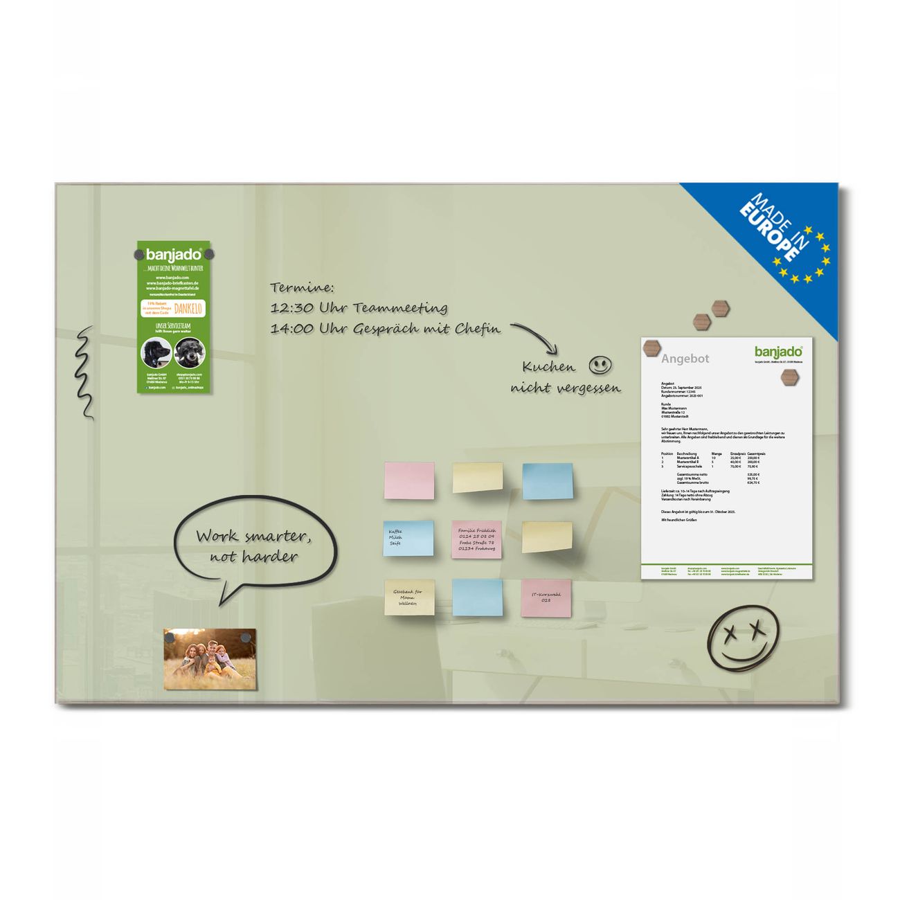 Material: 4mm Sicherheitsglas mit Metallrückwand Eigenschaften: beschreibbar, magnetisch, kratzfest Maße: 120x80x0,6cm, 14,40kg schwer Farbe Nummer 0045 Olive Zubehör: inklusive 4 Neodym-Magnete