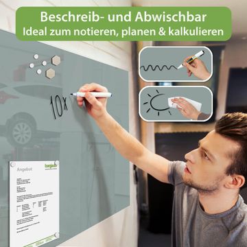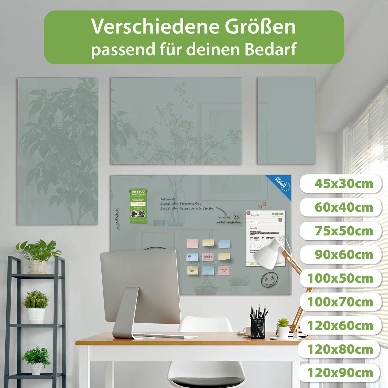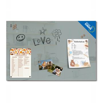 Material: 4mm Sicherheitsglas mit Metallrückwand Eigenschaften: beschreibbar, magnetisch, kratzfest Maße: 75x50x0,6cm, 5,63kg schwer Farbe Nummer 0047 Steingrau Zubehör: inklusive 4 Neodym-Magnete