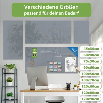 Material: 4mm Sicherheitsglas mit Metallrückwand Eigenschaften: beschreibbar, magnetisch, kratzfest Maße: 100x50x0,6cm, 7,50kg schwer Farbe Nummer 0048 Schiefergrau Zubehör: inklusive 4 Neodym-Magnete