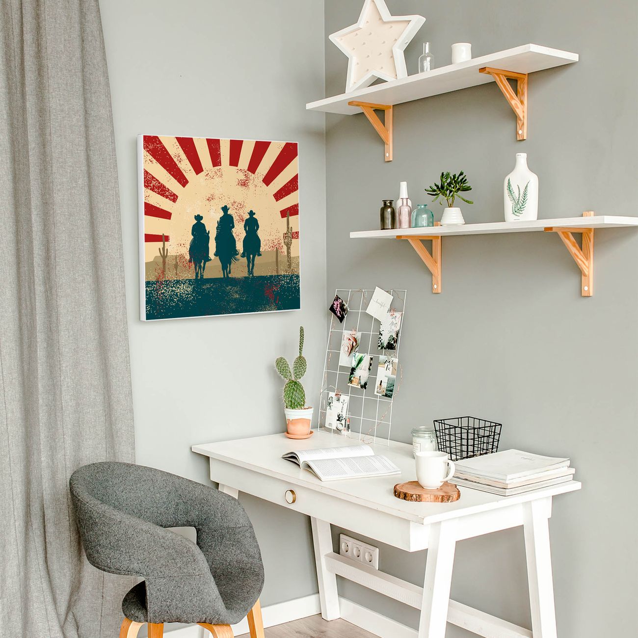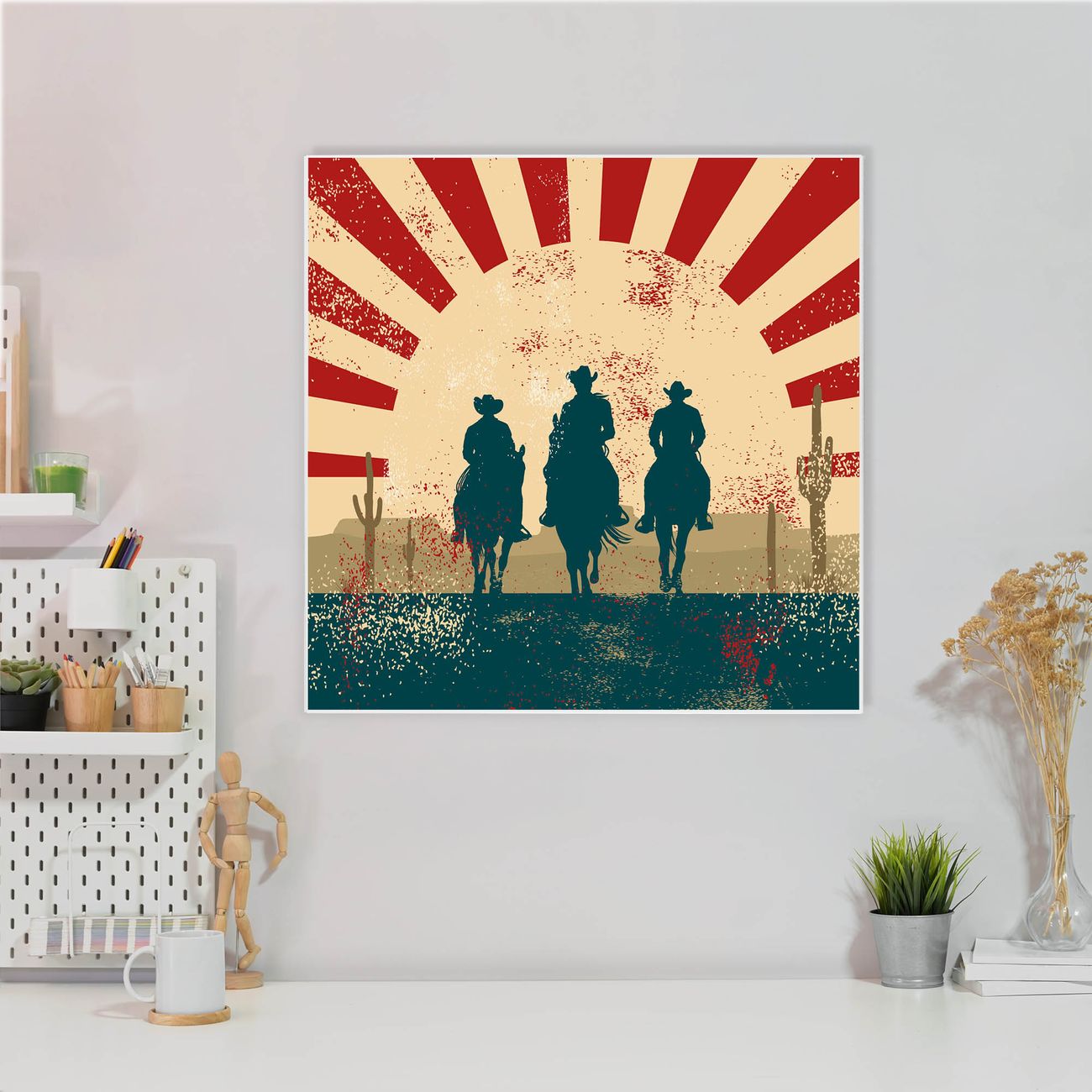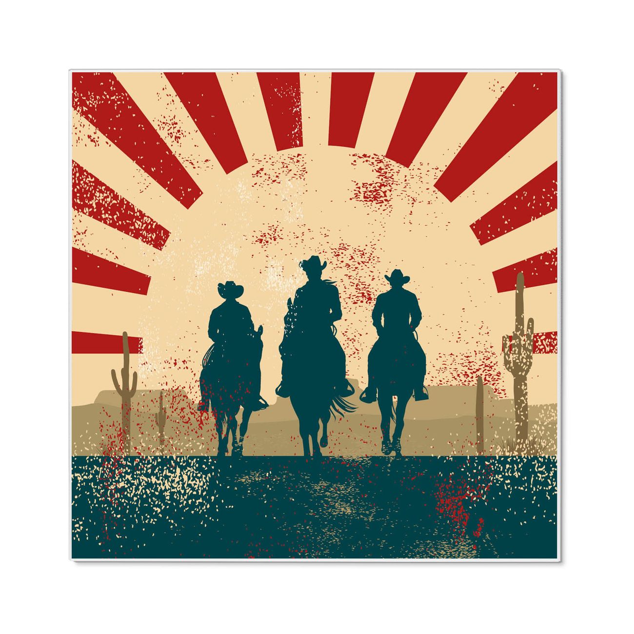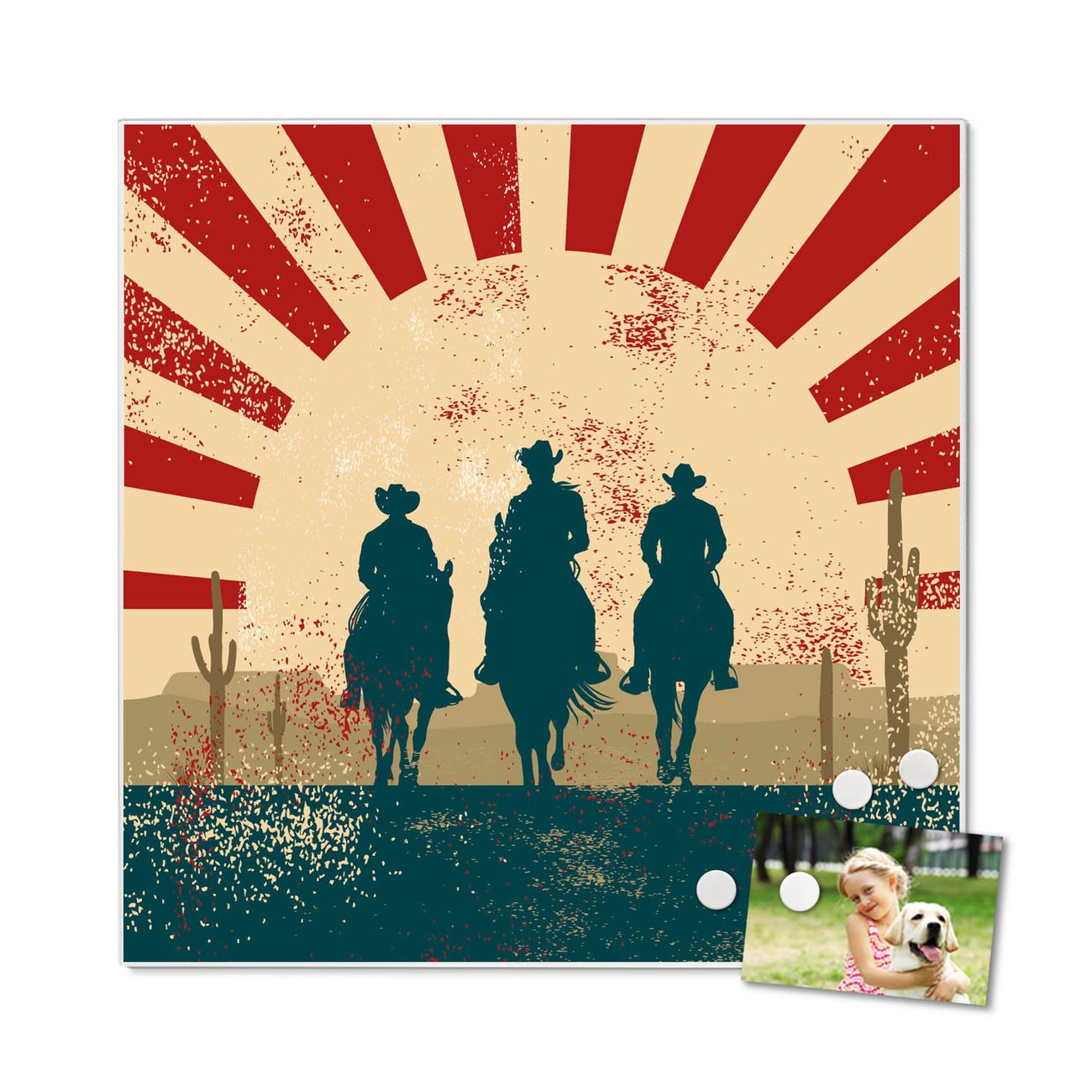 Motiv Drei Cowboys Nr. 10975 Größe: 50x50x2cm BxHxT Gewicht: ca. 1,5 kg Material: Stahl weiß lackiert, Premiumfolie mit Schutzlaminat Magnete: für Dekomagnete geeignet beschreibbar: Nein Format: Quadratisch Zubehör: 4 Magnete, Schrauben und Dübel
