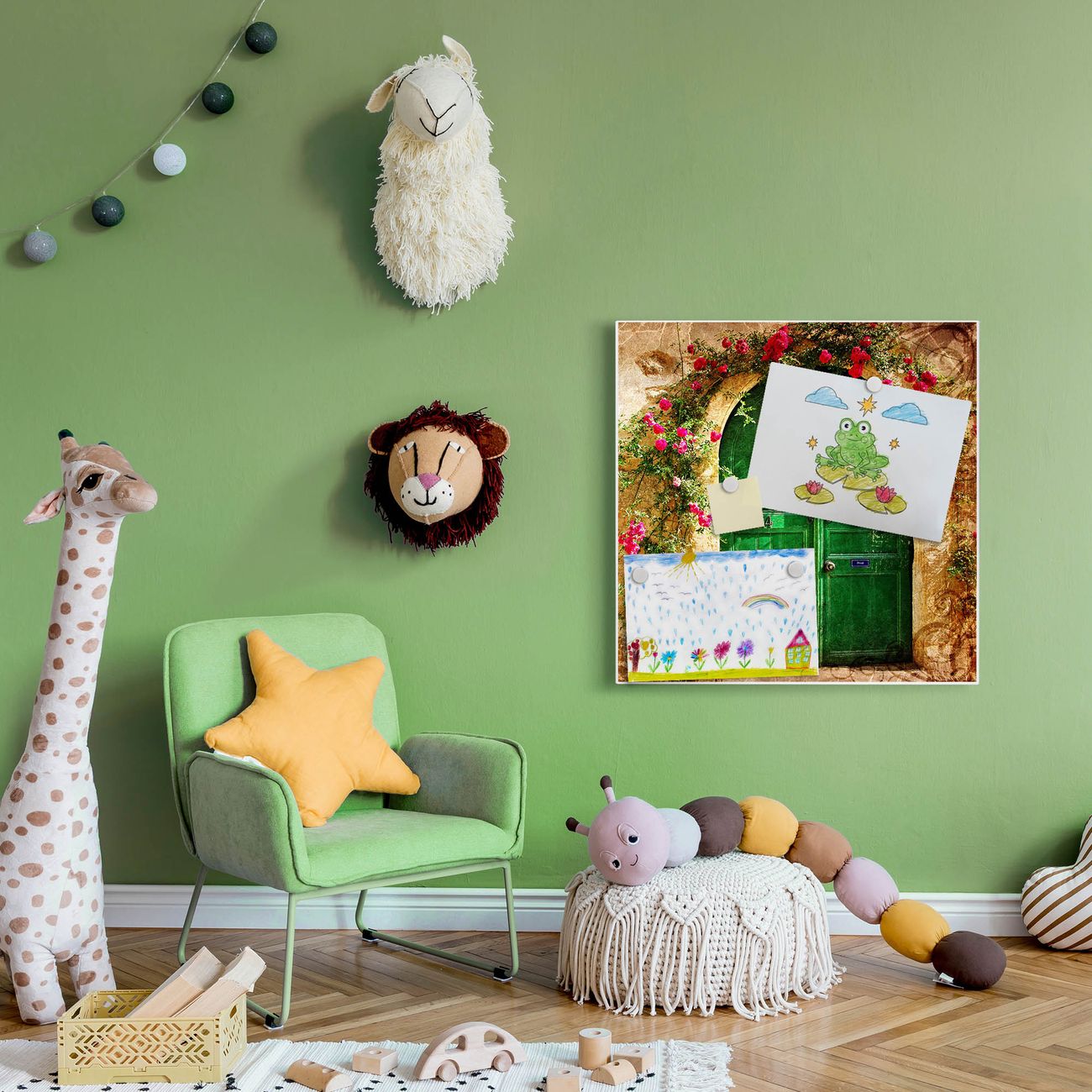 Die banjado Design Magnettafel mit Motiv Motiv Ferienhaus bringt Ordnung in Ihr Zettelchaos. Fotos, Termine, Notizen oder Rezepte lassen Sich hier stilvoll mit Magneten ordnen, Sie behalten alles im Blick. An der Pinnwand halten alle handelsüblichen Magnete. Mit dieser Pinnwand aus Metall haben Sie auch ohne Notizen und Magnete ein schönes Dekoelement. Das Quadratische Format bietet Ihnen ausreichend Platz um alle wichtigen Informationen im Blick zu behalten.