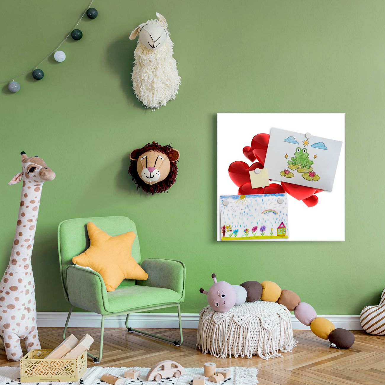 Die banjado Design Magnettafel mit Motiv Motiv Fliegende Herzen bringt Ordnung in Ihr Zettelchaos. Fotos, Termine, Notizen oder Rezepte lassen Sich hier stilvoll mit Magneten ordnen, Sie behalten alles im Blick. An der Pinnwand halten alle handelsüblichen Magnete. Mit dieser Pinnwand aus Metall haben Sie auch ohne Notizen und Magnete ein schönes Dekoelement. Das Quadratische Format bietet Ihnen ausreichend Platz um alle wichtigen Informationen im Blick zu behalten.