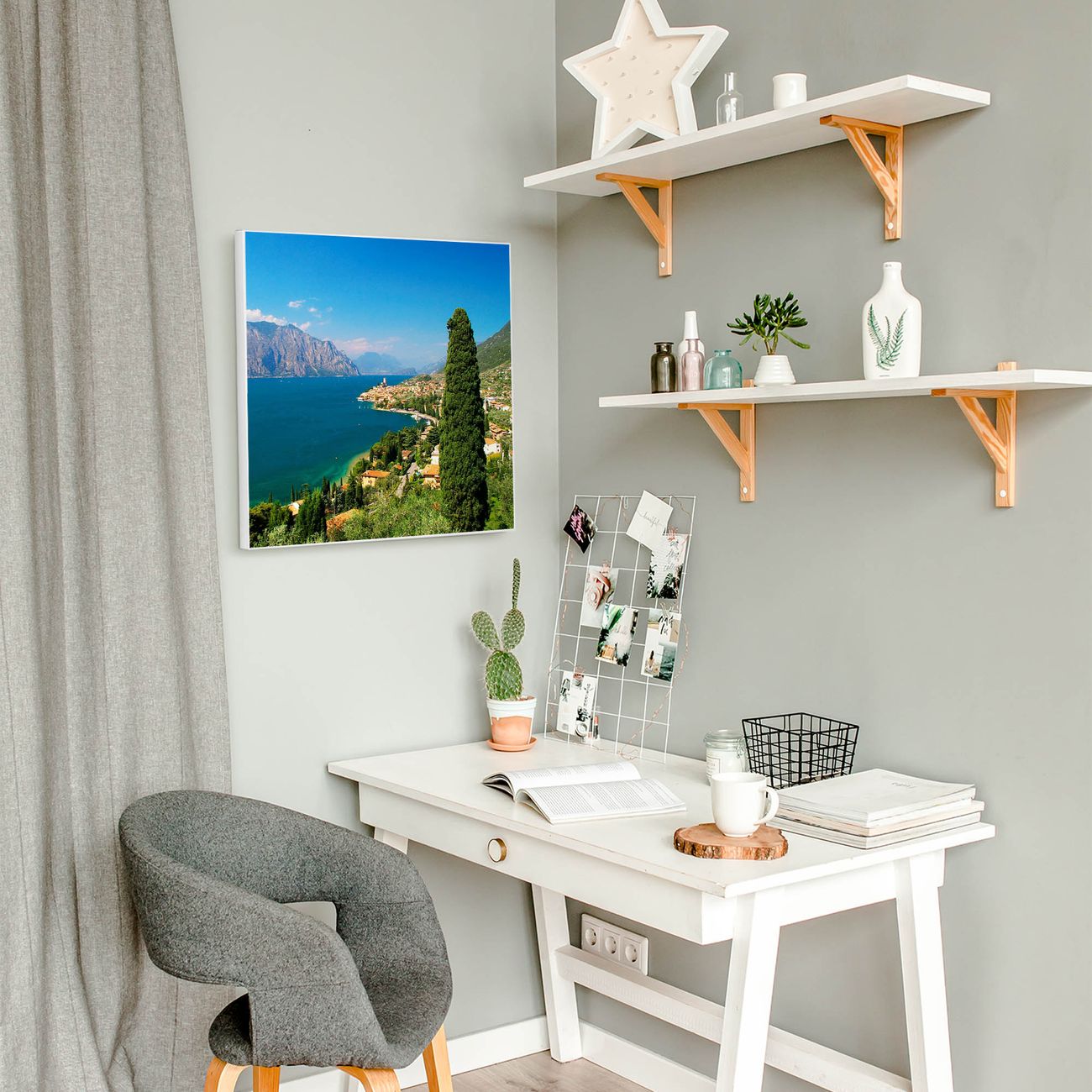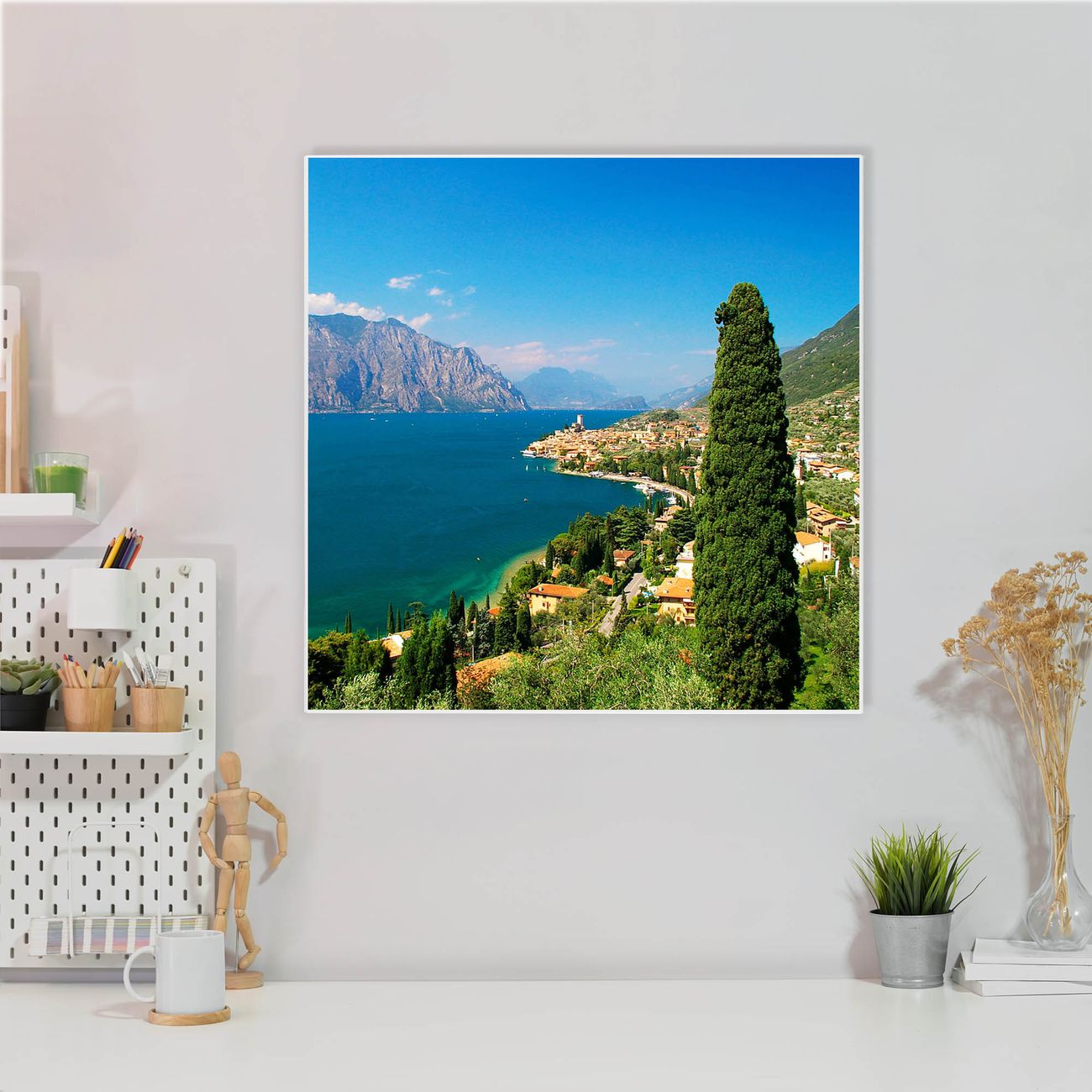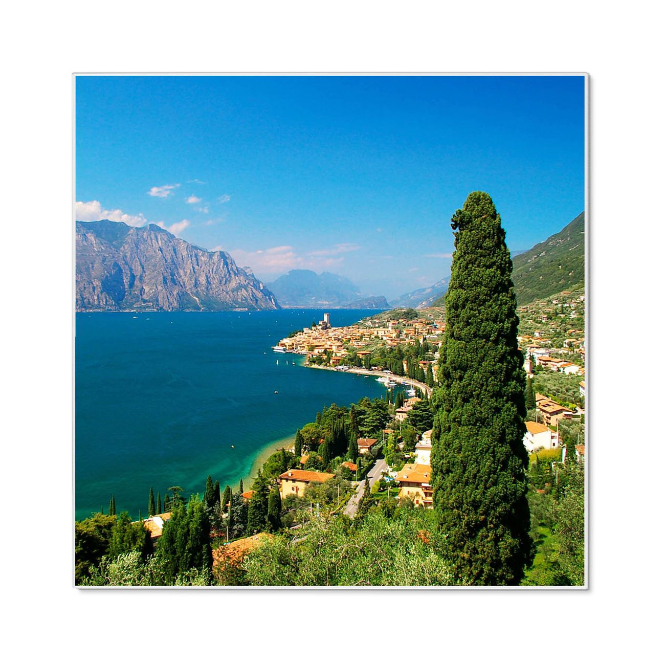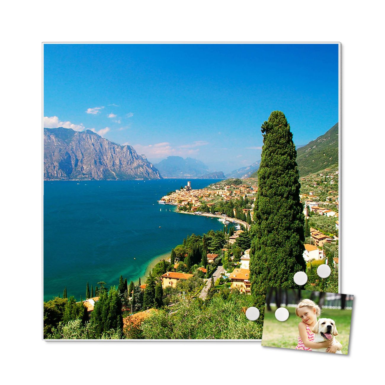 Motiv Gardasee Nr. 10009 Größe: 50x50x2cm BxHxT Gewicht: ca. 1,5 kg Material: Stahl weiß lackiert, Premiumfolie mit Schutzlaminat Magnete: für Dekomagnete geeignet beschreibbar: Nein Format: Quadratisch Zubehör: 4 Magnete, Schrauben und Dübel