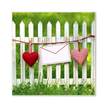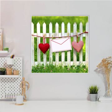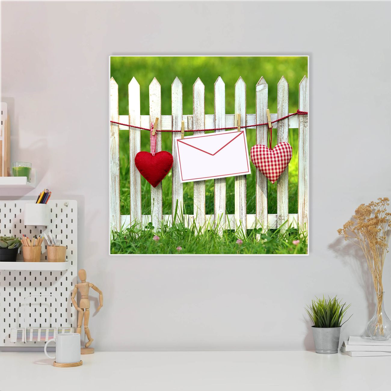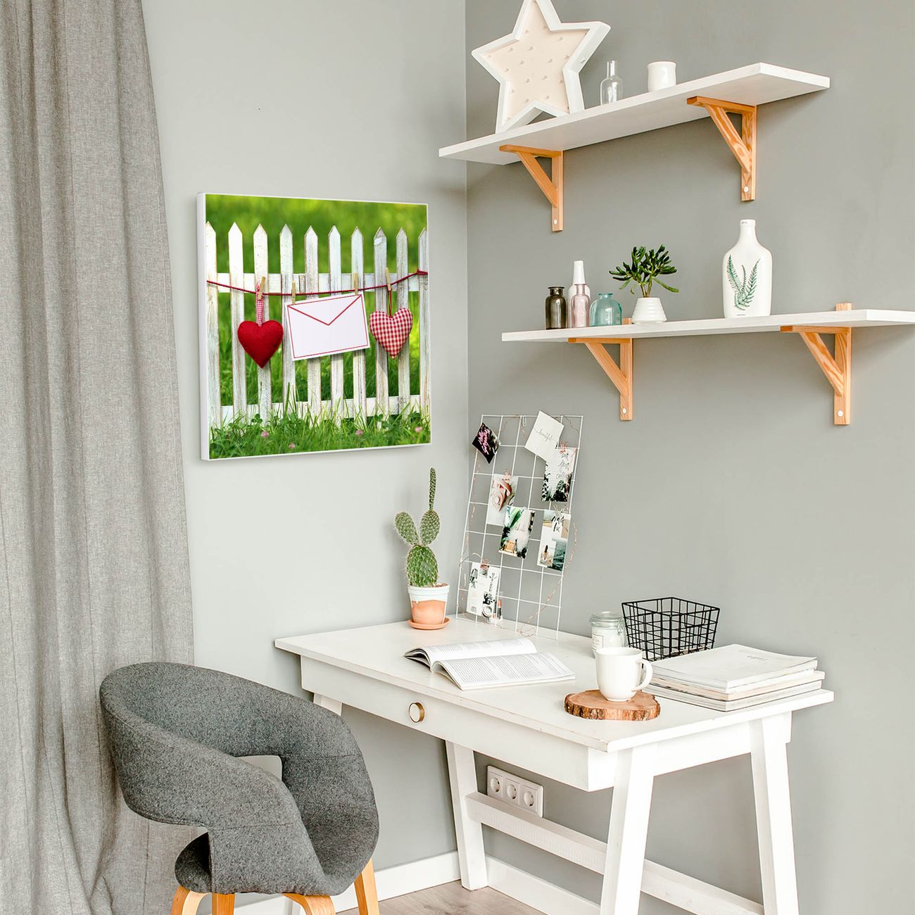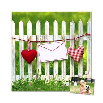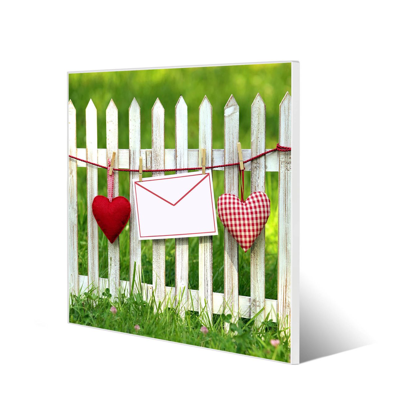 Motiv Gartenzaun Nr. 10375 Größe: 50x50x2cm BxHxT Gewicht: ca. 1,5 kg Material: Stahl weiß lackiert, Premiumfolie mit Schutzlaminat Magnete: für Dekomagnete geeignet beschreibbar: Nein Format: Quadratisch Zubehör: 4 Magnete, Schrauben und Dübel