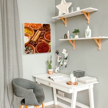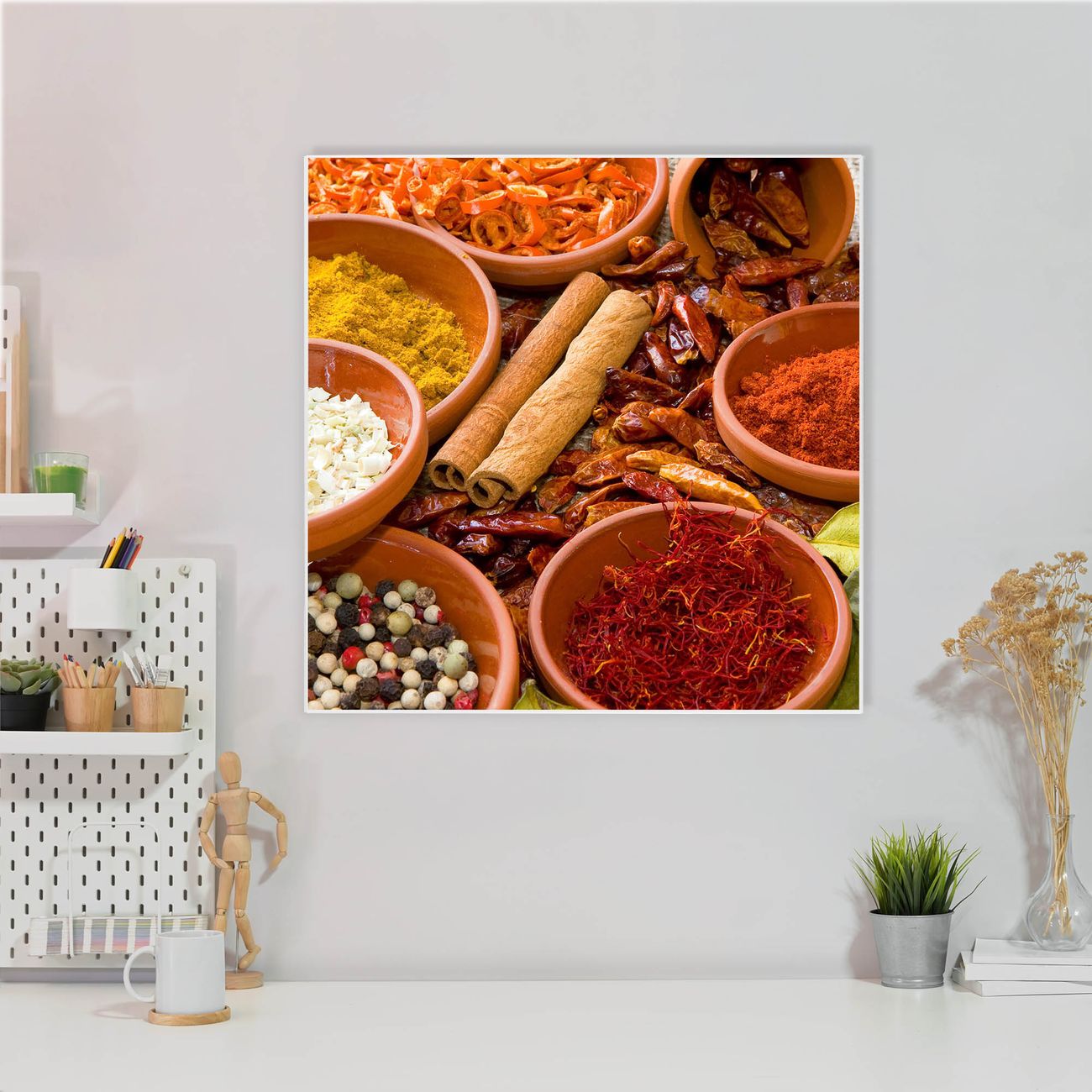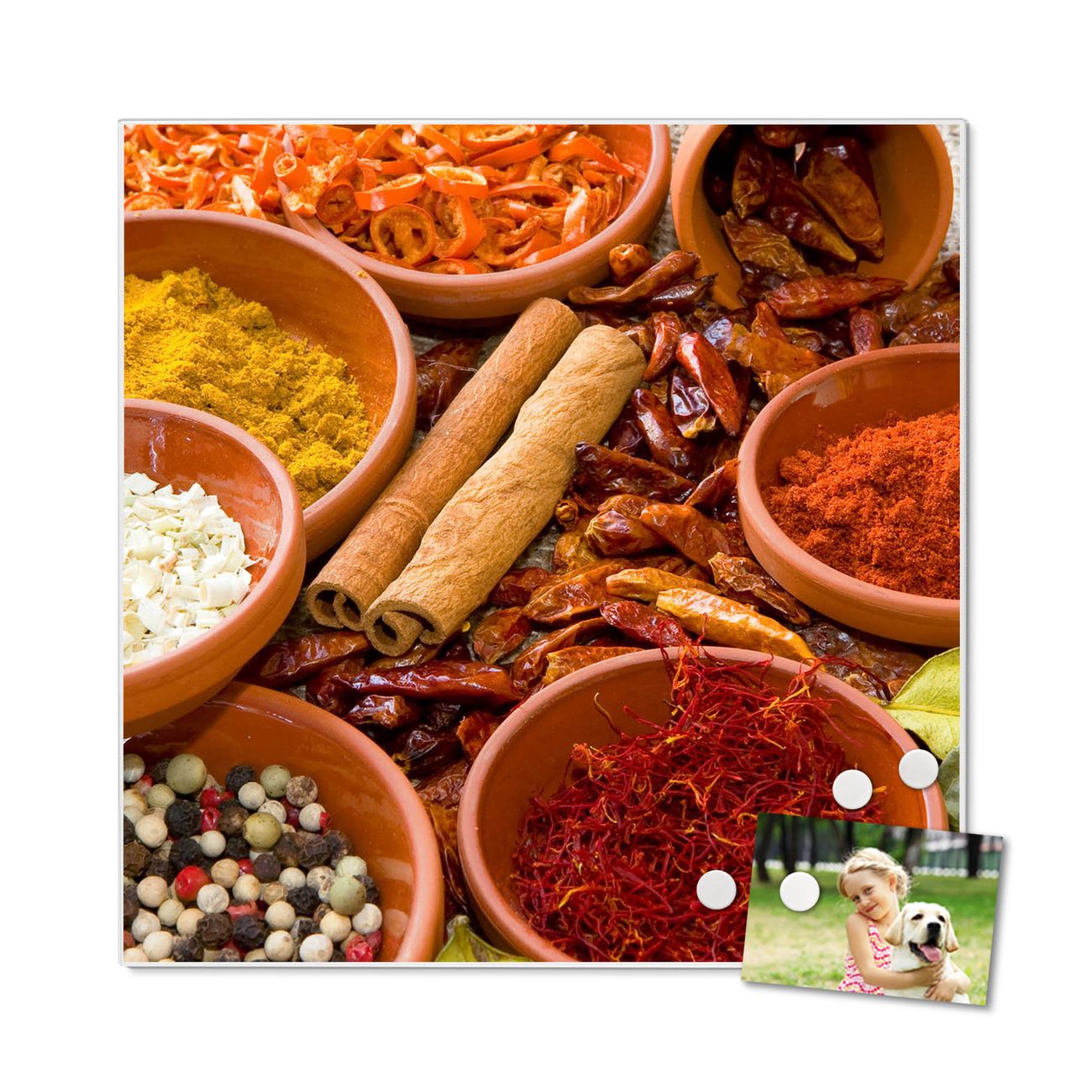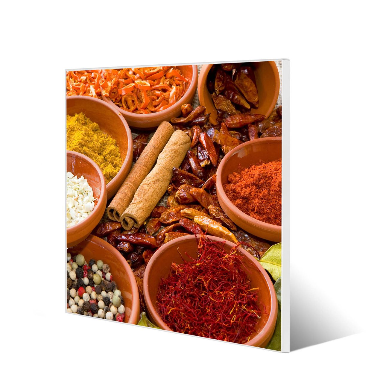 Motiv Gewürze Nr. 10010 Größe: 50x50x2cm BxHxT Gewicht: ca. 1,5 kg Material: Stahl weiß lackiert, Premiumfolie mit Schutzlaminat Magnete: für Dekomagnete geeignet beschreibbar: Nein Format: Quadratisch Zubehör: 4 Magnete, Schrauben und Dübel
