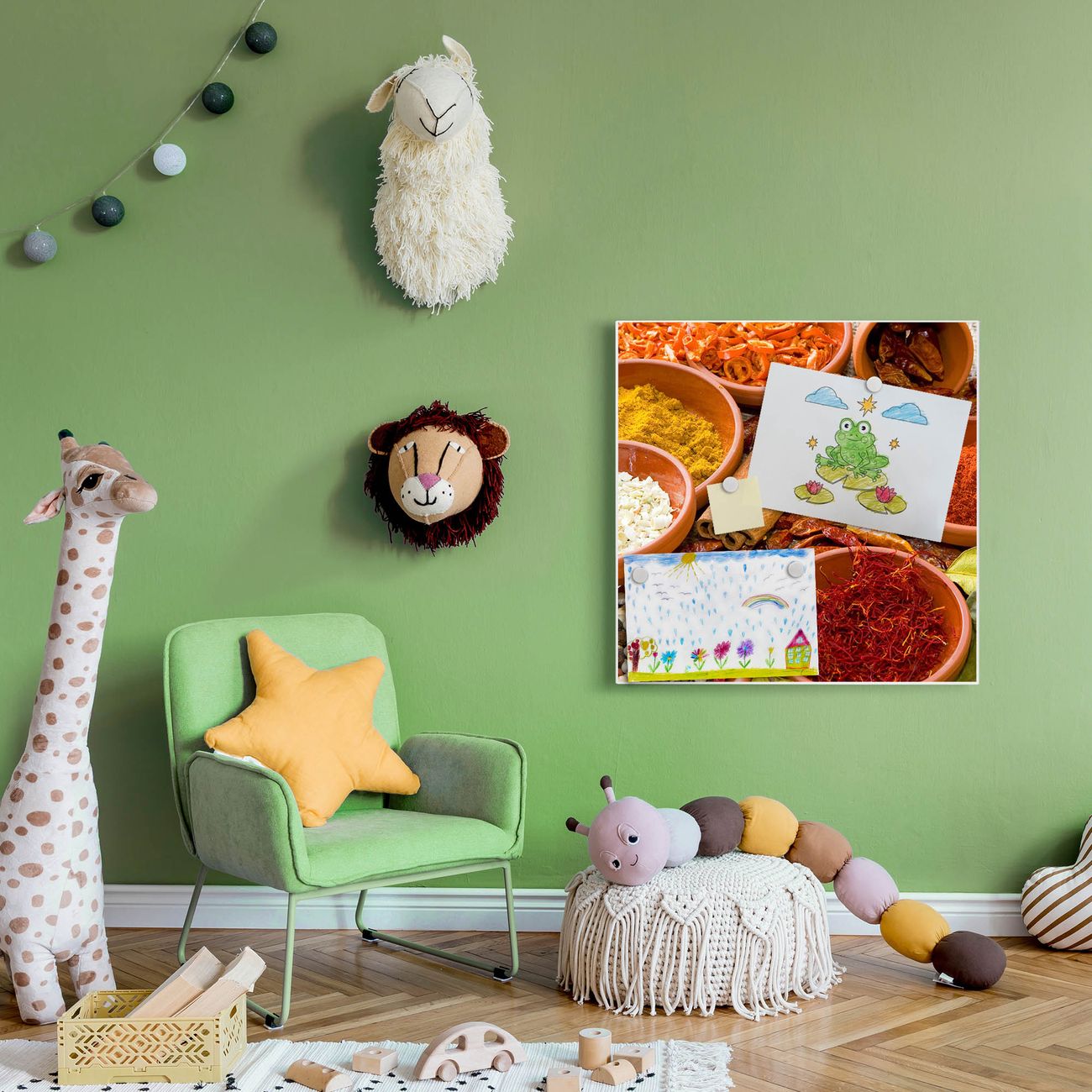 Die banjado Design Magnettafel mit Motiv Motiv Gewürze bringt Ordnung in Ihr Zettelchaos. Fotos, Termine, Notizen oder Rezepte lassen Sich hier stilvoll mit Magneten ordnen, Sie behalten alles im Blick. An der Pinnwand halten alle handelsüblichen Magnete. Mit dieser Pinnwand aus Metall haben Sie auch ohne Notizen und Magnete ein schönes Dekoelement. Das Quadratische Format bietet Ihnen ausreichend Platz um alle wichtigen Informationen im Blick zu behalten.