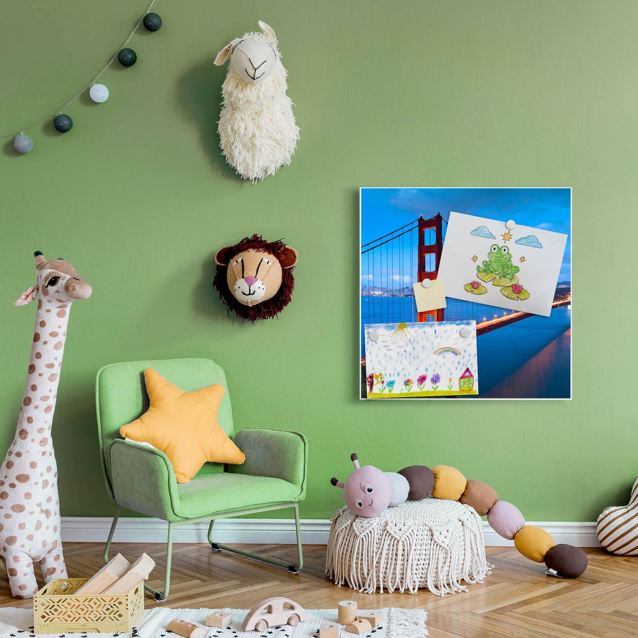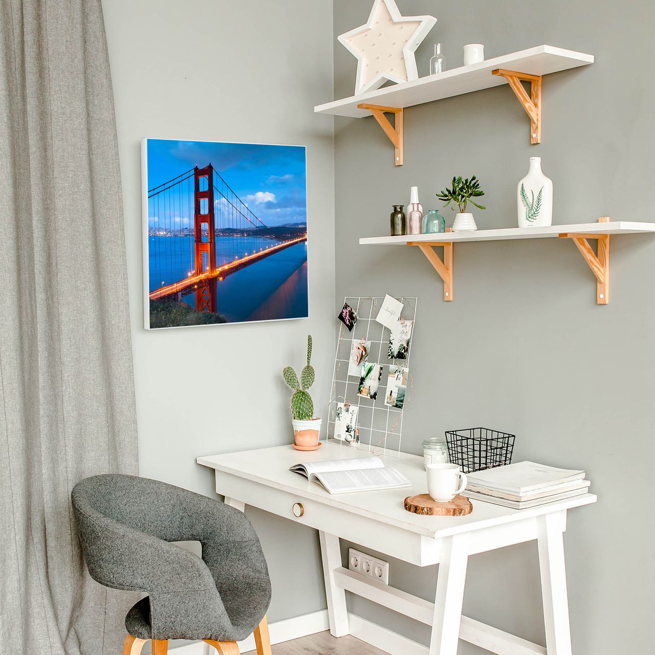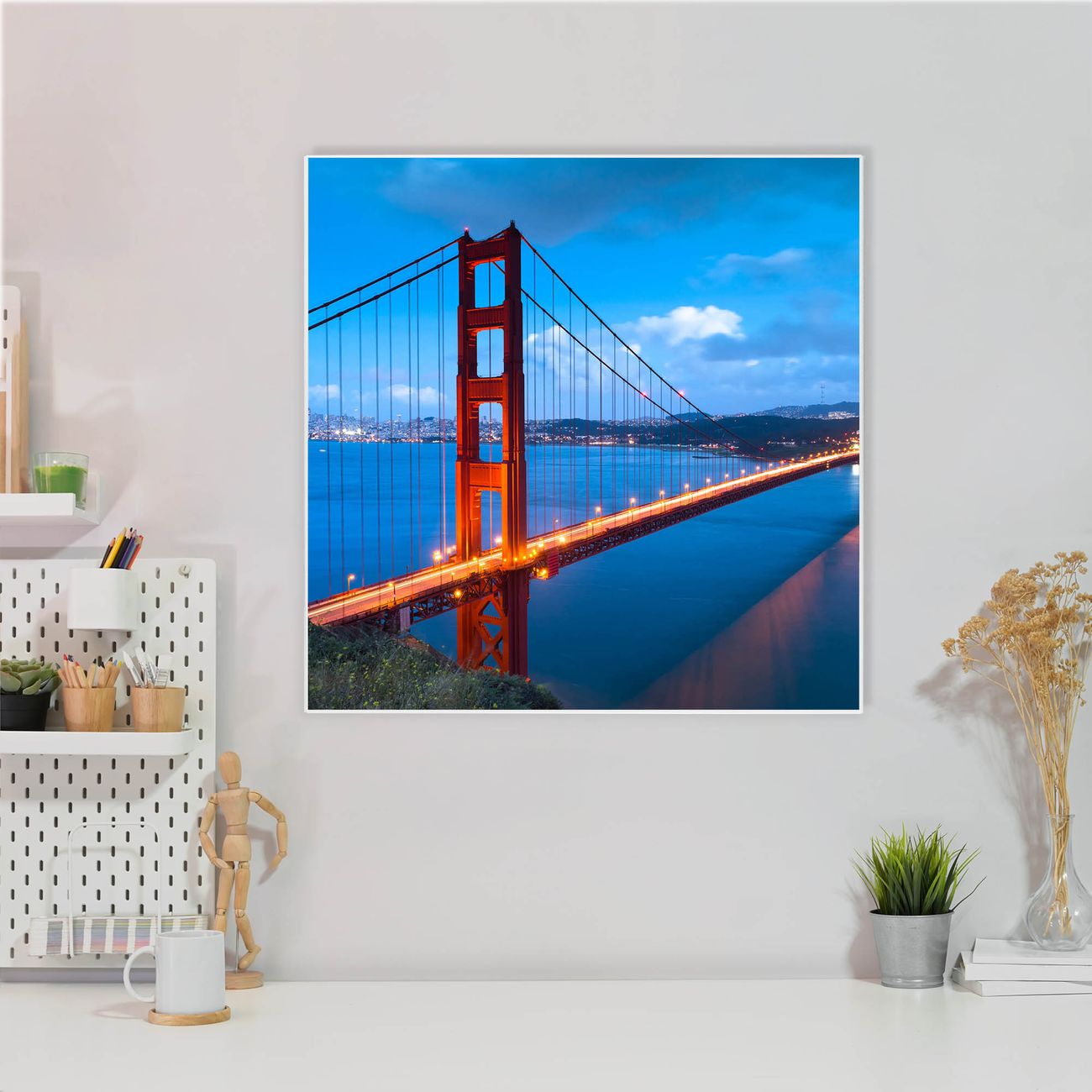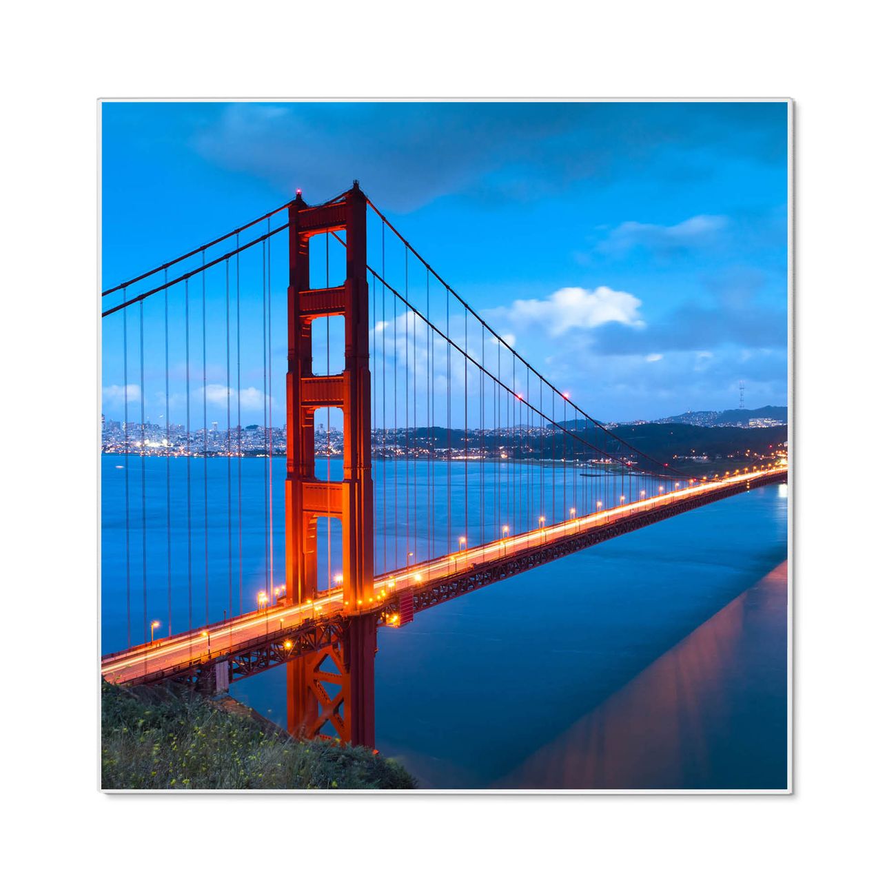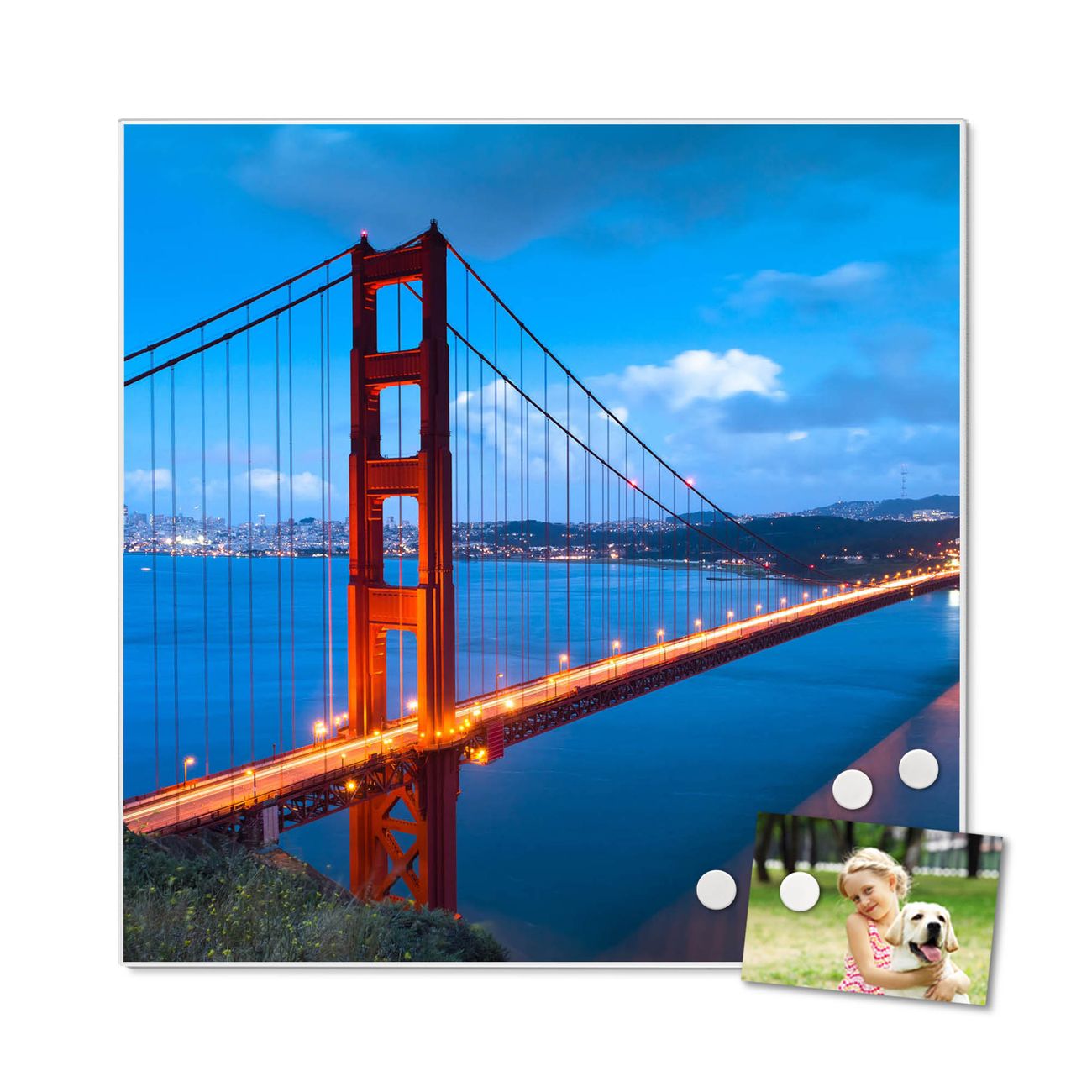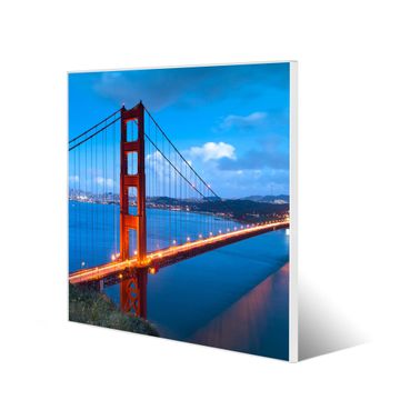 Motiv Golden Gate Bridge Nr. 10241 Größe: 50x50x2cm BxHxT Gewicht: ca. 1,5 kg Material: Stahl weiß lackiert, Premiumfolie mit Schutzlaminat Magnete: für Dekomagnete geeignet beschreibbar: Nein Format: Quadratisch Zubehör: 4 Magnete, Schrauben und Dübel