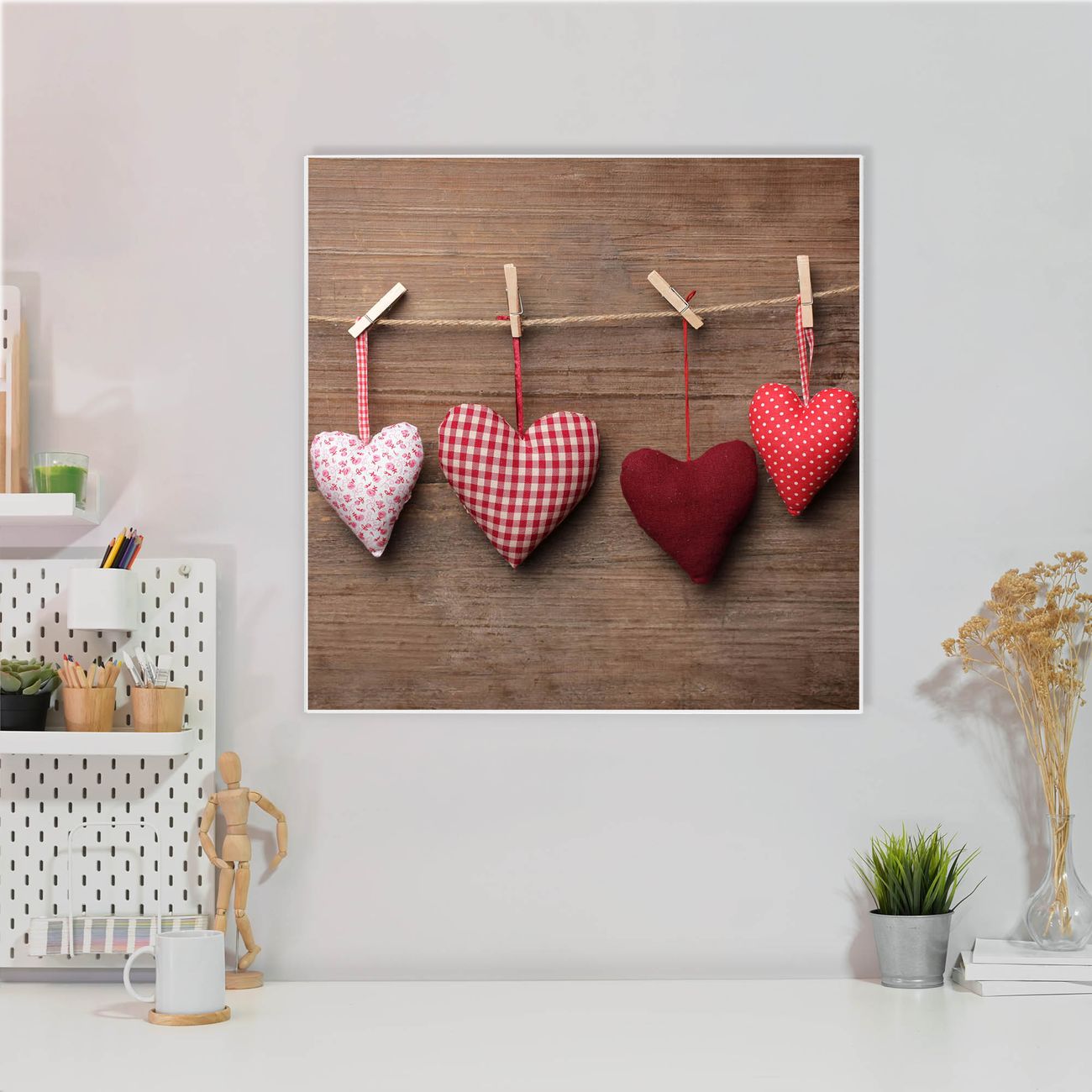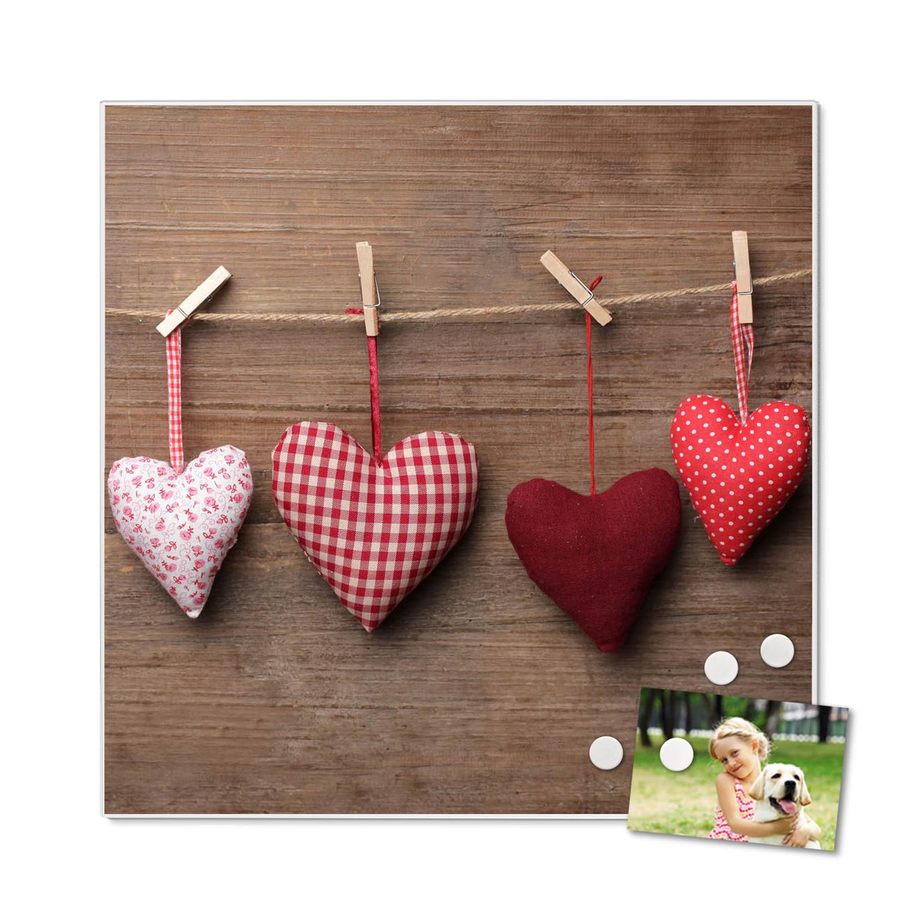Motiv Herzen Nr. 10210 Größe: 50x50x2cm BxHxT Gewicht: ca. 1,5 kg Material: Stahl weiß lackiert, Premiumfolie mit Schutzlaminat Magnete: für Dekomagnete geeignet beschreibbar: Nein Format: Quadratisch Zubehör: 4 Magnete, Schrauben und Dübel