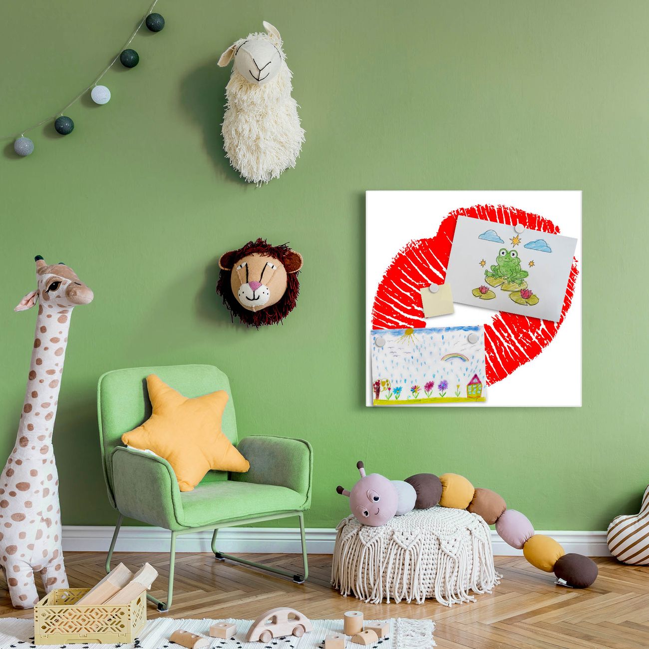 Die banjado Design Magnettafel mit Motiv Motiv Kussmund bringt Ordnung in Ihr Zettelchaos. Fotos, Termine, Notizen oder Rezepte lassen Sich hier stilvoll mit Magneten ordnen, Sie behalten alles im Blick. An der Pinnwand halten alle handelsüblichen Magnete. Mit dieser Pinnwand aus Metall haben Sie auch ohne Notizen und Magnete ein schönes Dekoelement. Das Quadratische Format bietet Ihnen ausreichend Platz um alle wichtigen Informationen im Blick zu behalten.