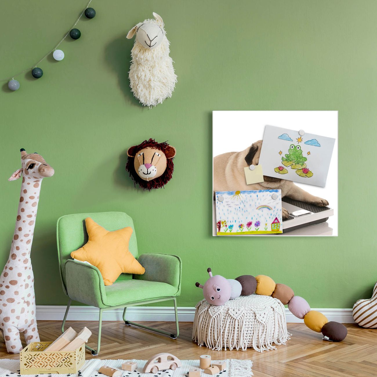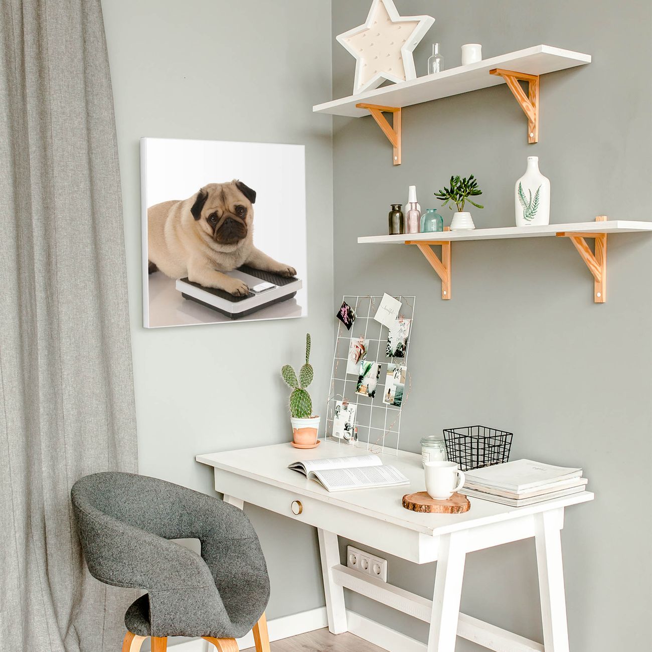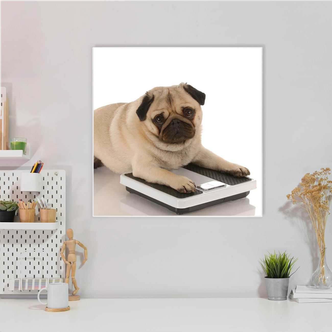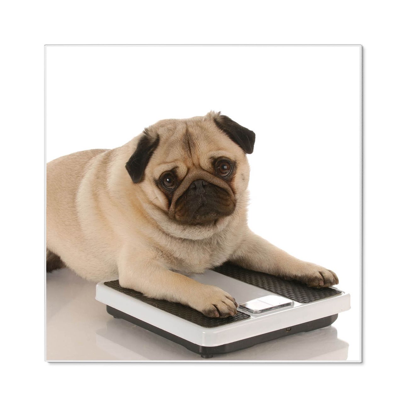 Motiv Mops Nr. 10032 Größe: 50x50x2cm BxHxT Gewicht: ca. 1,5 kg Material: Stahl weiß lackiert, Premiumfolie mit Schutzlaminat Magnete: für Dekomagnete geeignet beschreibbar: Nein Format: Quadratisch Zubehör: 4 Magnete, Schrauben und Dübel