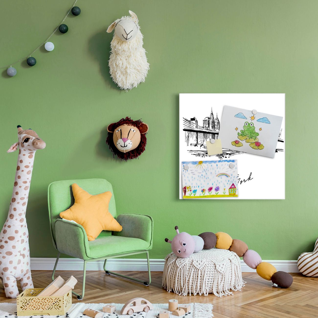 Die banjado Design Magnettafel mit Motiv Motiv New York Skizze bringt Ordnung in Ihr Zettelchaos. Fotos, Termine, Notizen oder Rezepte lassen Sich hier stilvoll mit Magneten ordnen, Sie behalten alles im Blick. An der Pinnwand halten alle handelsüblichen Magnete. Mit dieser Pinnwand aus Metall haben Sie auch ohne Notizen und Magnete ein schönes Dekoelement. Das Quadratische Format bietet Ihnen ausreichend Platz um alle wichtigen Informationen im Blick zu behalten.