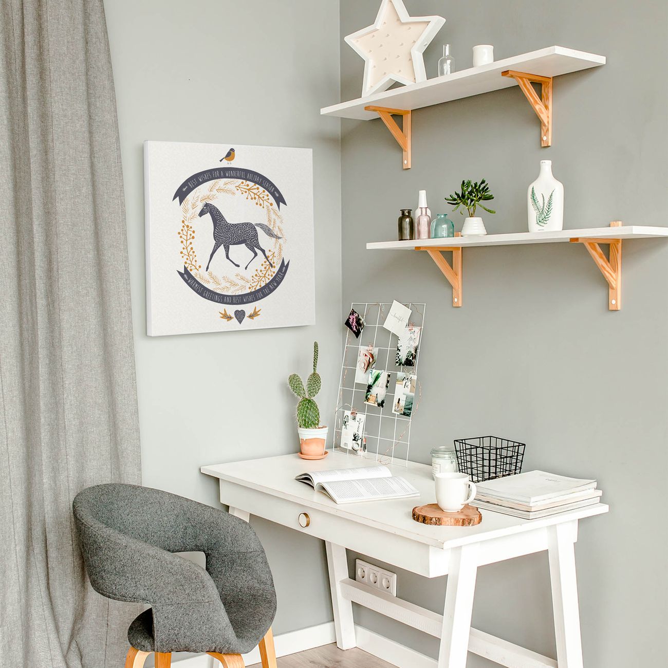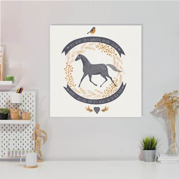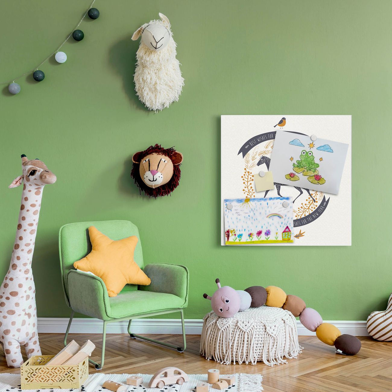 Motiv Pferd und Vogel Nr. 12646 Größe: 50x50x2cm BxHxT Gewicht: ca. 1,5 kg Material: Stahl weiß lackiert, Premiumfolie mit Schutzlaminat Magnete: für Dekomagnete geeignet beschreibbar: Nein Format: Quadratisch Zubehör: 4 Magnete, Schrauben und Dübel