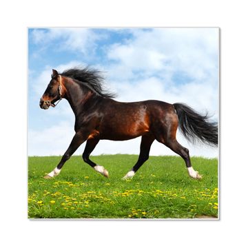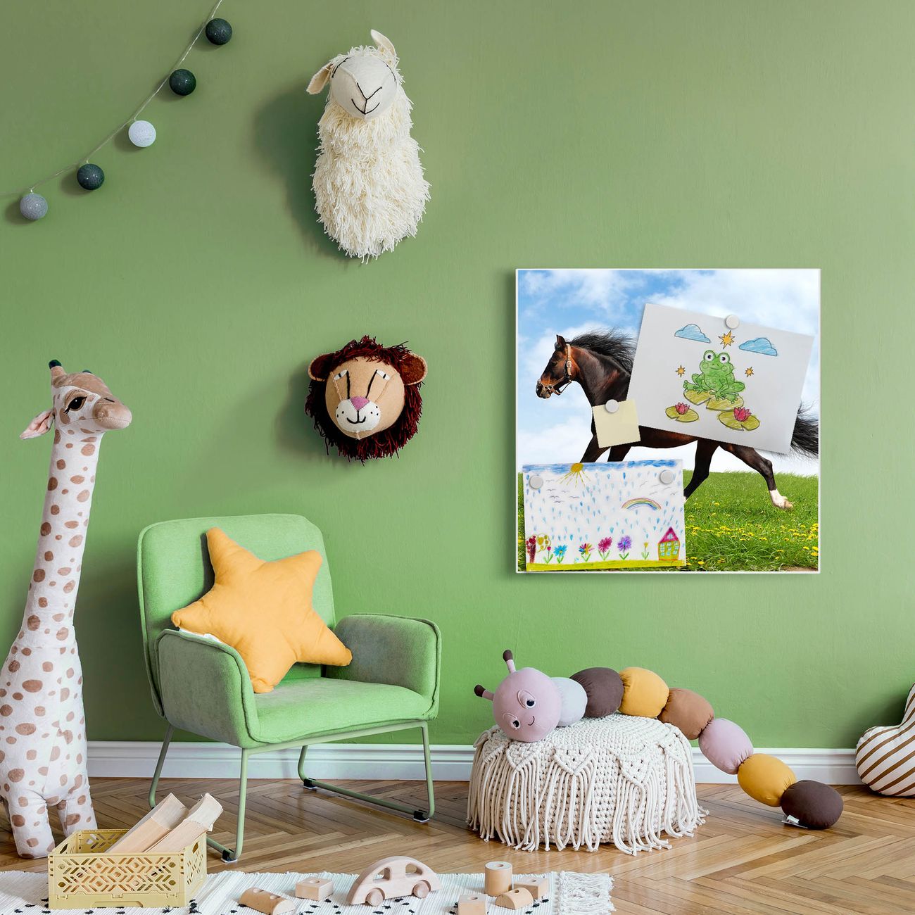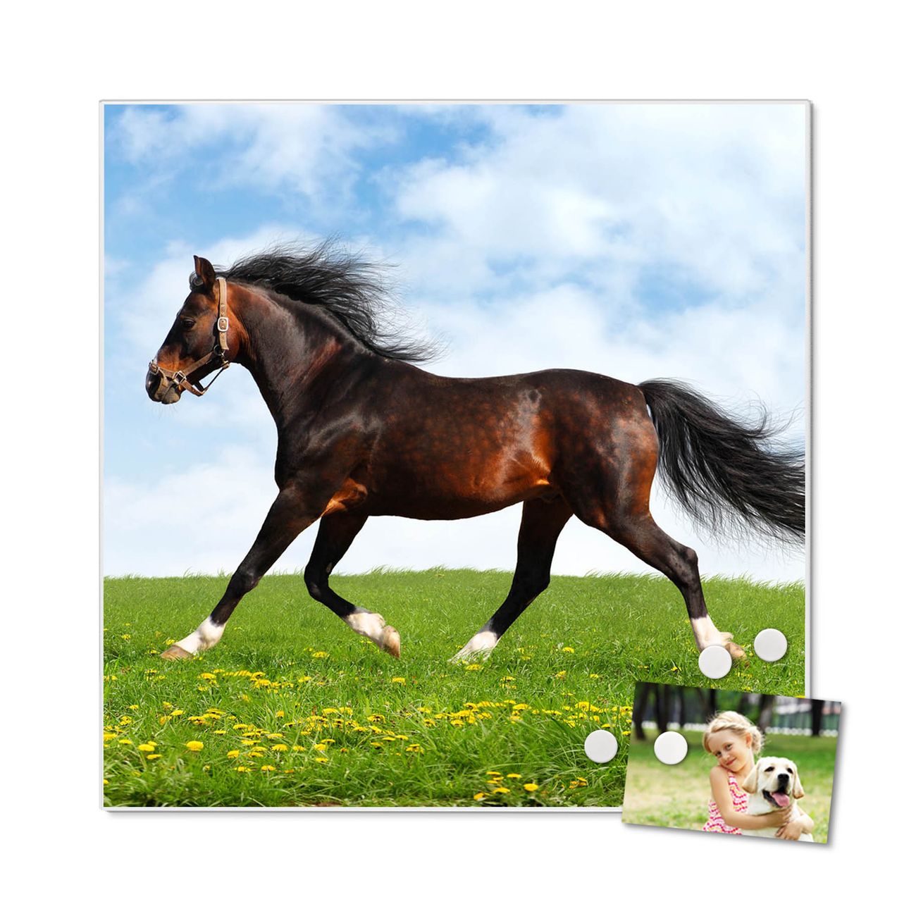 Die banjado Design Magnettafel mit Motiv Motiv Pferd bringt Ordnung in Ihr Zettelchaos. Fotos, Termine, Notizen oder Rezepte lassen Sich hier stilvoll mit Magneten ordnen, Sie behalten alles im Blick. An der Pinnwand halten alle handelsüblichen Magnete. Mit dieser Pinnwand aus Metall haben Sie auch ohne Notizen und Magnete ein schönes Dekoelement. Das Quadratische Format bietet Ihnen ausreichend Platz um alle wichtigen Informationen im Blick zu behalten.