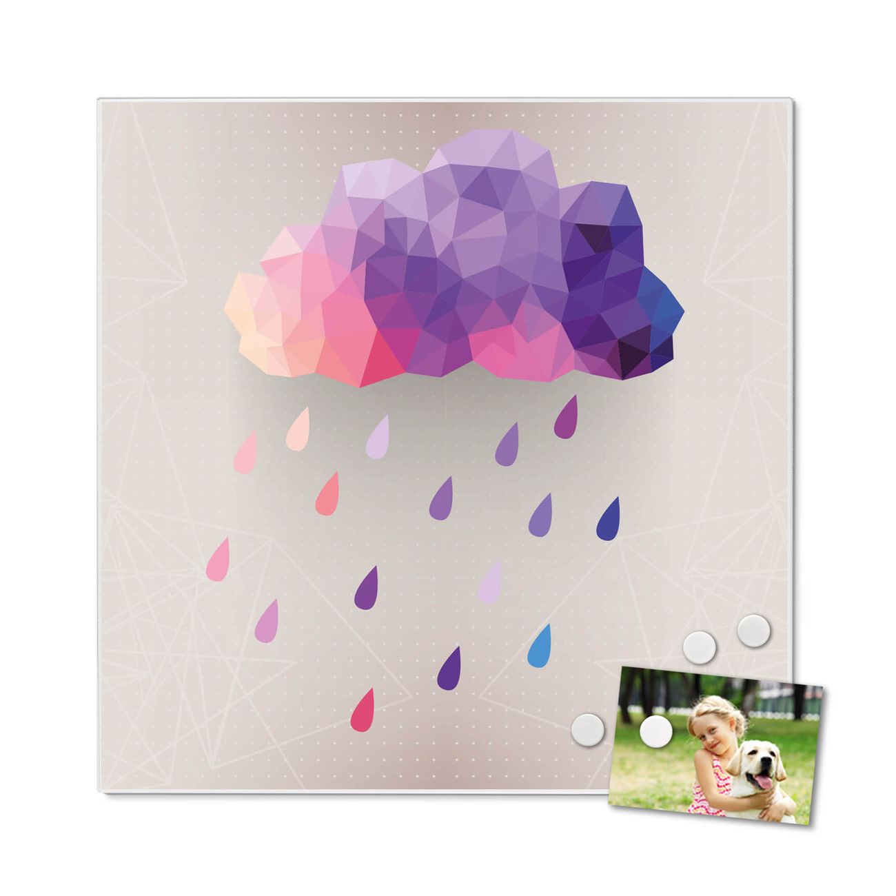 Motiv Regenwolke Nr. 12586 Größe: 50x50x2cm BxHxT Gewicht: ca. 1,5 kg Material: Stahl weiß lackiert, Premiumfolie mit Schutzlaminat Magnete: für Dekomagnete geeignet beschreibbar: Nein Format: Quadratisch Zubehör: 4 Magnete, Schrauben und Dübel
