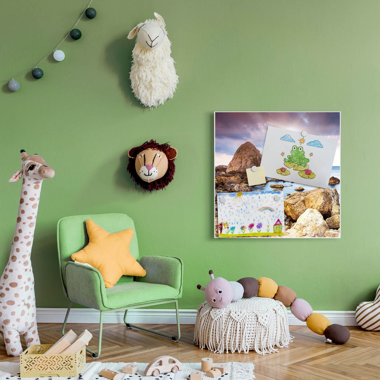 Die banjado Design Magnettafel mit Motiv Motiv Steinbucht bringt Ordnung in Ihr Zettelchaos. Fotos, Termine, Notizen oder Rezepte lassen Sich hier stilvoll mit Magneten ordnen, Sie behalten alles im Blick. An der Pinnwand halten alle handelsüblichen Magnete. Mit dieser Pinnwand aus Metall haben Sie auch ohne Notizen und Magnete ein schönes Dekoelement. Das Quadratische Format bietet Ihnen ausreichend Platz um alle wichtigen Informationen im Blick zu behalten.