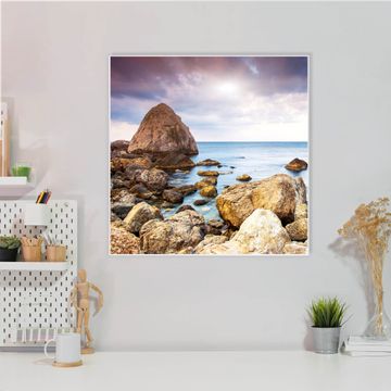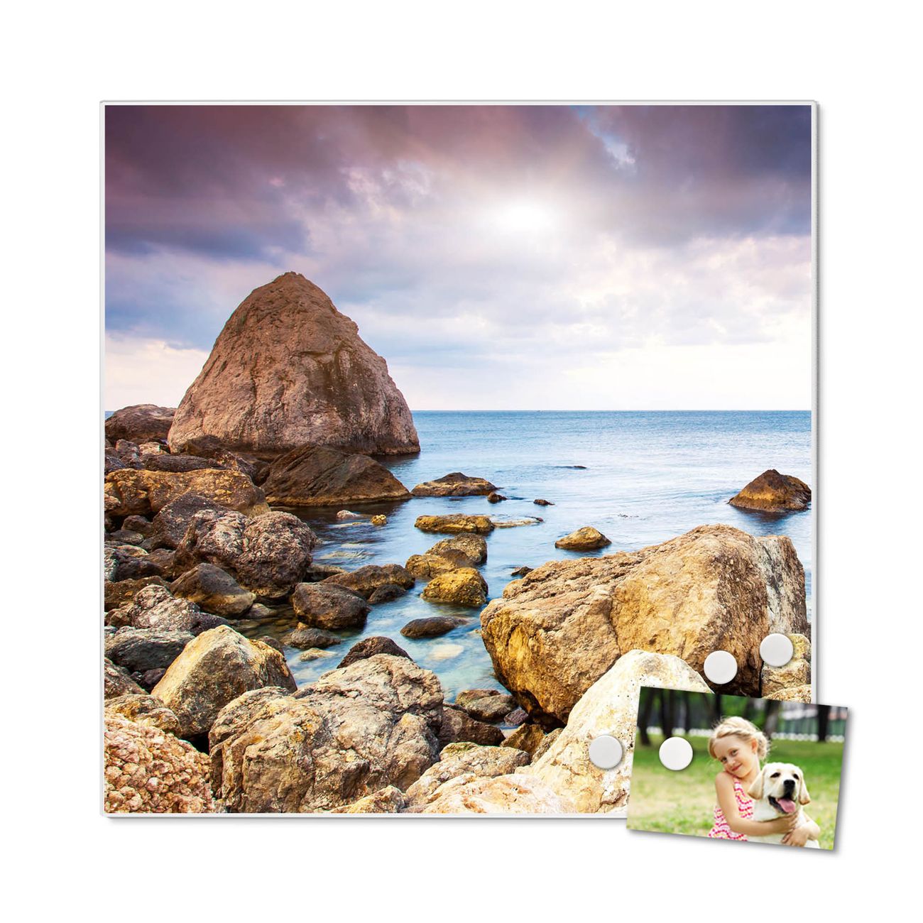 Motiv Steinbucht Nr. 12333 Größe: 50x50x2cm BxHxT Gewicht: ca. 1,5 kg Material: Stahl weiß lackiert, Premiumfolie mit Schutzlaminat Magnete: für Dekomagnete geeignet beschreibbar: Nein Format: Quadratisch Zubehör: 4 Magnete, Schrauben und Dübel