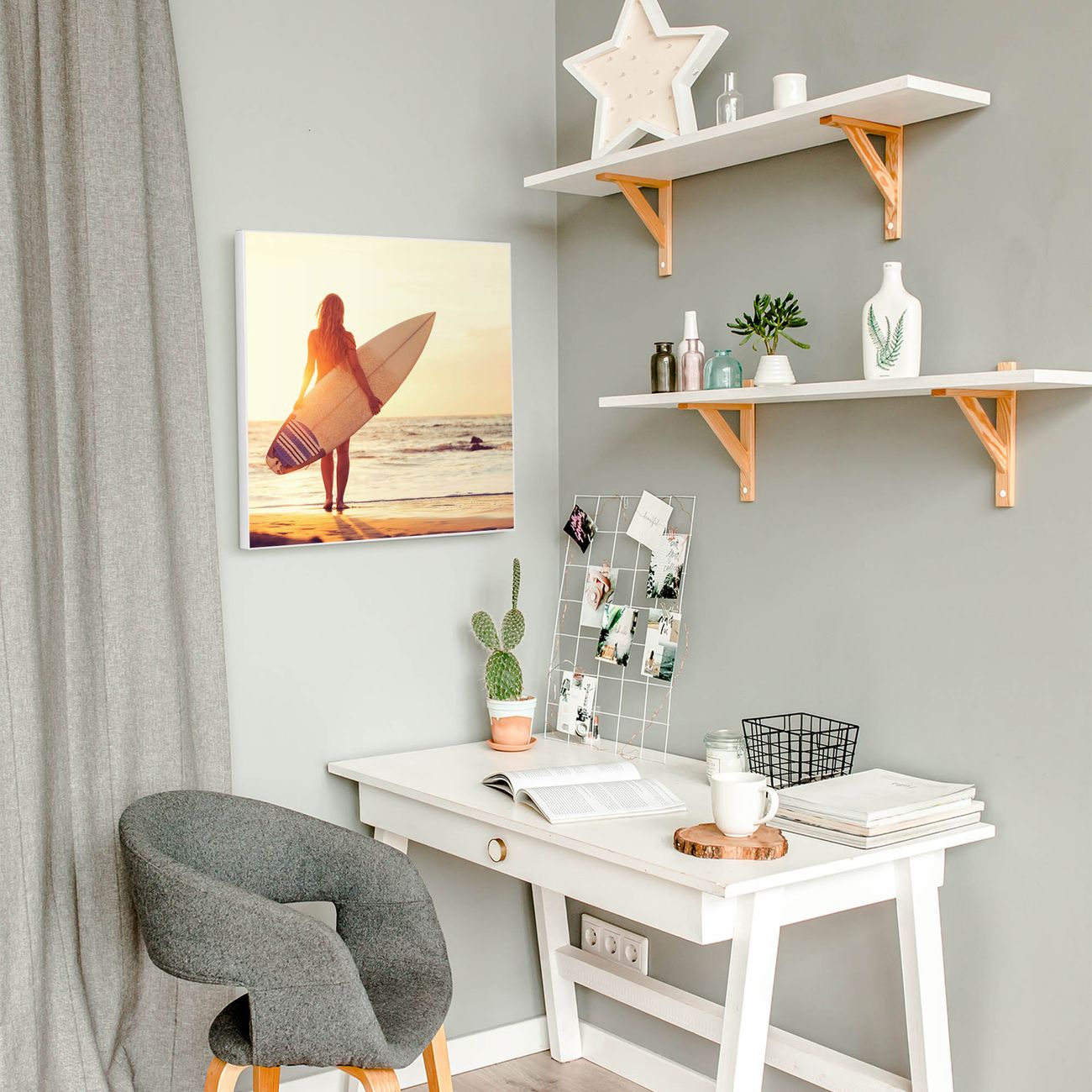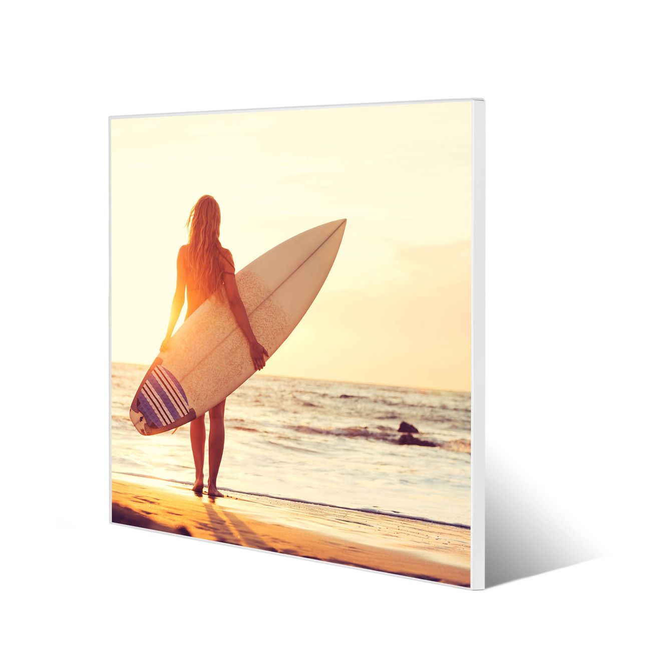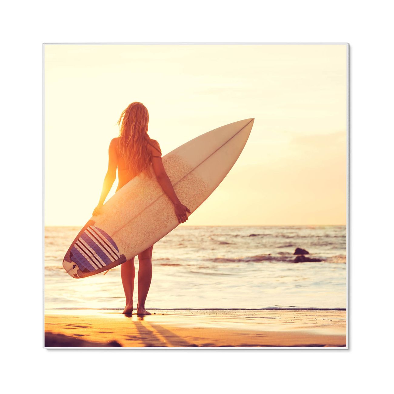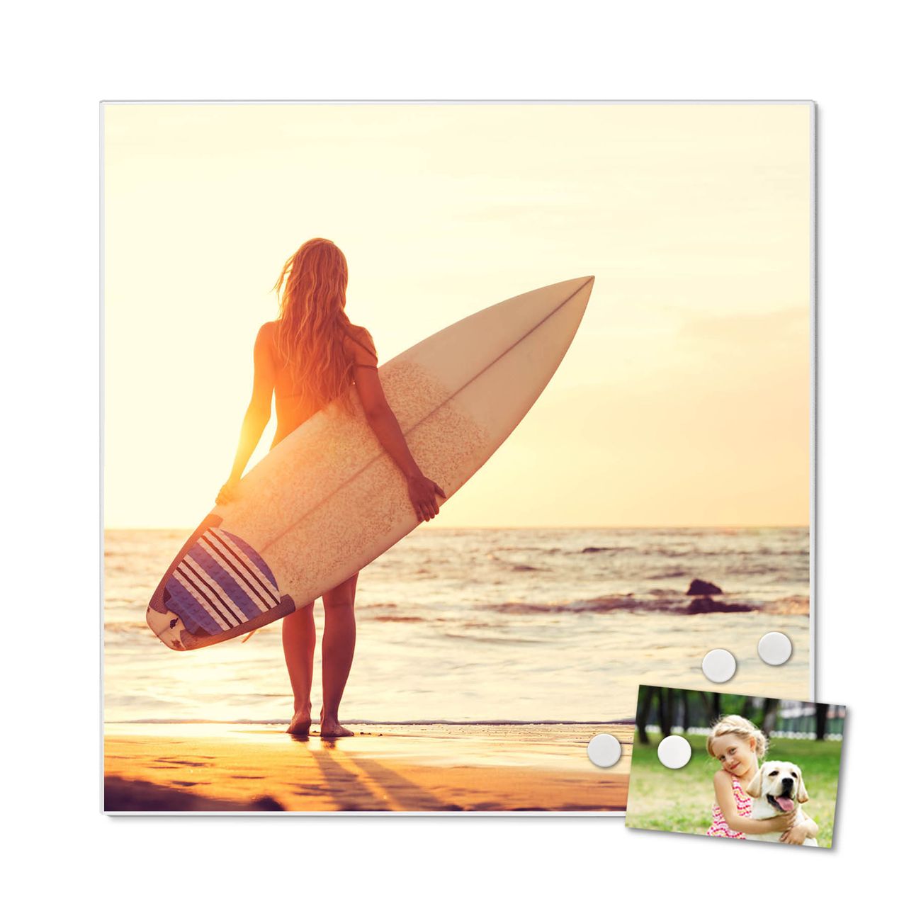 Motiv Surfer Girl Nr. 12536 Größe: 50x50x2cm BxHxT Gewicht: ca. 1,5 kg Material: Stahl weiß lackiert, Premiumfolie mit Schutzlaminat Magnete: für Dekomagnete geeignet beschreibbar: Nein Format: Quadratisch Zubehör: 4 Magnete, Schrauben und Dübel