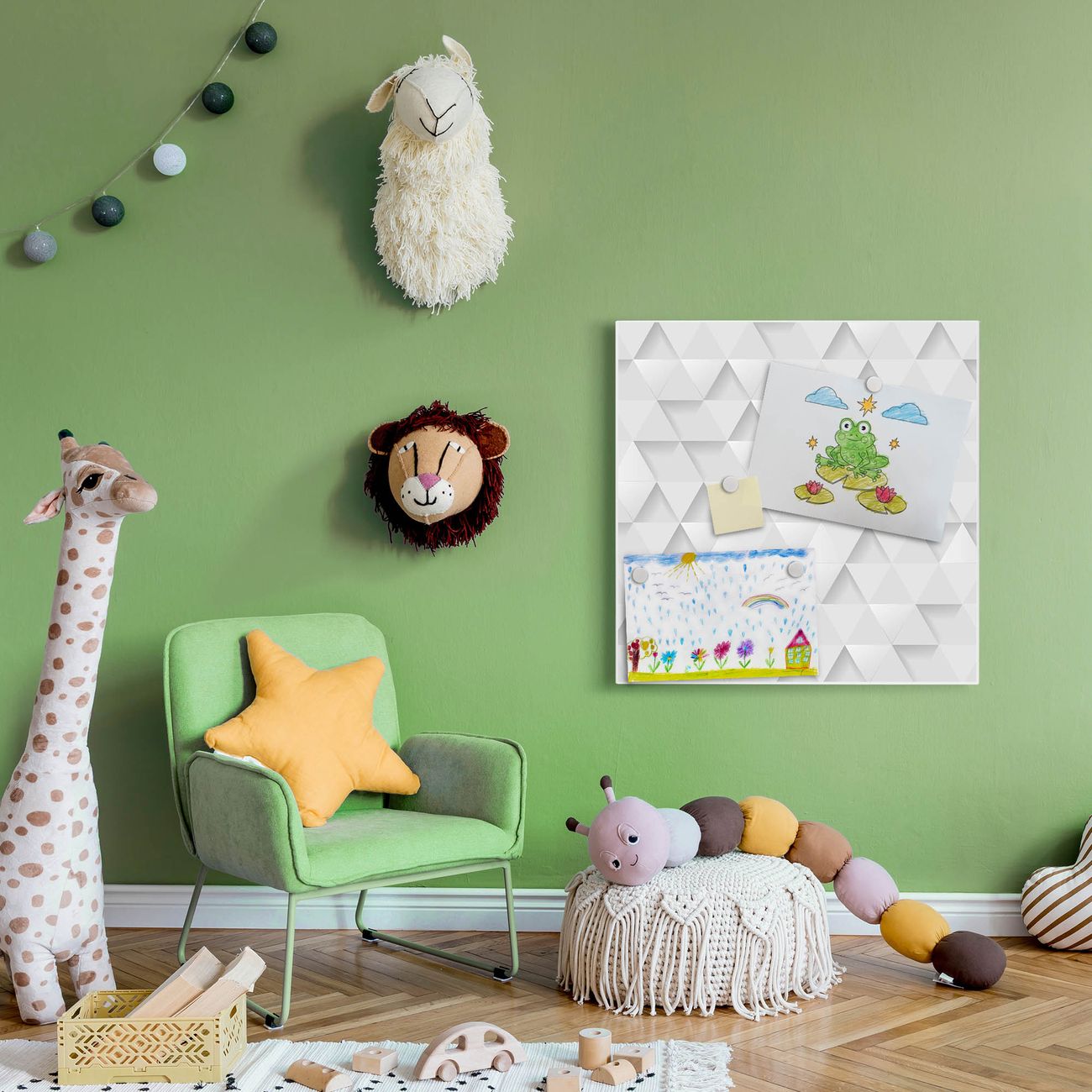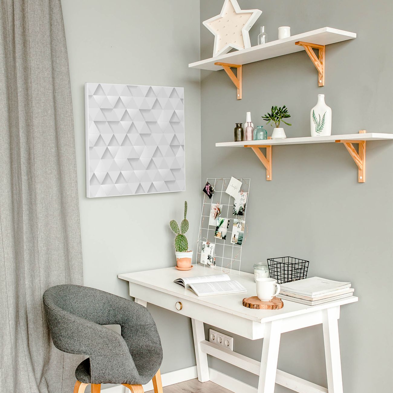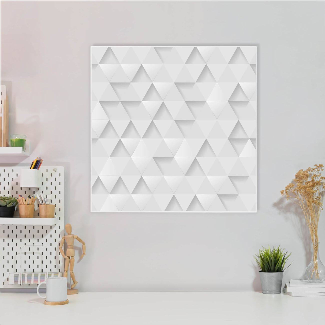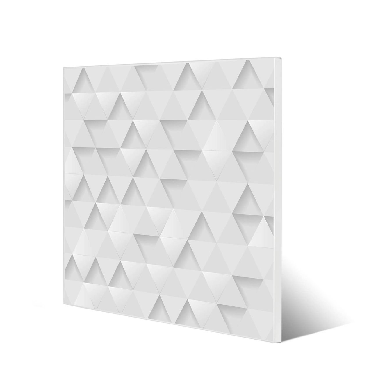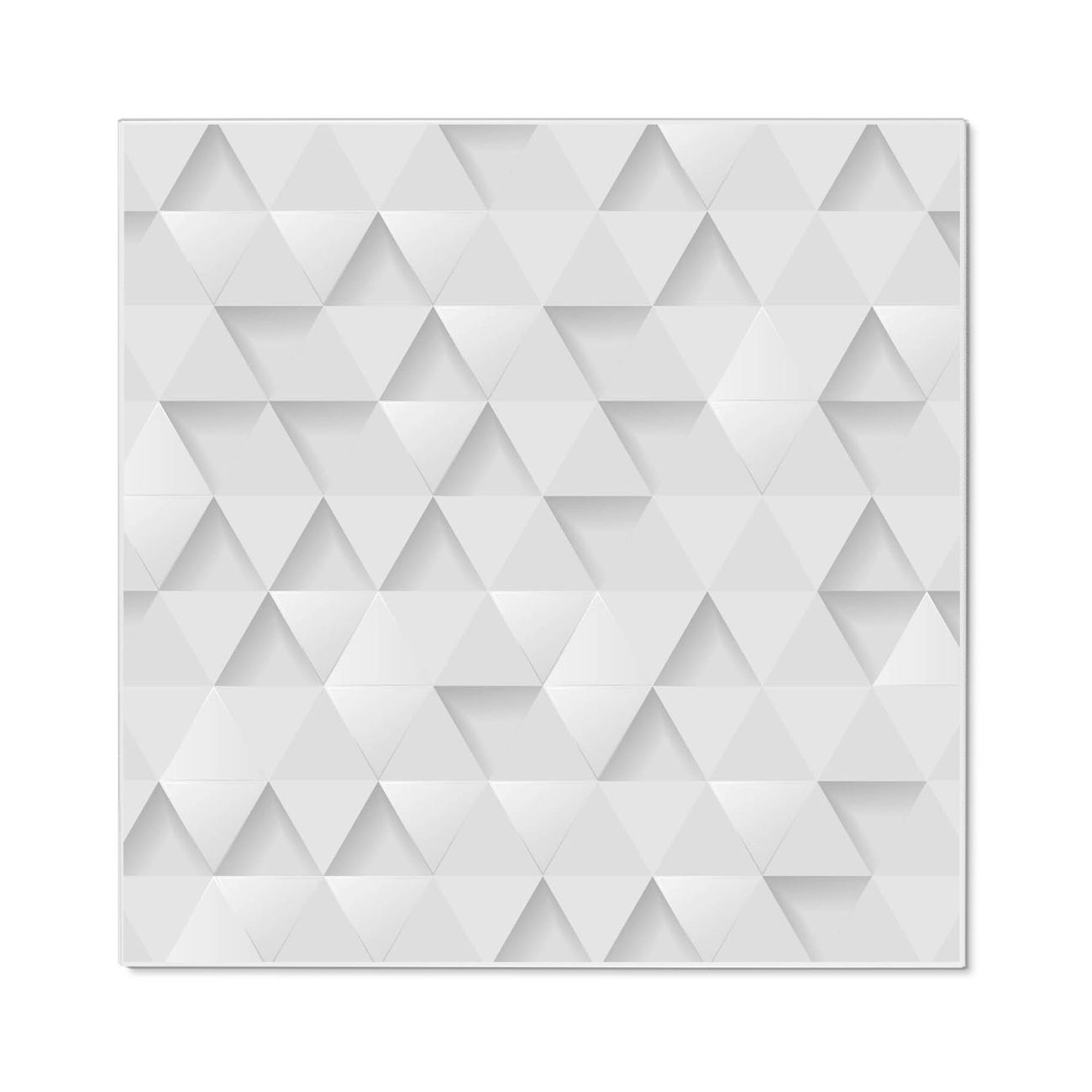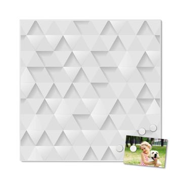 Motiv Weisse Dreiecke Nr. 12495 Größe: 50x50x2cm BxHxT Gewicht: ca. 1,5 kg Material: Stahl weiß lackiert, Premiumfolie mit Schutzlaminat Magnete: für Dekomagnete geeignet beschreibbar: Nein Format: Quadratisch Zubehör: 4 Magnete, Schrauben und Dübel