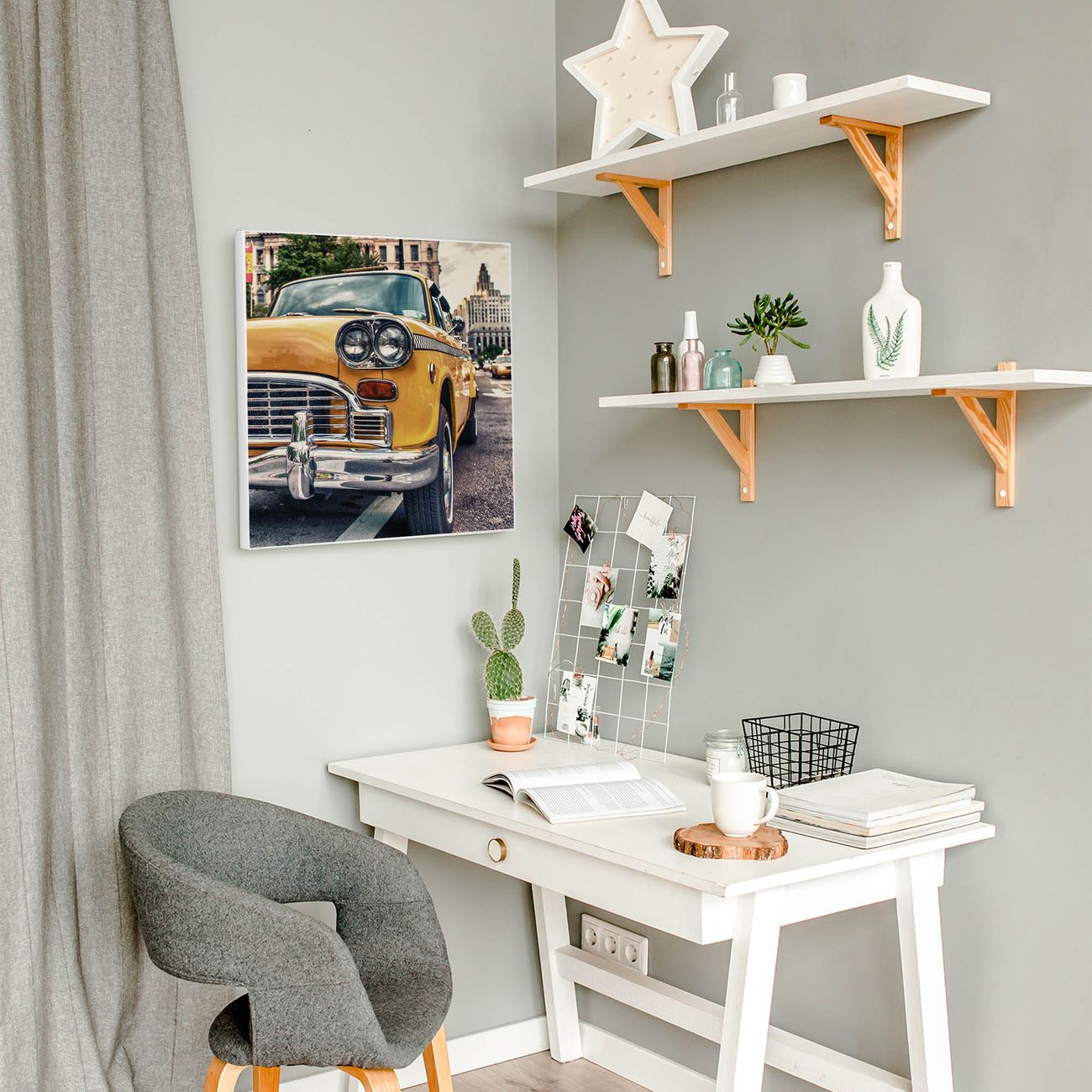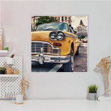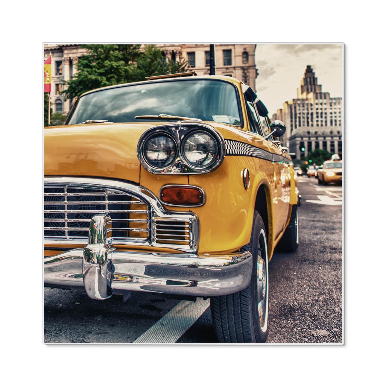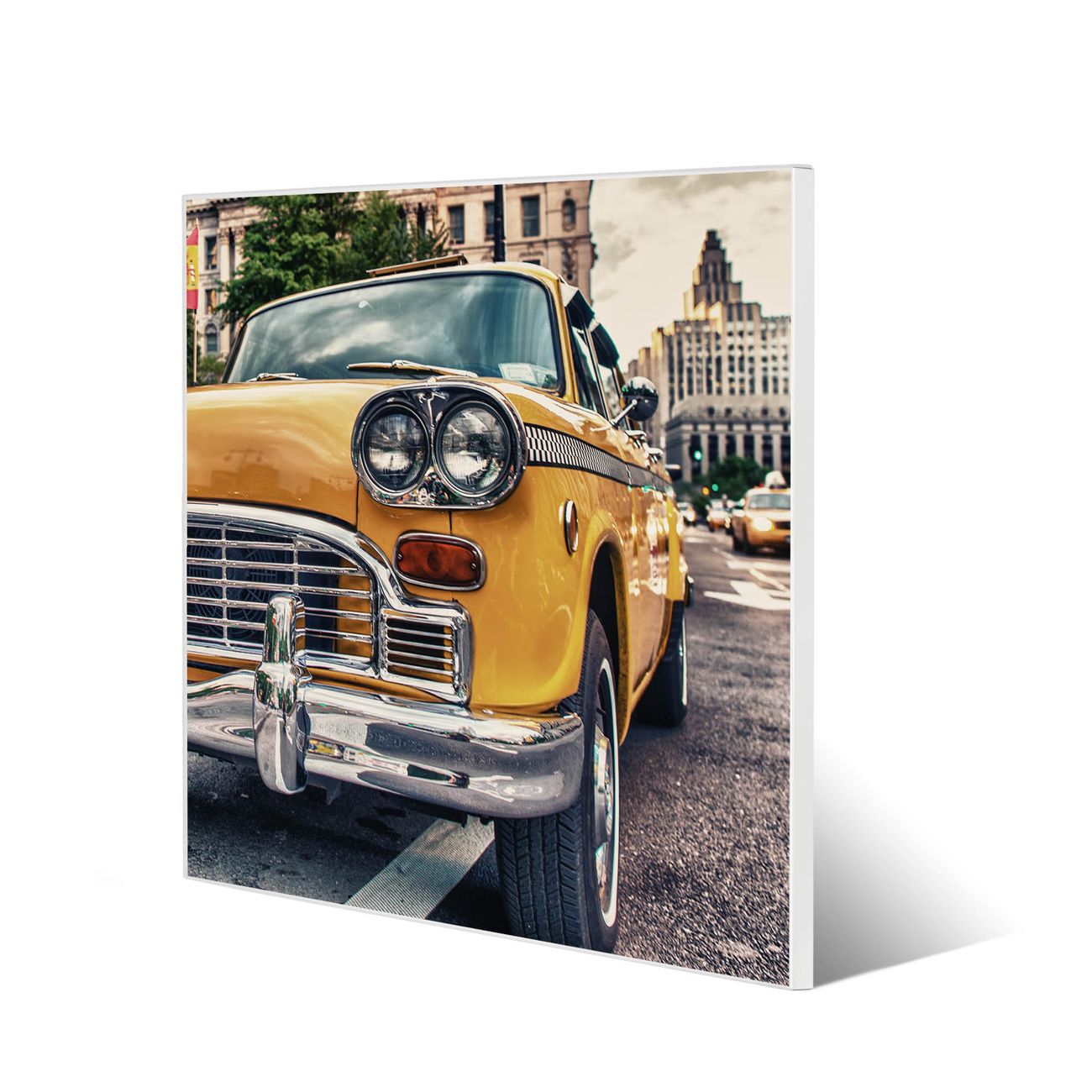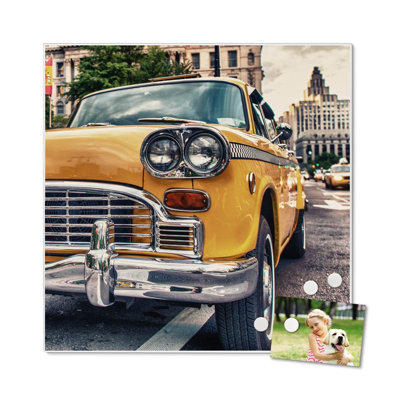 Motiv Yellow Cab Nr. 12418 Größe: 50x50x2cm BxHxT Gewicht: ca. 1,5 kg Material: Stahl weiß lackiert, Premiumfolie mit Schutzlaminat Magnete: für Dekomagnete geeignet beschreibbar: Nein Format: Quadratisch Zubehör: 4 Magnete, Schrauben und Dübel