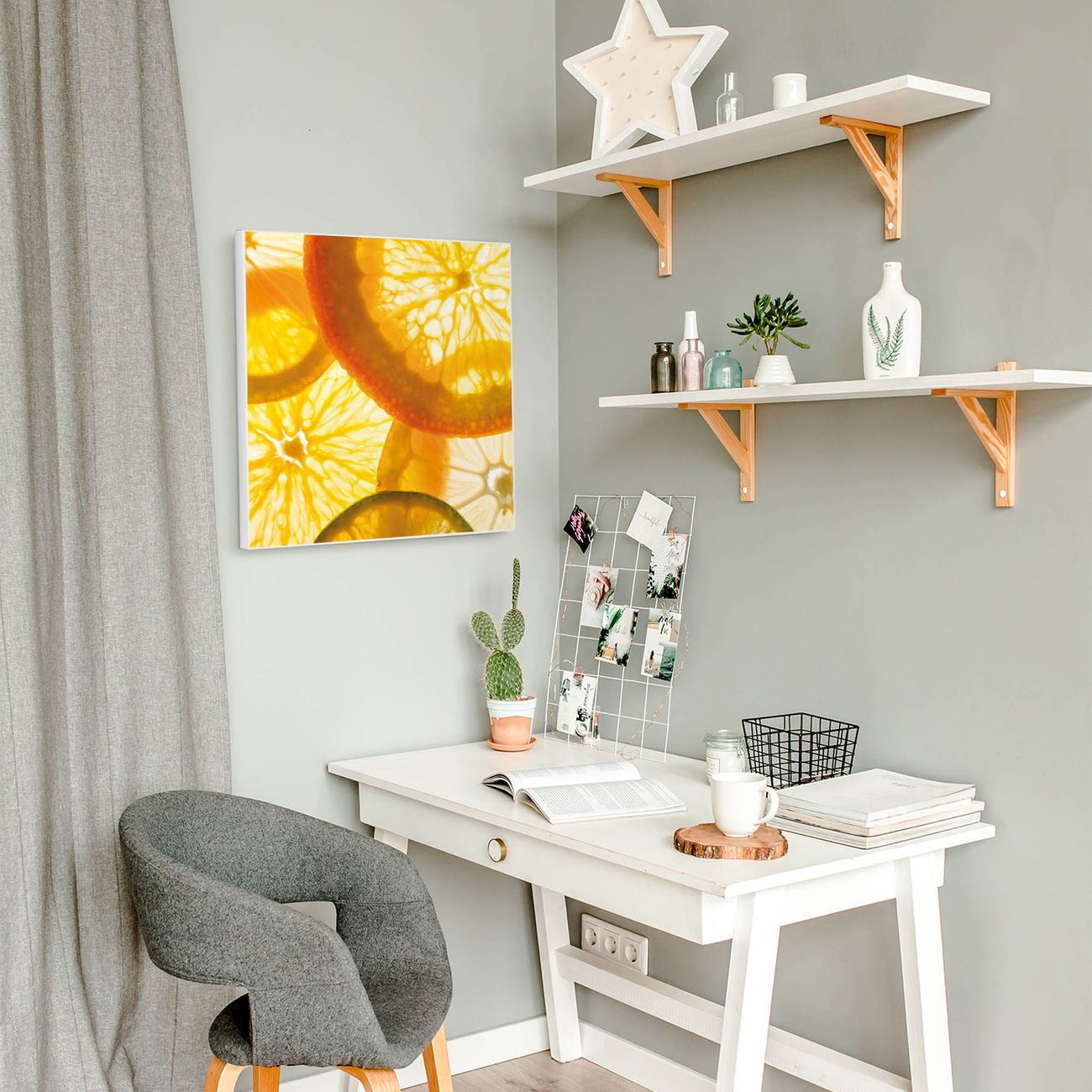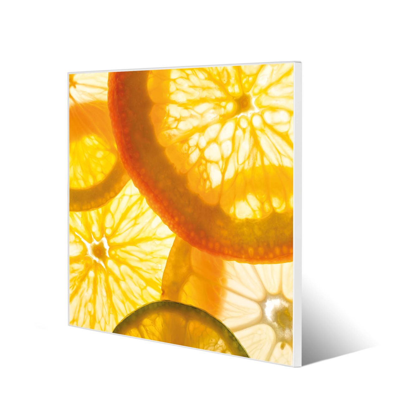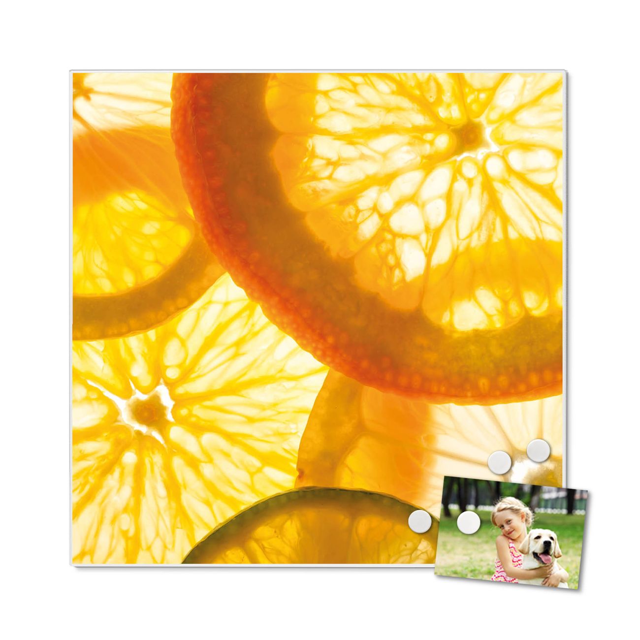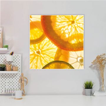 Motiv Zitrusfrüchte Nr. 11688 Größe: 50x50x2cm BxHxT Gewicht: ca. 1,5 kg Material: Stahl weiß lackiert, Premiumfolie mit Schutzlaminat Magnete: für Dekomagnete geeignet beschreibbar: Nein Format: Quadratisch Zubehör: 4 Magnete, Schrauben und Dübel