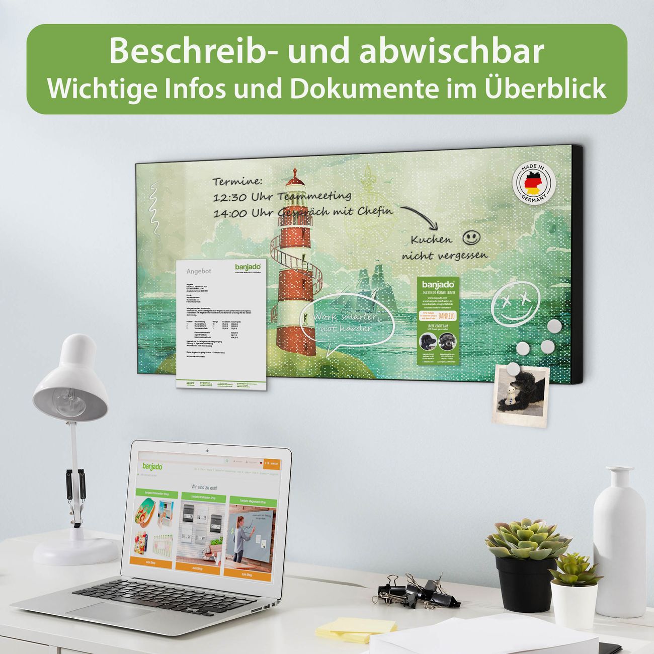 FUNKTION:  Die banjado Magnettafel mit Motiv Alter Leuchtturm Motiv bringt Ordnung in Ihr Zettelchaos. Fotos, Termine, Notizen oder Rezepte lassen Sich hier stilvoll mit Magneten ordnen, Sie behalten alles im Blick. An der Design Magnetwand halten alle handesüblichen Magnete. DESIGN:  Die Metall Pinnwand mit dem Motiv Motiv Alter Leuchtturm ist ein eleganter Begleiter im Alltag. Mit dieser Magnettafel haben Sie auch ohne Notizen und Magnete ein schönes Dekoelement. Das Format bietet Ihnen ausreichend Platz um alle wichtigen Informationen im Blick zu behalten. DETAILS: Die magnetische Pinnwand besteht aus silber-grau, weiß oder schwarz lackiertem Stahl. Sie hat eine Größe von 78cm x 37cm. Es befinden sich auf der Rückseite vorgefertigte Löcher die eine schnelle und unkomplizierte Anbringung ermöglichen. Das Motiv ist mit einem seidenmatten Laminat versehen und schützt so zusätzlich vor Kratzern. NUTZEN:  Sie können diese Magnettafel wunderbar als Wandbild nutzen, es halten alle handelsüblichen Magneten daran. Das Memoboard ist mit einem feuchten Lappen oder Schwamm abwischbar. Sie finden bei uns eine große Auswahl an passenden Magneten. BANJADO:  Wir sind ein kleines Team aus dem Herzen von Sachsen. Wir fertigen alle Artikel von Hand für Sie an, Sie erhalten keine preiswerte Importware. Auf Wunsch können Sie auch Ihr eigenes Foto auf die Magnettafel aufbringen, schreiben Sie uns an. Herzlichst, Ihr banjado-Team