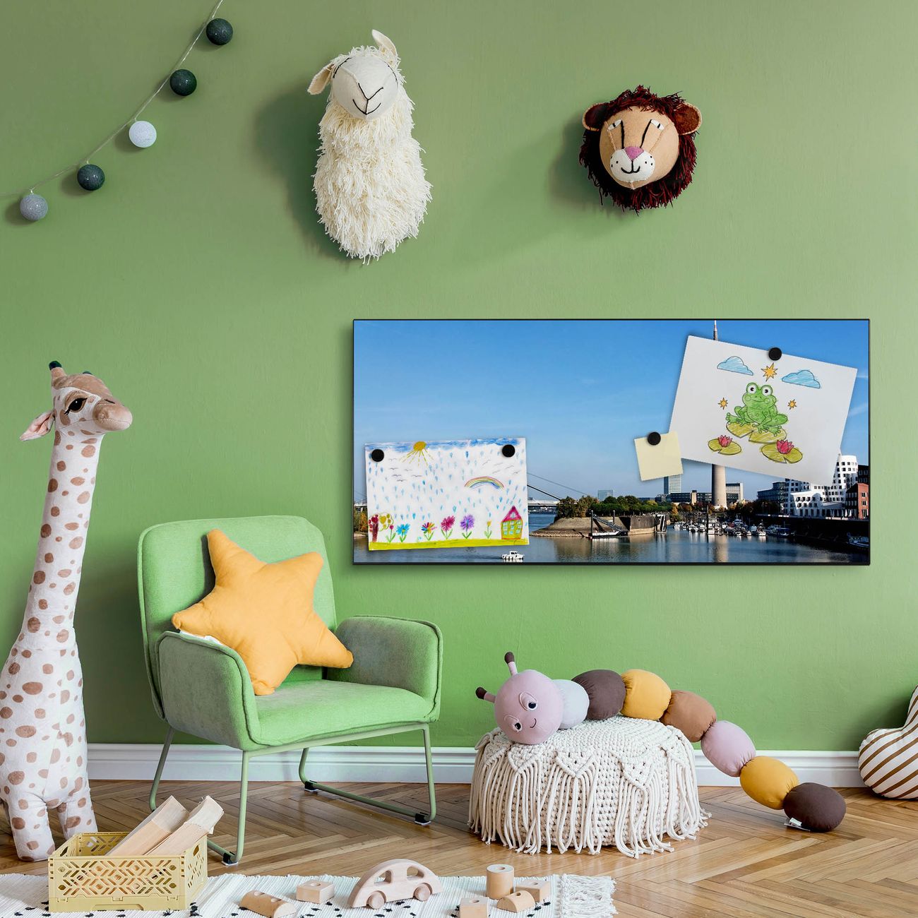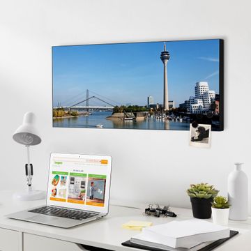 FUNKTION:  Die banjado Magnettafel mit Motiv Düsseldorf Motiv bringt Ordnung in Ihr Zettelchaos. Fotos, Termine, Notizen oder Rezepte lassen Sich hier stilvoll mit Magneten ordnen, Sie behalten alles im Blick. An der Design Magnetwand halten alle handesüblichen Magnete. DESIGN:  Die Metall Pinnwand mit dem Motiv Motiv Düsseldorf ist ein eleganter Begleiter im Alltag. Mit dieser Magnettafel haben Sie auch ohne Notizen und Magnete ein schönes Dekoelement. Das Format bietet Ihnen ausreichend Platz um alle wichtigen Informationen im Blick zu behalten. DETAILS: Die magnetische Pinnwand besteht aus silber-grau, weiß oder schwarz lackiertem Stahl. Sie hat eine Größe von 78cm x 37cm. Es befinden sich auf der Rückseite vorgefertigte Löcher die eine schnelle und unkomplizierte Anbringung ermöglichen. Das Motiv ist mit einem seidenmatten Laminat versehen und schützt so zusätzlich vor Kratzern. NUTZEN:  Sie können diese Magnettafel wunderbar als Wandbild nutzen, es halten alle handelsüblichen Magneten daran. Das Memoboard ist mit einem feuchten Lappen oder Schwamm abwischbar. Sie finden bei uns eine große Auswahl an passenden Magneten. BANJADO:  Wir sind ein kleines Team aus dem Herzen von Sachsen. Wir fertigen alle Artikel von Hand für Sie an, Sie erhalten keine preiswerte Importware. Auf Wunsch können Sie auch Ihr eigenes Foto auf die Magnettafel aufbringen, schreiben Sie uns an. Herzlichst, Ihr banjado-Team