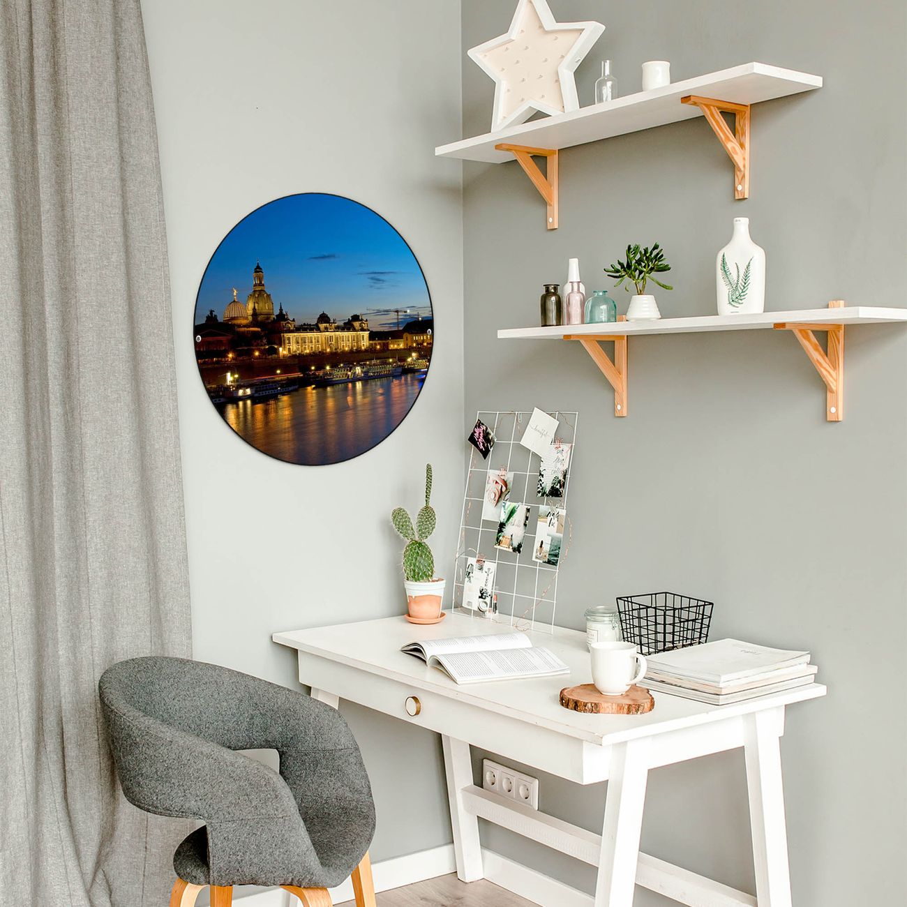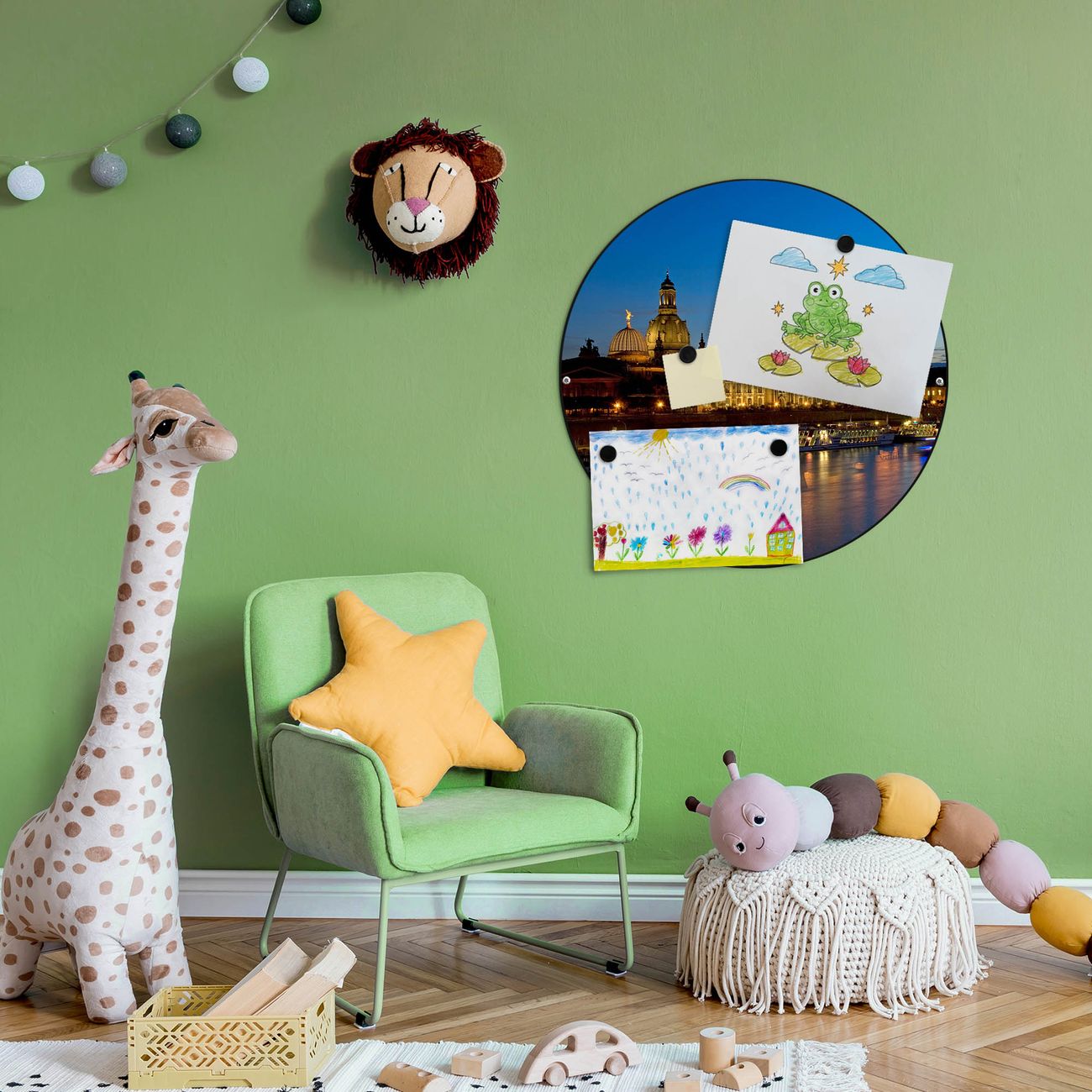 FUNKTION / DESIGN Die banjado Magnettafel mit dem Motiv Motiv Altstadt Dresden bringt Ordnung in Ihr Zettelchaos. Fotos, Termine, Notizen oder Rezepte lassen Sich hier stilvoll mit Magneten ordnen, Sie behalten alles im Blick. Die Design Magnetwand ist beschreibbar und wieder abwischbar. Mit dieser Pinnwand haben Sie auch ohne Notizen und Magneten ein schönes Dekoelement. Das Format bietet Ihnen ausreichend Platz um alle wichtigen Informationen im Blick zu behalten. DETAILS / NUTZEN Die magnetische Metall Pinnwand besteht aus schwarz lackiertem Stahl. Sie hat einen Durchmesser von 47cm. Es befinden sich an den Seiten zwei vorgefertigte Löcher die eine schnelle und unkomplizierte Anbringung ermöglichen. Das Motiv ist mit einem seidenmatten Laminat versehen und schützt so zusätzlich vor Kratzern. Es halten alle handelsüblichen Magneten daran. Wir sind ein kleines Team aus dem Herzen von Sachsen. Wir fertigen alle Artikel von Hand für Sie an, Sie erhalten keine preiswerte Importware. Auf Wunsch können Sie auch Ihr eigenes Foto auf die Magnettafel aufbringen, schreiben Sie uns an.
