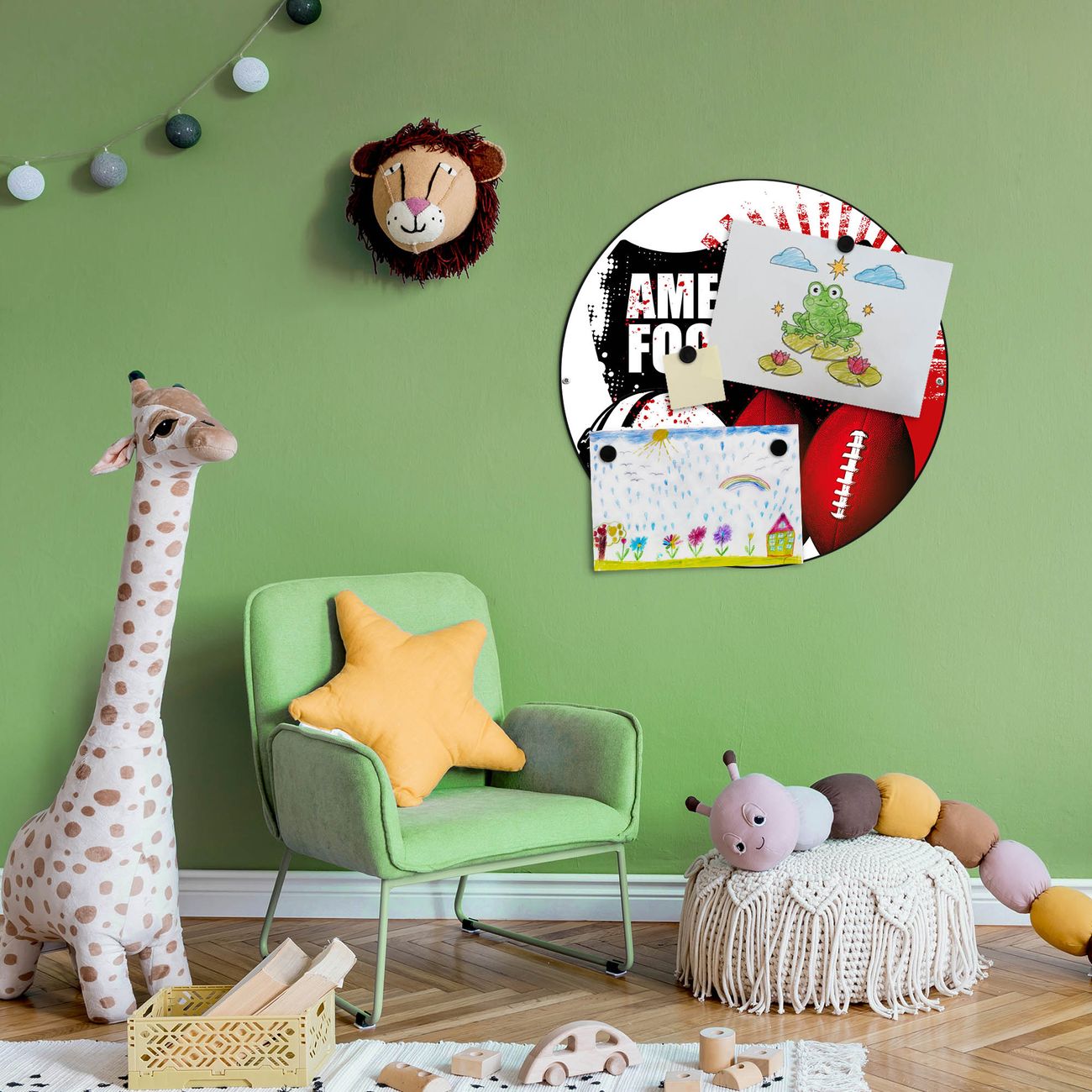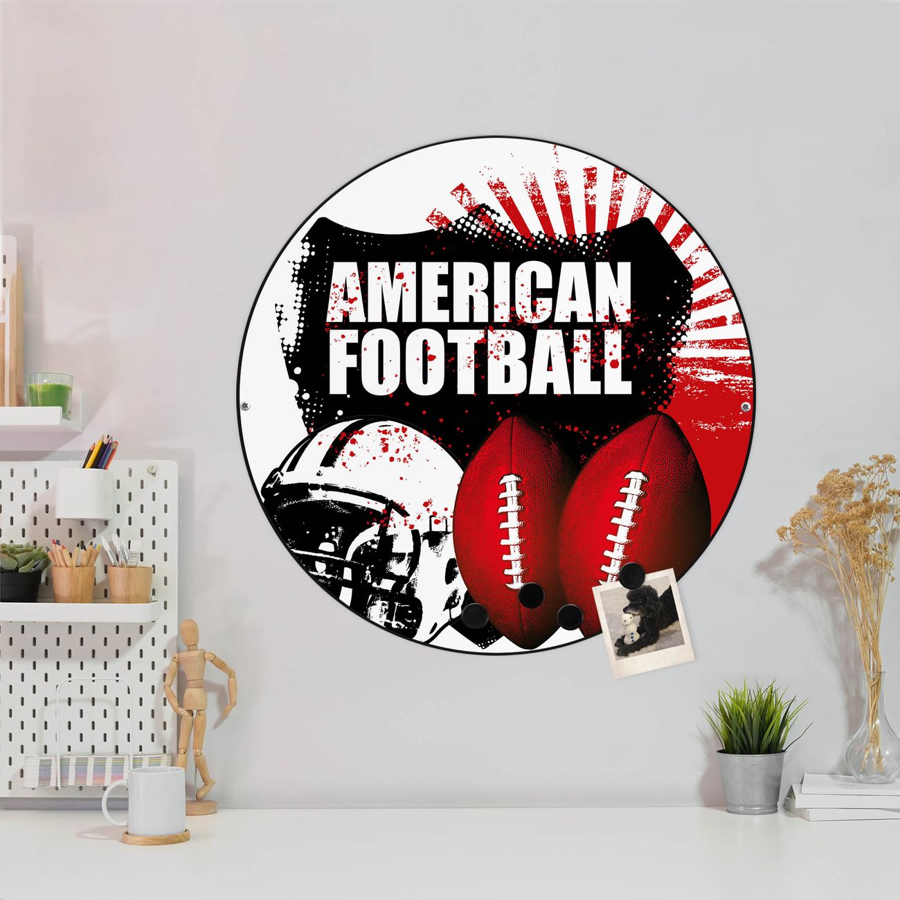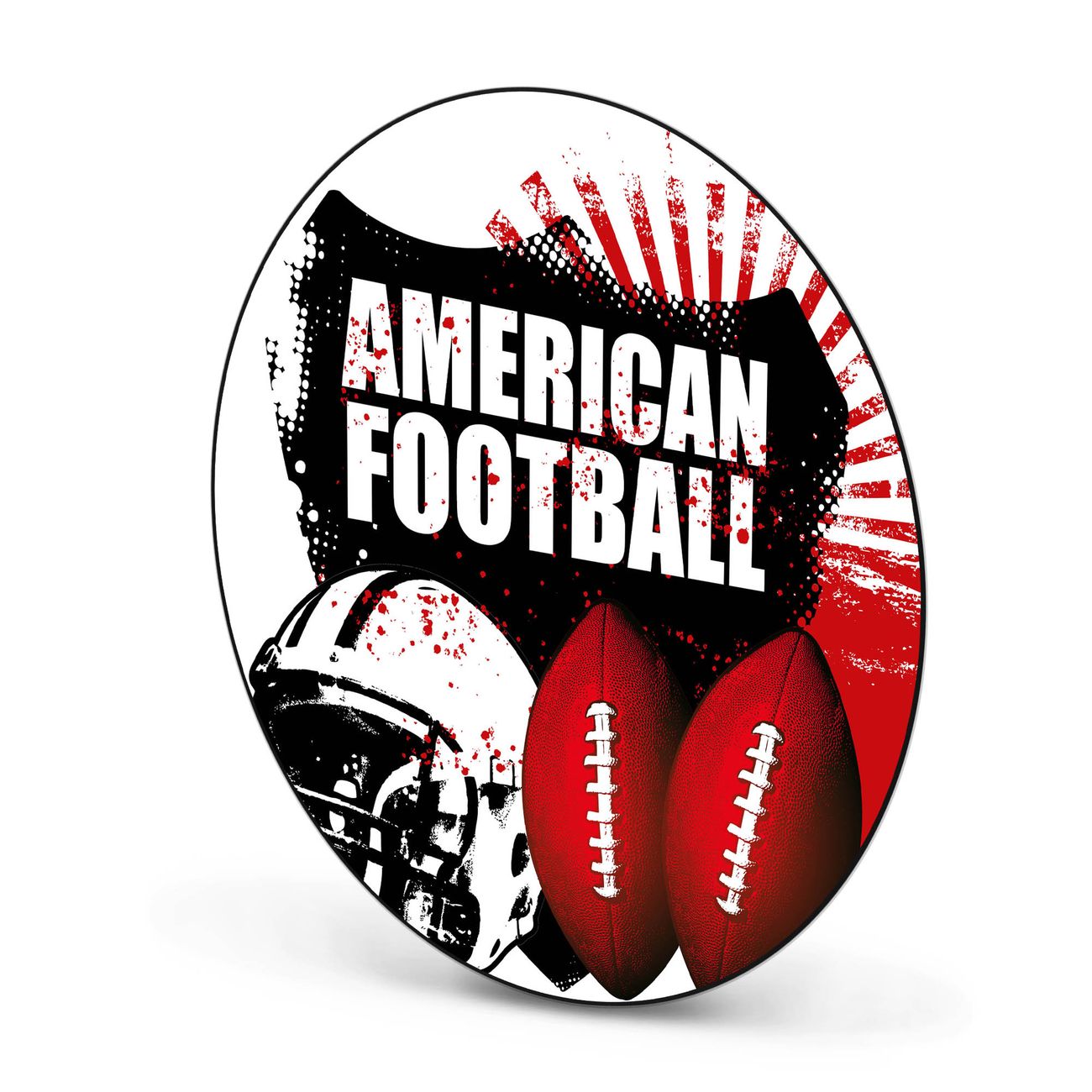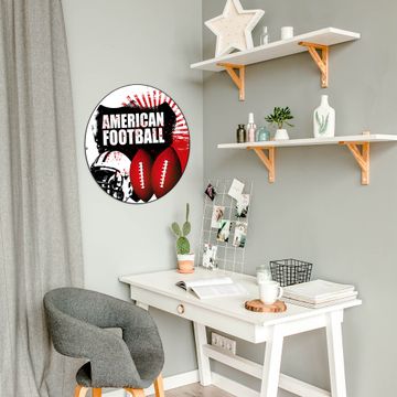 FUNKTION / DESIGN Die banjado Magnettafel mit dem Motiv Motiv American Football bringt Ordnung in Ihr Zettelchaos. Fotos, Termine, Notizen oder Rezepte lassen Sich hier stilvoll mit Magneten ordnen, Sie behalten alles im Blick. Die Design Magnetwand ist beschreibbar und wieder abwischbar. Mit dieser Pinnwand haben Sie auch ohne Notizen und Magneten ein schönes Dekoelement. Das Format bietet Ihnen ausreichend Platz um alle wichtigen Informationen im Blick zu behalten. DETAILS / NUTZEN Die magnetische Metall Pinnwand besteht aus schwarz lackiertem Stahl. Sie hat einen Durchmesser von 47cm. Es befinden sich an den Seiten zwei vorgefertigte Löcher die eine schnelle und unkomplizierte Anbringung ermöglichen. Das Motiv ist mit einem seidenmatten Laminat versehen und schützt so zusätzlich vor Kratzern. Es halten alle handelsüblichen Magneten daran. Wir sind ein kleines Team aus dem Herzen von Sachsen. Wir fertigen alle Artikel von Hand für Sie an, Sie erhalten keine preiswerte Importware. Auf Wunsch können Sie auch Ihr eigenes Foto auf die Magnettafel aufbringen, schreiben Sie uns an.