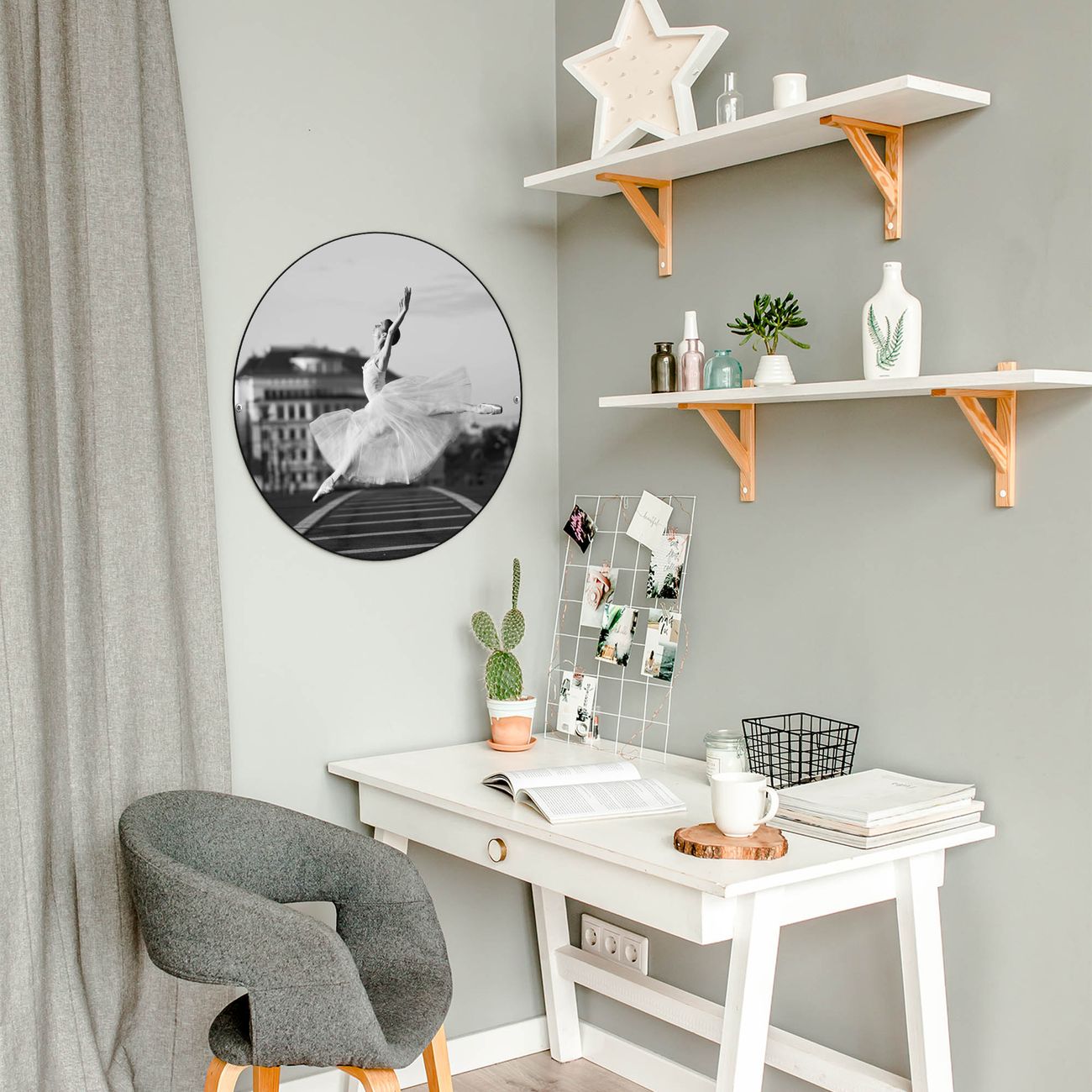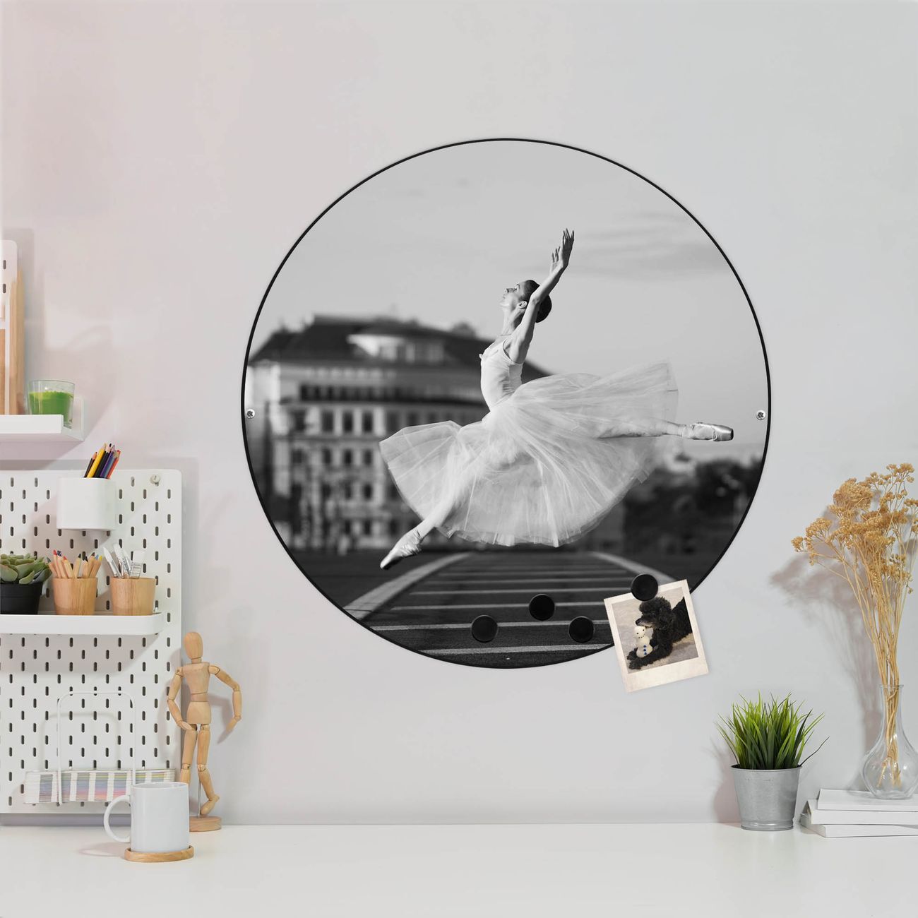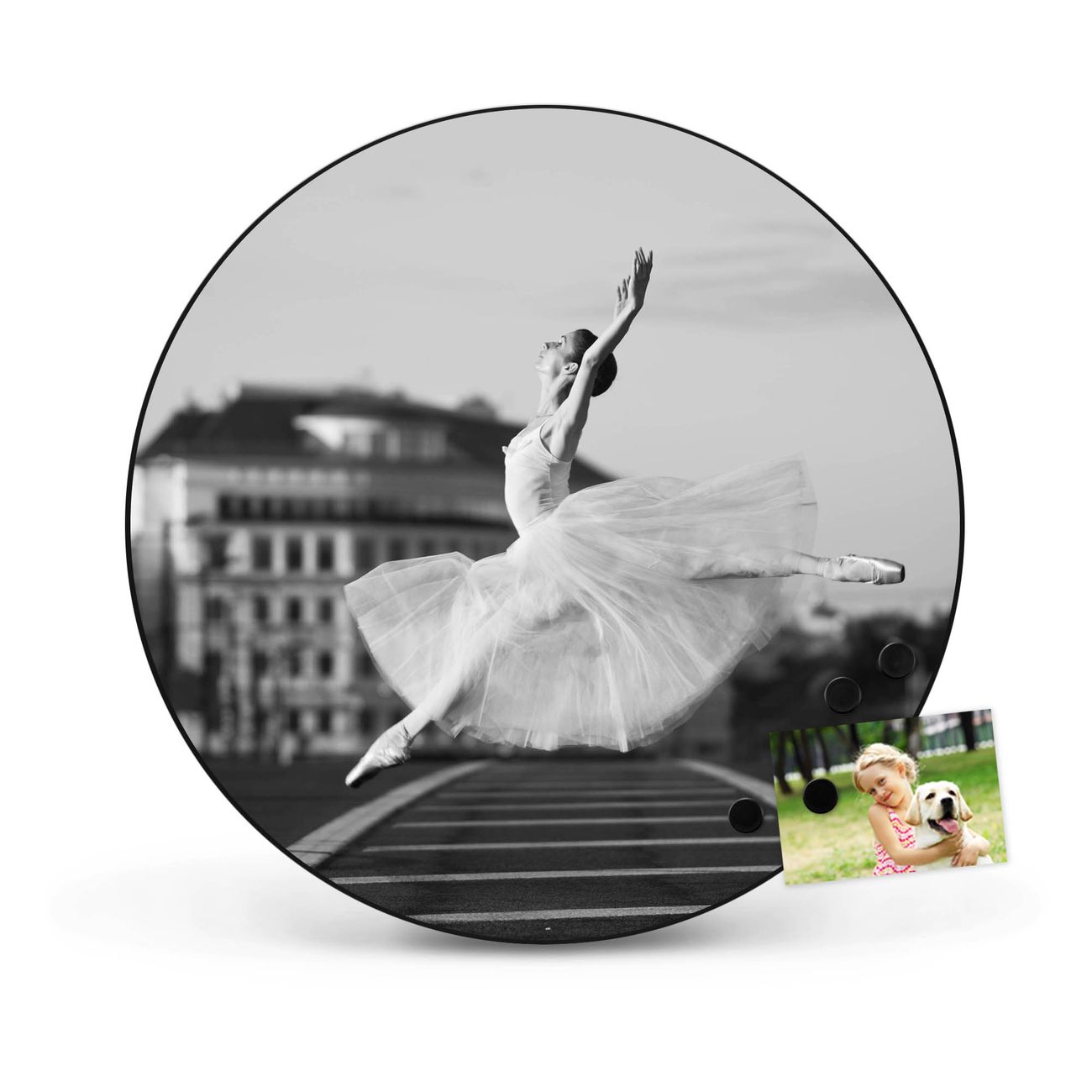FUNKTION / DESIGN Die banjado Magnettafel mit dem Motiv Motiv Ballerina In Moskau bringt Ordnung in Ihr Zettelchaos. Fotos, Termine, Notizen oder Rezepte lassen Sich hier stilvoll mit Magneten ordnen, Sie behalten alles im Blick. Die Design Magnetwand ist beschreibbar und wieder abwischbar. Mit dieser Pinnwand haben Sie auch ohne Notizen und Magneten ein schönes Dekoelement. Das Format bietet Ihnen ausreichend Platz um alle wichtigen Informationen im Blick zu behalten. DETAILS / NUTZEN Die magnetische Metall Pinnwand besteht aus schwarz lackiertem Stahl. Sie hat einen Durchmesser von 47cm. Es befinden sich an den Seiten zwei vorgefertigte Löcher die eine schnelle und unkomplizierte Anbringung ermöglichen. Das Motiv ist mit einem seidenmatten Laminat versehen und schützt so zusätzlich vor Kratzern. Es halten alle handelsüblichen Magneten daran. Wir sind ein kleines Team aus dem Herzen von Sachsen. Wir fertigen alle Artikel von Hand für Sie an, Sie erhalten keine preiswerte Importware. Auf Wunsch können Sie auch Ihr eigenes Foto auf die Magnettafel aufbringen, schreiben Sie uns an.