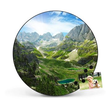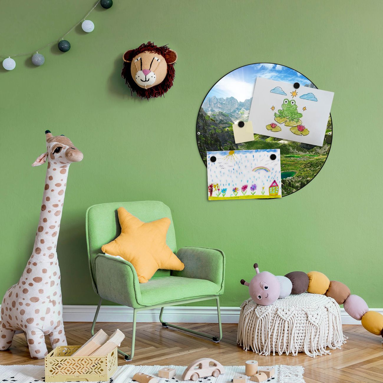 FUNKTION / DESIGN Die banjado Magnettafel mit dem Motiv Motiv Bergsee Alpen bringt Ordnung in Ihr Zettelchaos. Fotos, Termine, Notizen oder Rezepte lassen Sich hier stilvoll mit Magneten ordnen, Sie behalten alles im Blick. Die Design Magnetwand ist beschreibbar und wieder abwischbar. Mit dieser Pinnwand haben Sie auch ohne Notizen und Magneten ein schönes Dekoelement. Das Format bietet Ihnen ausreichend Platz um alle wichtigen Informationen im Blick zu behalten. DETAILS / NUTZEN Die magnetische Metall Pinnwand besteht aus schwarz lackiertem Stahl. Sie hat einen Durchmesser von 47cm. Es befinden sich an den Seiten zwei vorgefertigte Löcher die eine schnelle und unkomplizierte Anbringung ermöglichen. Das Motiv ist mit einem seidenmatten Laminat versehen und schützt so zusätzlich vor Kratzern. Es halten alle handelsüblichen Magneten daran. Wir sind ein kleines Team aus dem Herzen von Sachsen. Wir fertigen alle Artikel von Hand für Sie an, Sie erhalten keine preiswerte Importware. Auf Wunsch können Sie auch Ihr eigenes Foto auf die Magnettafel aufbringen, schreiben Sie uns an.