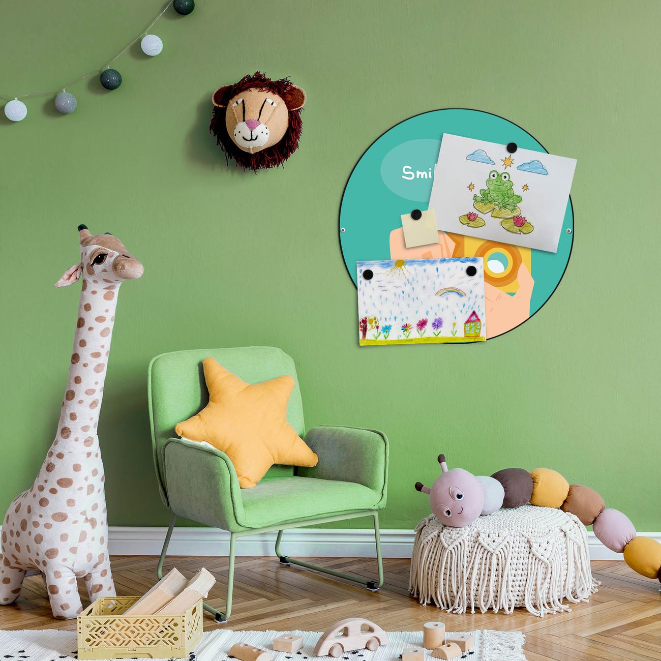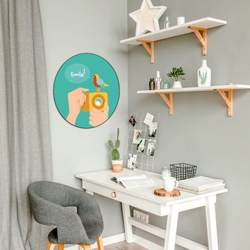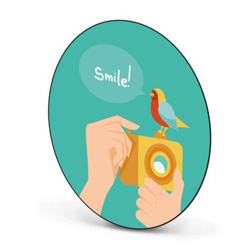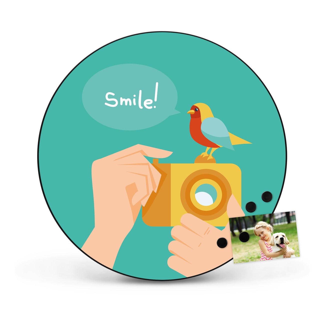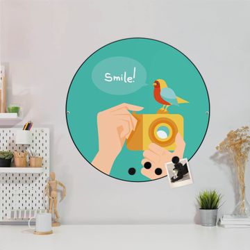 FUNKTION / DESIGN Die banjado Magnettafel mit dem Motiv Motiv Bitte Lächeln 2 bringt Ordnung in Ihr Zettelchaos. Fotos, Termine, Notizen oder Rezepte lassen Sich hier stilvoll mit Magneten ordnen, Sie behalten alles im Blick. Die Design Magnetwand ist beschreibbar und wieder abwischbar. Mit dieser Pinnwand haben Sie auch ohne Notizen und Magneten ein schönes Dekoelement. Das Format bietet Ihnen ausreichend Platz um alle wichtigen Informationen im Blick zu behalten. DETAILS / NUTZEN Die magnetische Metall Pinnwand besteht aus schwarz lackiertem Stahl. Sie hat einen Durchmesser von 47cm. Es befinden sich an den Seiten zwei vorgefertigte Löcher die eine schnelle und unkomplizierte Anbringung ermöglichen. Das Motiv ist mit einem seidenmatten Laminat versehen und schützt so zusätzlich vor Kratzern. Es halten alle handelsüblichen Magneten daran. Wir sind ein kleines Team aus dem Herzen von Sachsen. Wir fertigen alle Artikel von Hand für Sie an, Sie erhalten keine preiswerte Importware. Auf Wunsch können Sie auch Ihr eigenes Foto auf die Magnettafel aufbringen, schreiben Sie uns an.