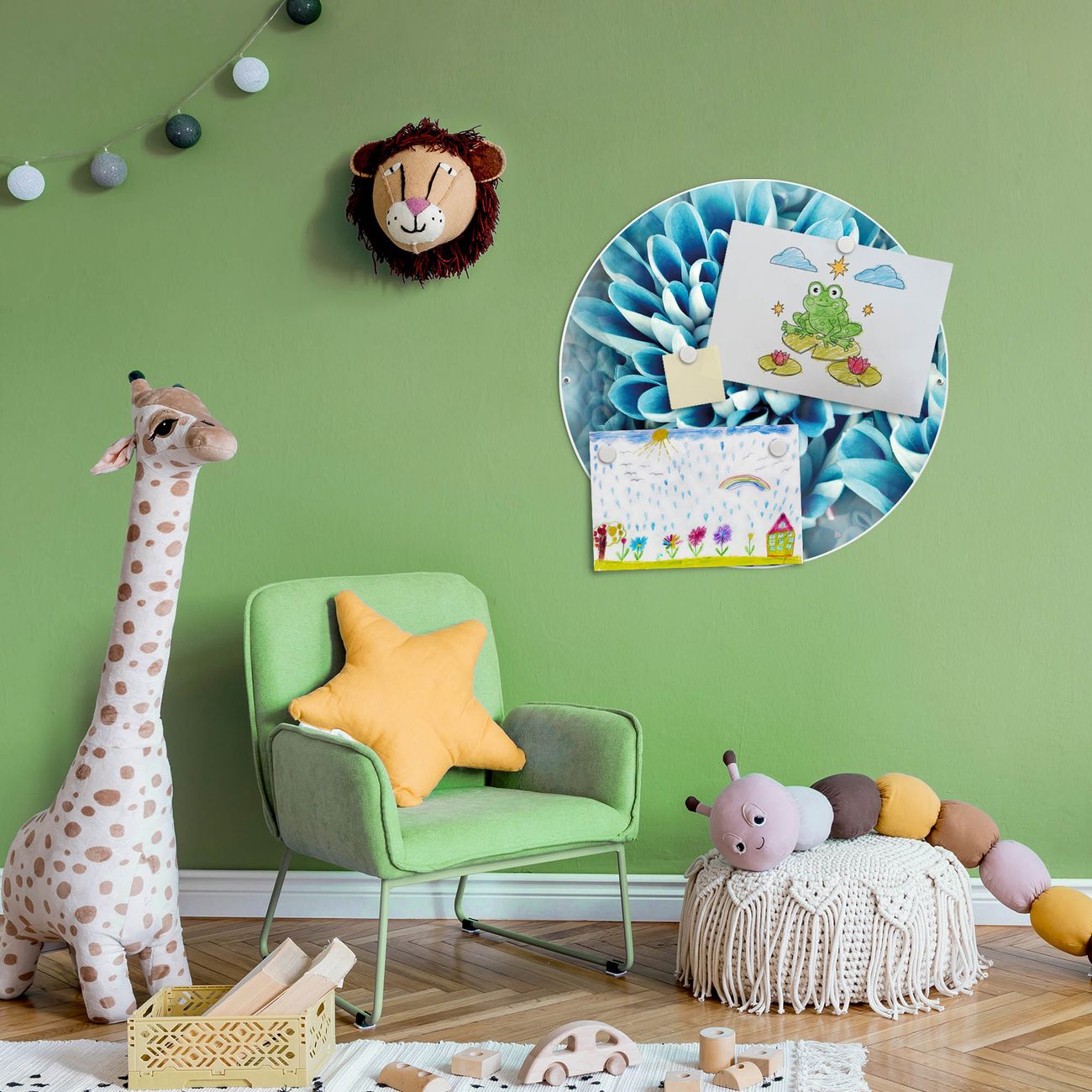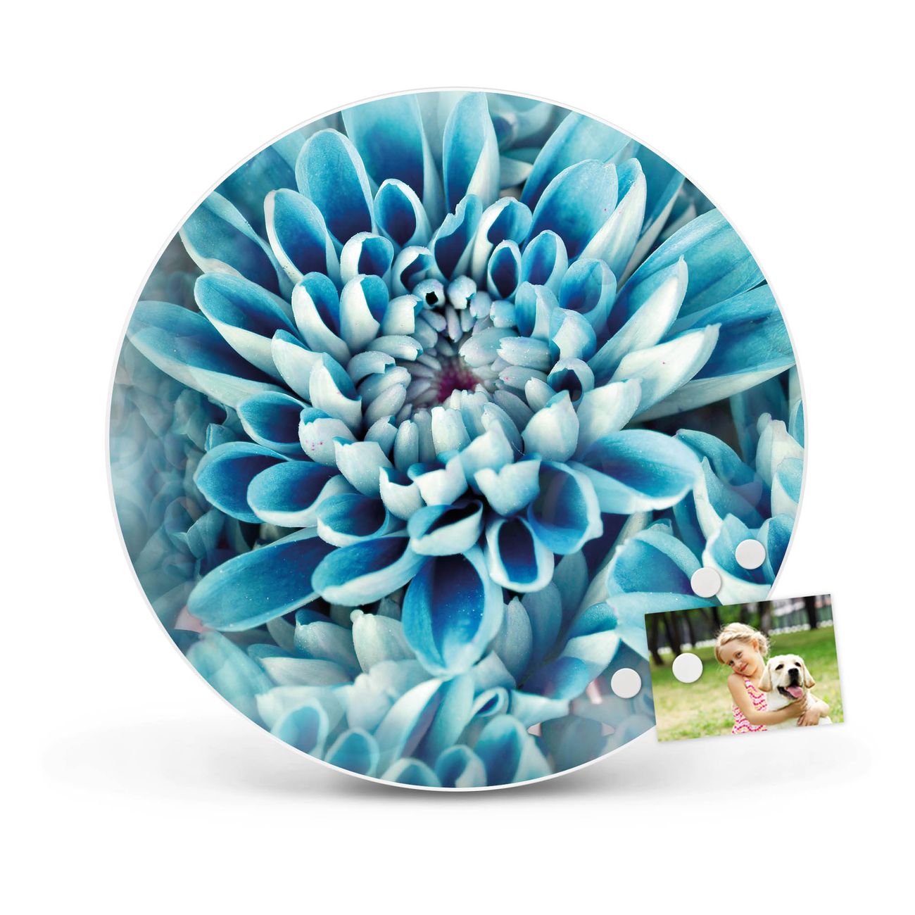 FUNKTION / DESIGN Die banjado Magnettafel mit dem Motiv Motiv Blaue Blüten bringt Ordnung in Ihr Zettelchaos. Fotos, Termine, Notizen oder Rezepte lassen Sich hier stilvoll mit Magneten ordnen, Sie behalten alles im Blick. Die Design Magnetwand ist beschreibbar und wieder abwischbar. Mit dieser Pinnwand haben Sie auch ohne Notizen und Magneten ein schönes Dekoelement. Das Format bietet Ihnen ausreichend Platz um alle wichtigen Informationen im Blick zu behalten. DETAILS / NUTZEN Die magnetische Metall Pinnwand besteht aus weiß lackiertem Stahl. Sie hat einen Durchmesser von 47cm. Es befinden sich an den Seiten zwei vorgefertigte Löcher die eine schnelle und unkomplizierte Anbringung ermöglichen. Das Motiv ist mit einem seidenmatten Laminat versehen und schützt so zusätzlich vor Kratzern. Es halten alle handelsüblichen Magneten daran. Wir sind ein kleines Team aus dem Herzen von Sachsen. Wir fertigen alle Artikel von Hand für Sie an, Sie erhalten keine preiswerte Importware. Auf Wunsch können Sie auch Ihr eigenes Foto auf die Magnettafel aufbringen, schreiben Sie uns an.